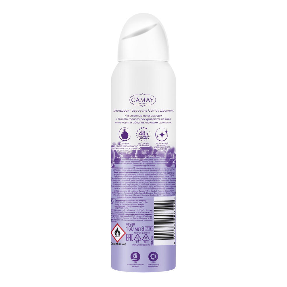 Дезодорант аэрозоль CAMAY «Dramatique» – это роскошный волнующий аромат орхидеи и сочного граната от французских парфюмеров, который просто не может оставить равнодушным никого. Обеспечивает эффективную защиту от пота и запаха, дарит ощущение свежести, быстро впитывается и не оставляет следов на одежде. Работает на протяжении 48 часов.