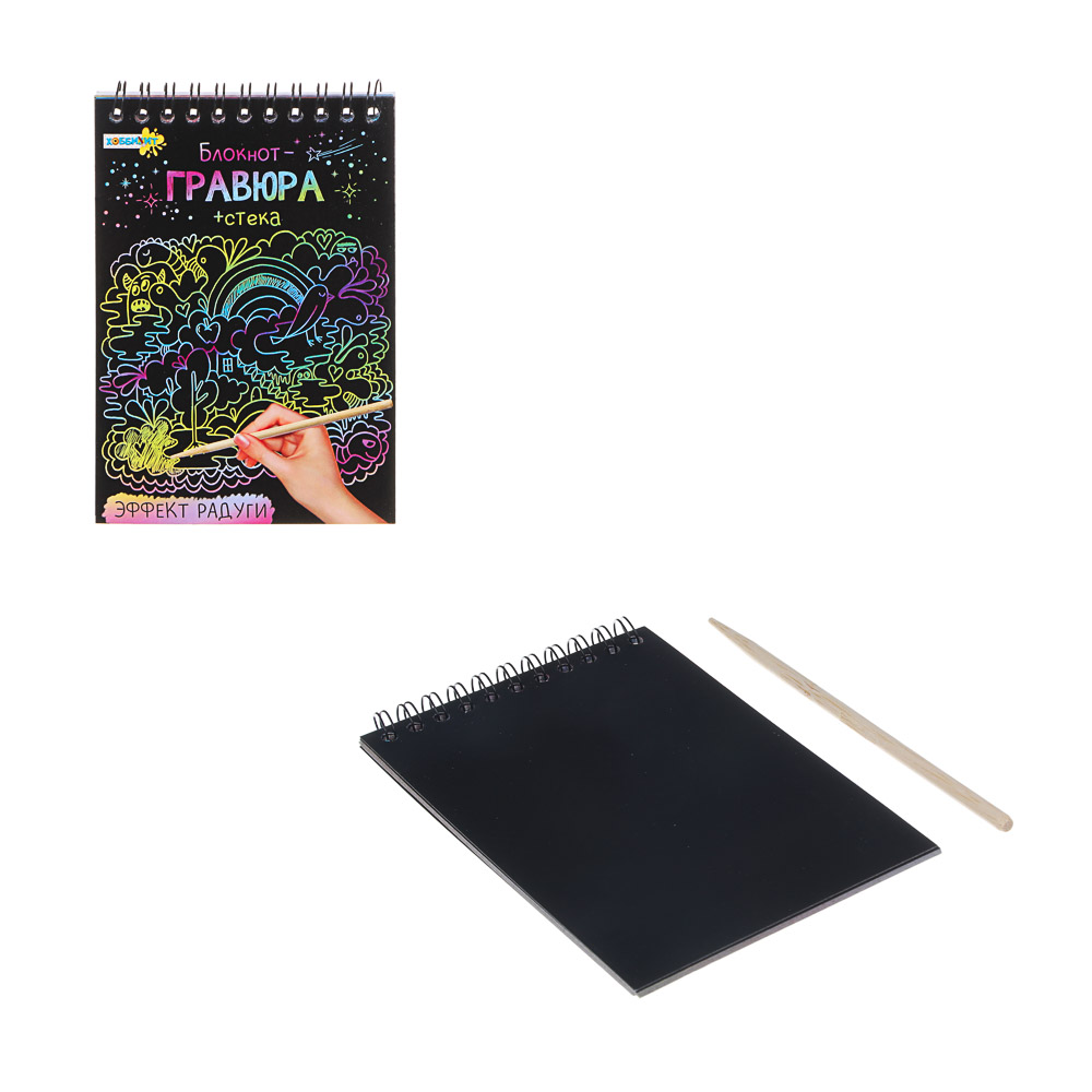 Видите только черный фон? Однако под ним скрывается волшебство — яркие цветные покрытия. Возьмите бамбуковый стек и начинайте рисовать, попутно соскребая верхний темный слой. На ваших глазах будут появляться сочные линии и завитушки, которые станут частью фантастического шедевра. Блокнот-гравюра из 8 страниц позволяет творить в свое удовольствие — делать надписи, узоры и забавные картинки. Ограничить творческий потенциал может только размер листа. Преимущества блокнота-гравюры:• 8 бумажных страничек разных оттенков;• палочка для рисования;• развивает фантазию и художественные способности;• чтобы получить изображение, рисуйте по черному фону.