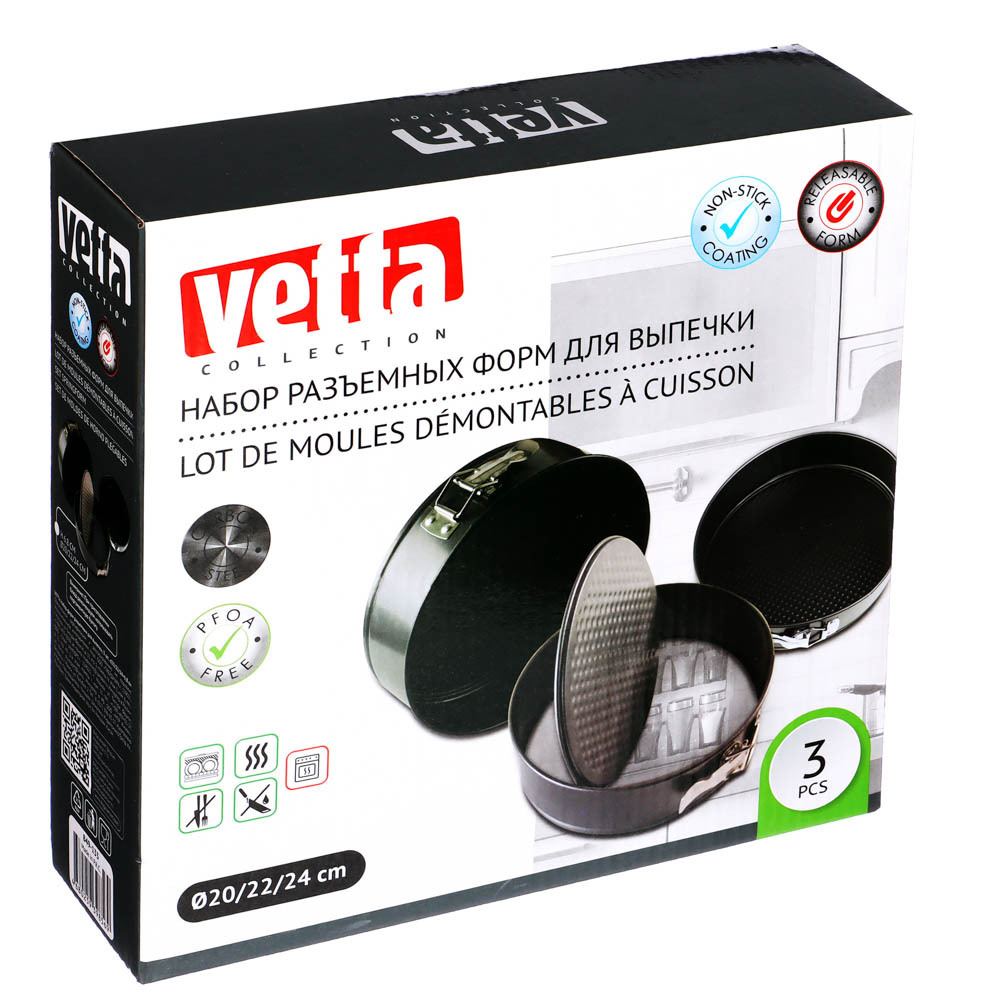 Набор из 3 разъемных форм для выпечки различного диаметра - 20см, 22см, 24см, с высотой бортика 6,5 см, изготовлены из углеродистой стали с 2-х слойным антипригарным покрытием изнутри и снаружи и предназначены для использования в духовых шкафах.