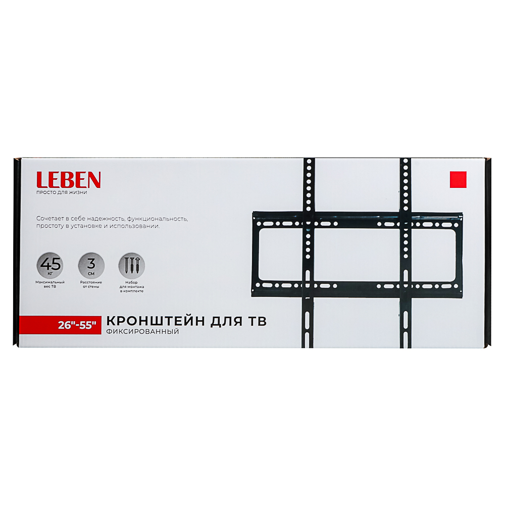 Фиксированный кронштейн Leben надежно закрепит телевизор диагональю 26-55” и весом до 45 кг. Устройство не предусматривает поворот экрана в горизонтальной и вертикальной плоскости. Материал кронштейна — высокопрочная сталь.