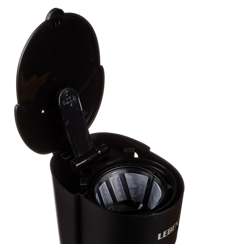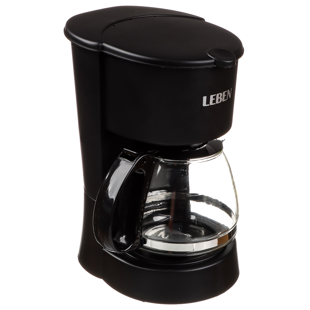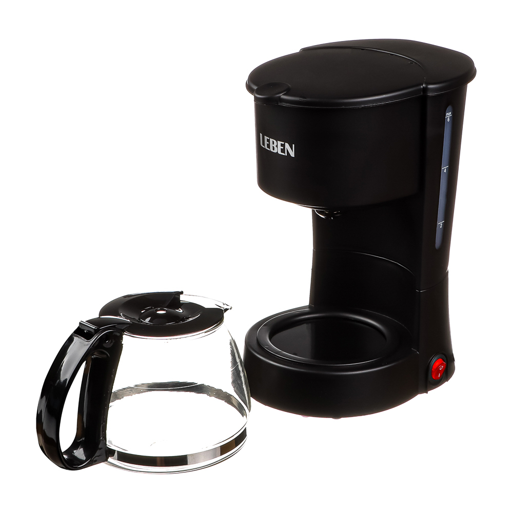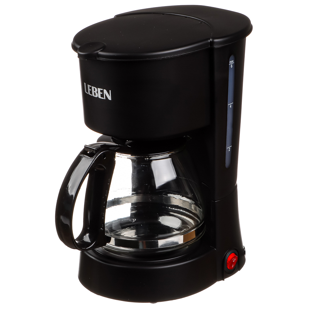 Капельная кофеварка LEBEN готовит 6 чашек ароматного кофе за 1 цикл работы. Чаша объемом 650 мл выполнена из жаропрочного стекла. Гигиеничный материал не меняет вкус напитка и не боится высоких температур. Капельная кофеварка LEBEN оснащена функцией подогрева. А это значит, что бодрящий кофе дольше остается горячим после приготовления. Чтобы вам было удобно отслеживать количество порций, резервуар для воды имеет деления.