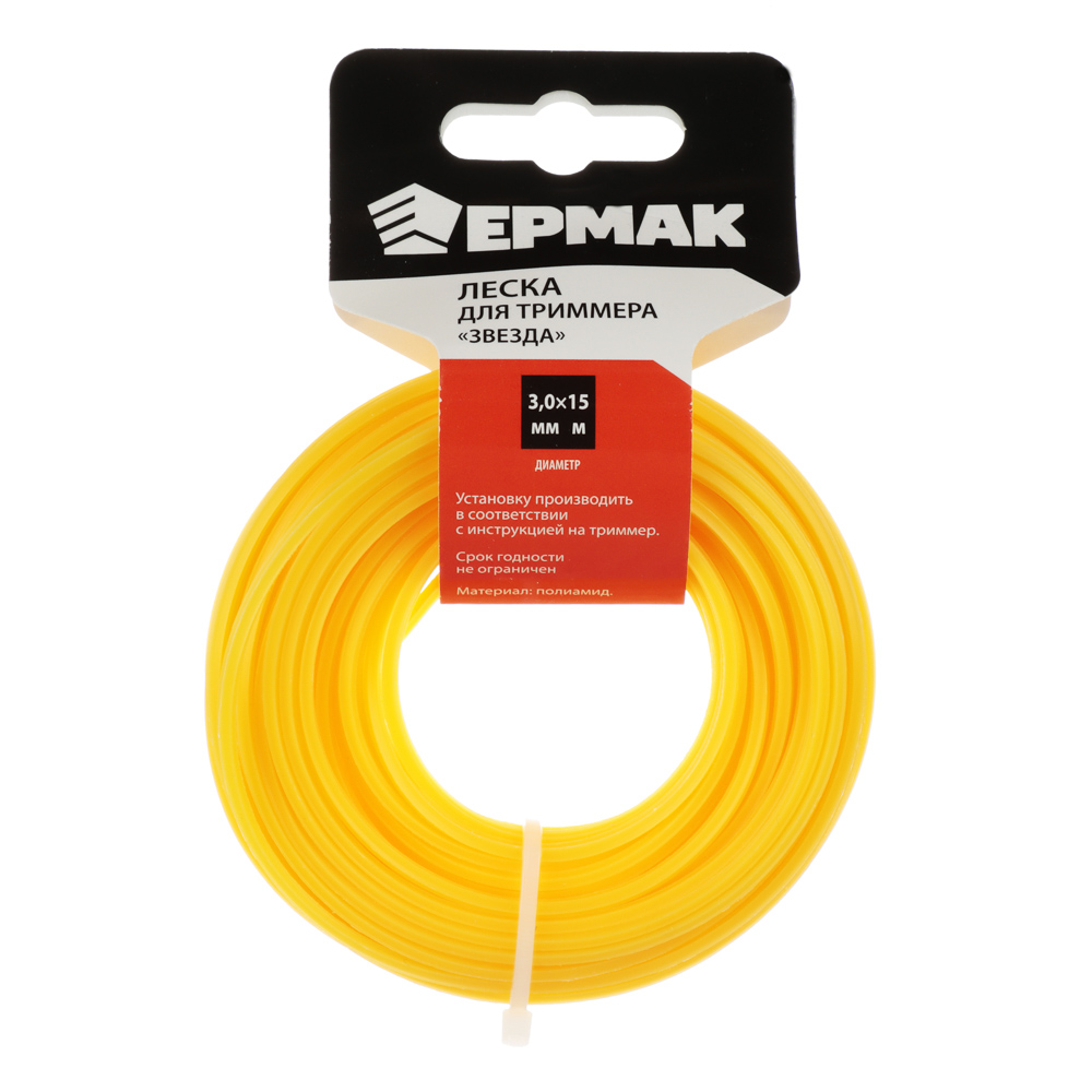 Леска для триммера ЕРМАК предназначена для кошения травы при установке в катушки триммеров (электрических и бензиновых). Нейлоновая леска ЕРМАК служит расходным материалом для электрических и бензиновых триммеров. От выбора будет зависеть результат стрижки и срок службы самого инструмента, не говоря уже о комфорте использования садового инвентаря. Важным фактором становится тип сечения струны, его выбирают в зависимости от вида травы. Звездочка, ребристая или витой квадрат. Обладает максимальной эффективностью и скоростью стрижки.