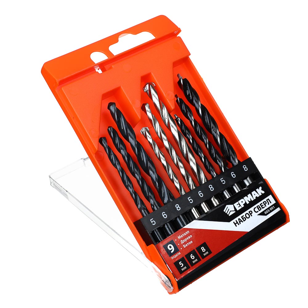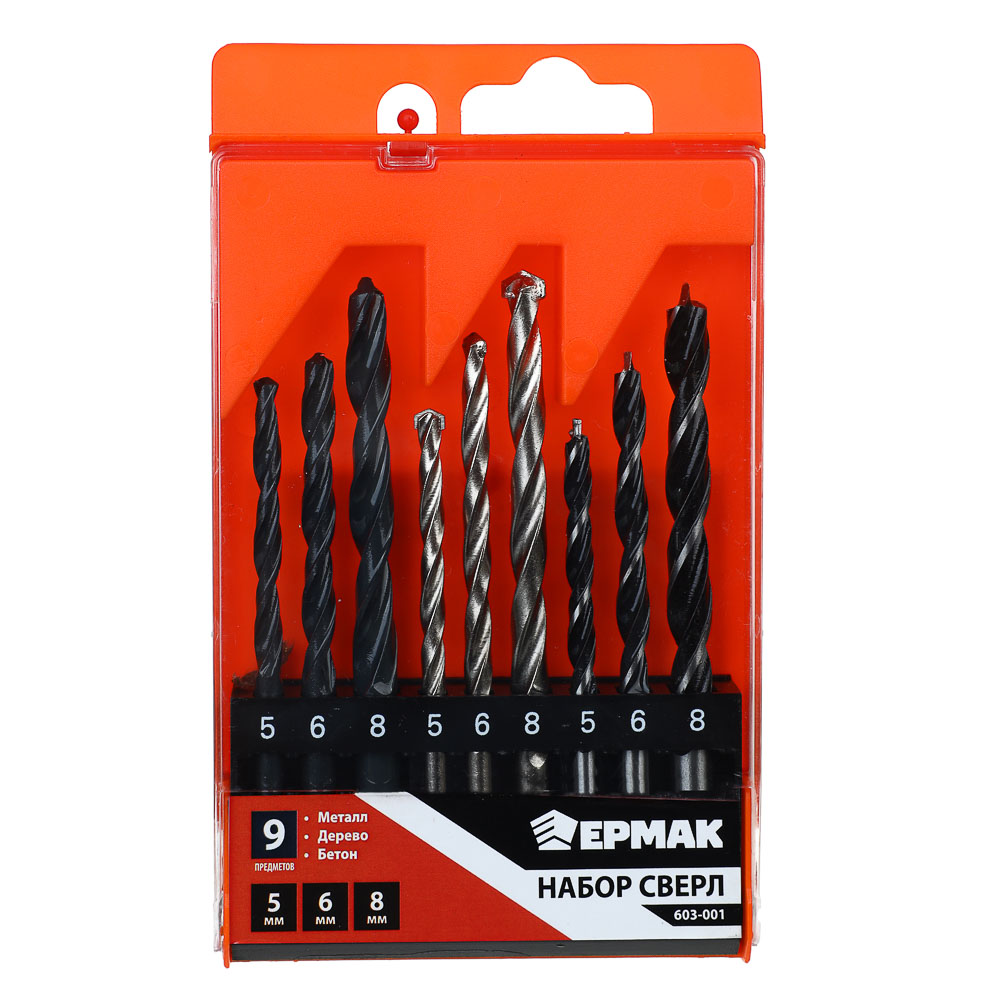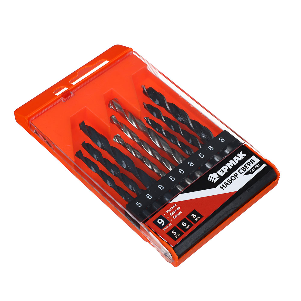 Набор сверл по бетону, дереву и металлу ЕРМАК – это универсальный комплект для любых работ. Включает 9 сверл разного диаметра. Изделия обладают высокой прочностью и ресурсом работоспособности, устойчивы к перегреву и деформации. Поставляются в удобном пластиковом чехле с маркировкой размеров. Разный цвет и материал покрытия позволяет быстро подобрать оснастку для нужного типа работ.