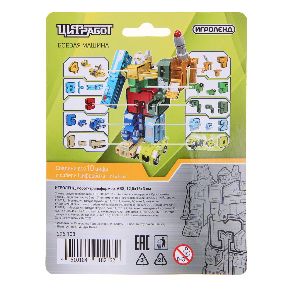Трансформер в виде цифр - это настоящий цифровой переворот в мире трансформеров! Любая цифра за считаные минуты трансформируется из супер-транспорта в ту или иную цифру! Проявив смекалку, ребенок сможет самостоятельно собирать и разбирать сколько угодно раз робота-трансформера. В процессе игры ребенок развивает мелкую моторику, пространственное и образное мышление, тренирует воображение, а также игрушка дает первые представления о математике и числах.