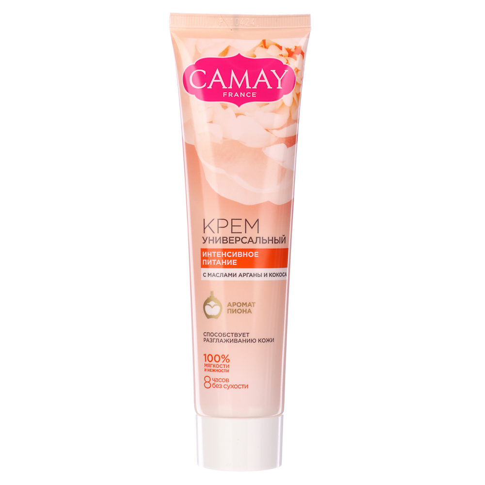Универсальный крем CAMAY в тубе объемом 110 мл – это приятная текстура, деликатный цветочный аромат, отсутствие ощущения липкости, 100 процентов мягкости и нежности и 8 часов увлажнения. Крем «Интенсивное питание» с маслами арганы и кокоса с ароматом пиона способствует разглаживанию и омоложению кожи. Крем «Интенсивное увлажнение» с витамином E и пептидами с ароматом розы способствует сохранению влаги в коже и защищает от вредных внешних факторов. Крем «Интенсивное восстановление» с пантенолом и ароматом ириса обладает успокаивающим эффектом и быстро залечивает мелкие воспаления и ранки на коже.
