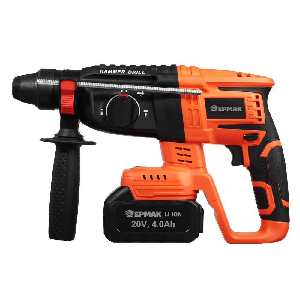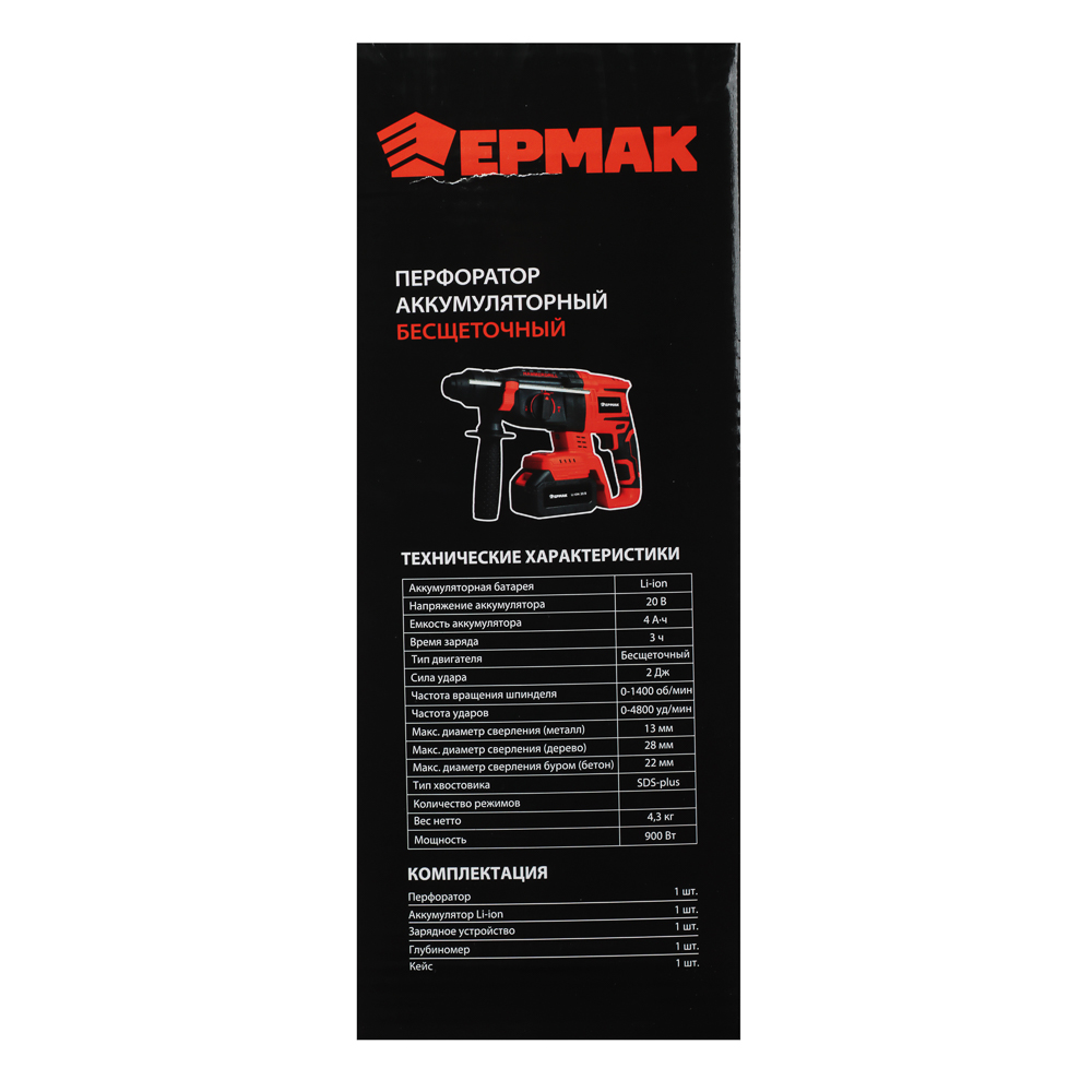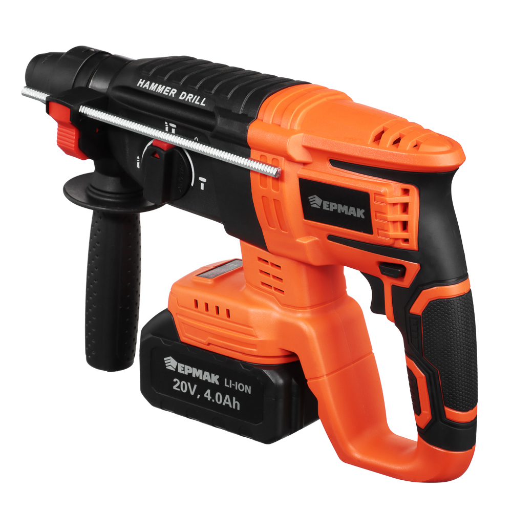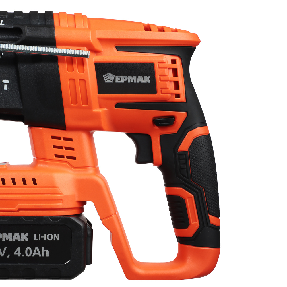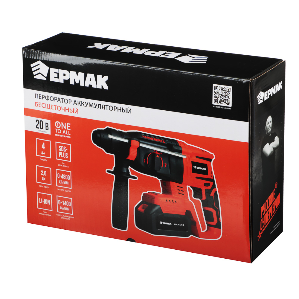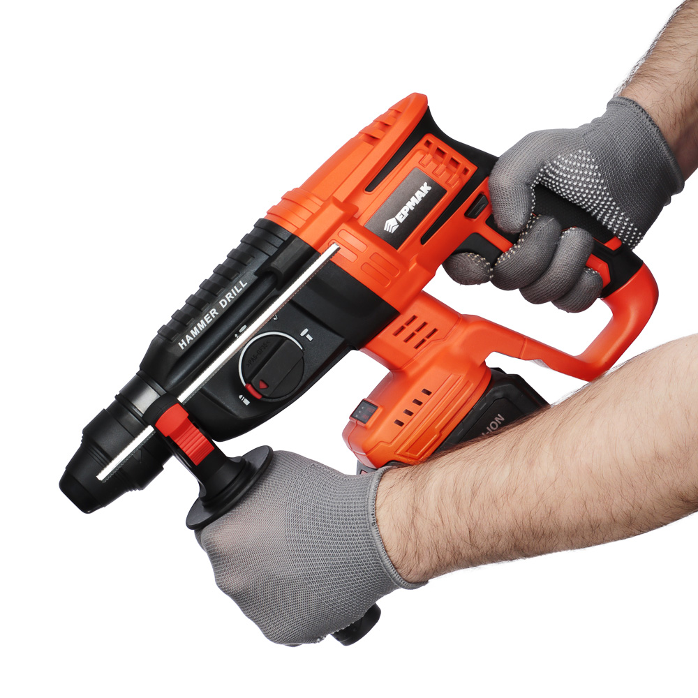 Аккумуляторный бесщёточный перфоратор ЕРМАК с напряжением 20 В – это мощный и надежный электроинструмент для строительства и ремонта, который позволит быстро просверлить отверстия в бетоне, камне или кирпиче под дюбель. Компактный, достаточно легкий, имеет эргономичный корпус, который комфортно ложится в руку, обеспечивая максимальную точность во время сверления. Не требует подключения к электросети, поэтому его можно использовать даже на улице. Сила удара – 2.0 Дж. Частота ударов: от 0 до 4800 уд/мин. Тип хвостовика: SDS Plus. Съемный аккумулятор емкостью 4А*ч рассчитан на долгую работу и совместим со всеми моделями электроинструмента ЕРМАК, входящими в систему ONE.