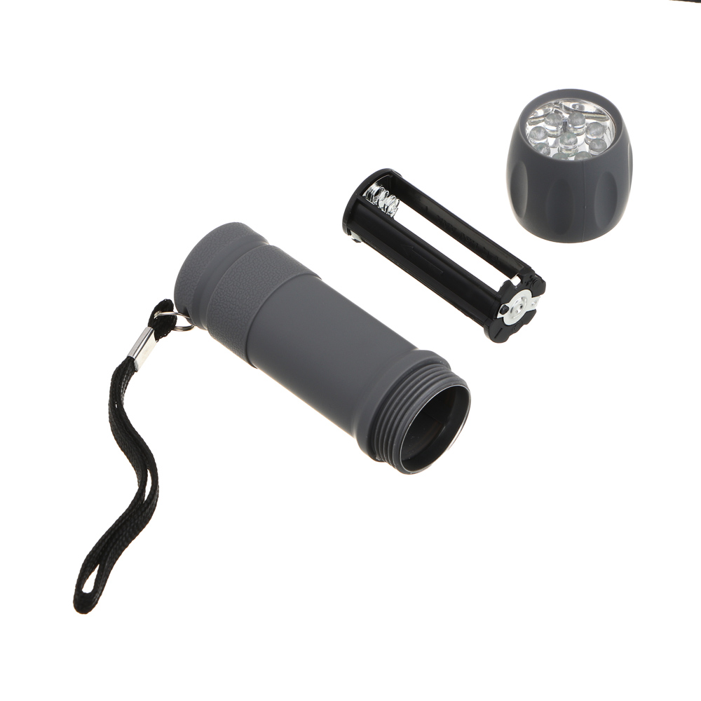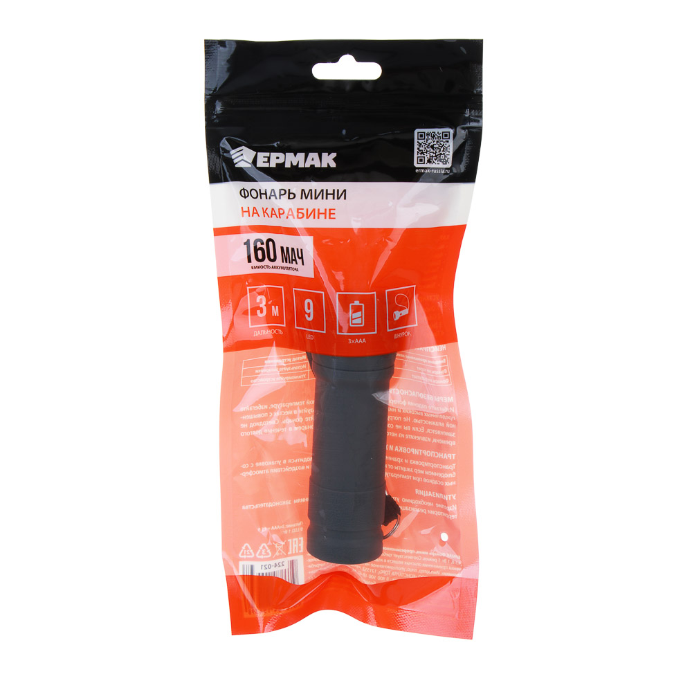 Фонарик ЕРМАК мини на шнурке с 9 LED светодиодами в корпусе с прорезиненным покрытием – незаменимый карманный аксессуар для туристических походов, вечерних прогулок, кемпинга и для бытового использования. Светит ярким равномерным рассеянным светом с максимальной дальностью 3 метра. Благодаря нескользящему покрытию фонарик надежно фиксируется в руке. Работает в 1 режиме. Элемент питания – 3 батарейки AAA-типа.