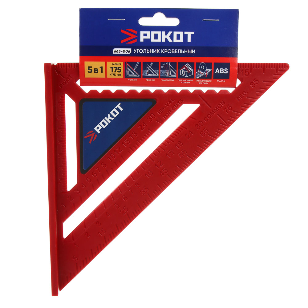 РОКОТ Угольник кровельный 175x175 мм, пластик – универсальный инструмент, объединяющий в себе пять функций: угольник, рейсмус, транспортир, торцевой угольник и направляющий для пилы. Этот многофункциональный инструмент станет незаменимым помощником в различных строительных и ремонтных работах. Один инструмент заменяет сразу пять, что значительно экономит время и упрощает работу! Интуитивно понятные функции делают работу с угольником удобной и быстрой. Прочный пластик обеспечивает долгий срок службы даже при интенсивном использовании.