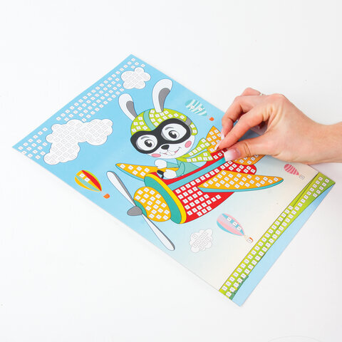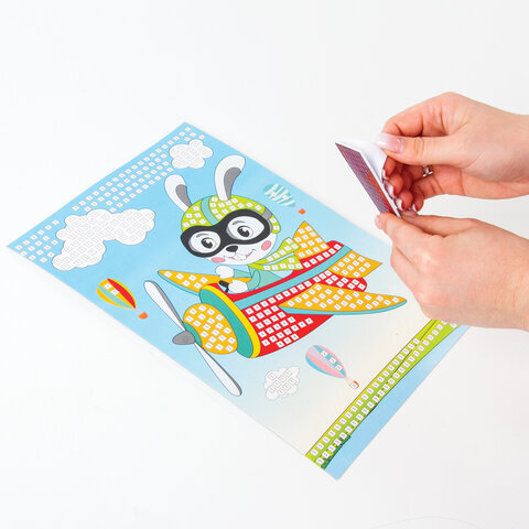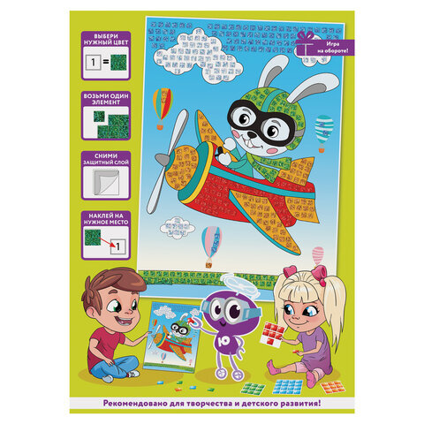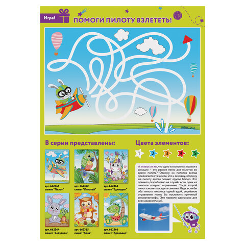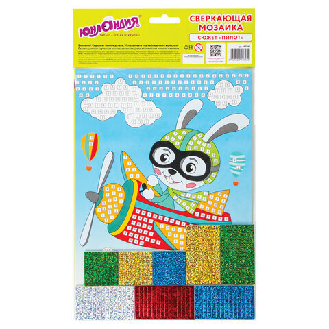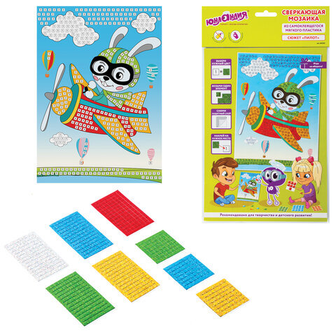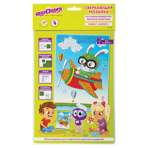 Сверкающая мозаика из мягкого пластика EVA ЮНЛАНДИЯ "Пилот" - это весёлый и занимательный способ развития мелкой моторики, аккуратности и цветового восприятия ребёнка. Все элементы в составе самоклеящиеся, для работы не требуются ножницы и клей. В набор входит яркая картонная основа размером 21х29 см с напечатанным дизайном аппликации, а также 5 листов мягкого пластика разных цветов с голографическим эффектом. Белыми пронумерованными квадратиками на картинке обозначены места, куда необходимо приклеить элементы соответствующего цвета. Схема соответствия номеров и цветов расположена на бумажном вкладыше. Сюжеты разработаны дизайнерами ЮНЛАНДИЯ специально для детей. Квадратные элементы аппликации перфорированы и имеют клеевой слой, что позволяет создать аппликацию без клея и ножниц. Набор упакован в полипропиленовый пакет с картонным европодвесом. Внутри каждого набора подарок-игра: весёлые лабиринты и другие занимательные задания от Юнландика!