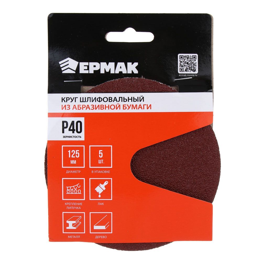 Круг шлифовальный из абразивной бумаги на велкро основе ЕРМАК без отверстий со степенью зернистости P40 диаметром 125 мм используется для черновой обработки поверхностей из металла и дерева. Подходит для снятия старого лакокрасочного покрытия. Качественный абразив имеет высокую износостойкость, бумага не рвется, что делает процесс работы максимально комфортным. Тип крепления – липучка. 5 штук в упаковке.
