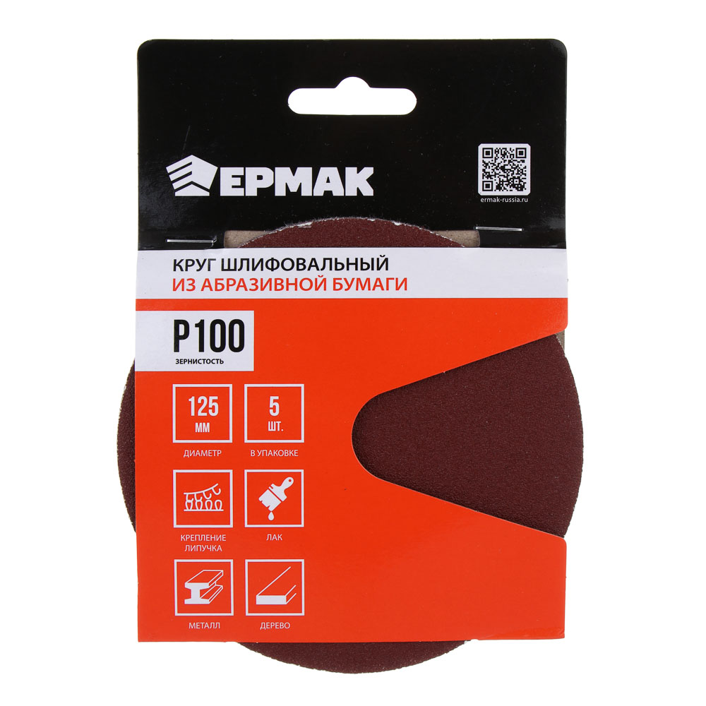 Круг шлифовальный из абразивной бумаги на велкро основе ЕРМАК без отверстий со степенью зернистости P100 диаметром 125 мм используется для черновой обработки поверхностей из металла и дерева. Подходит для снятия старого лакокрасочного покрытия. Качественный абразив имеет высокую износостойкость, бумага не рвется, что делает процесс работы максимально комфортным. Тип крепления – липучка. 5 штук в упаковке.