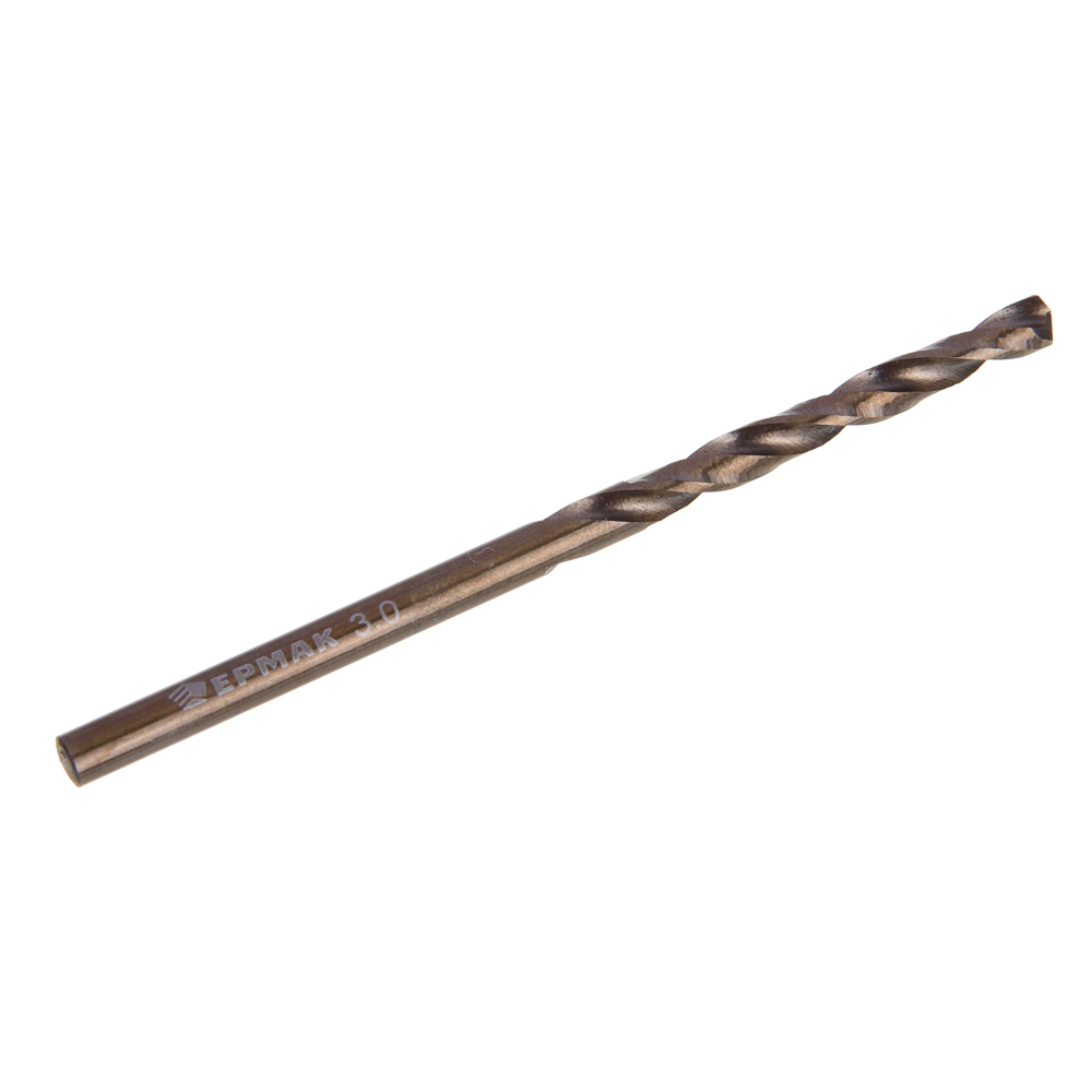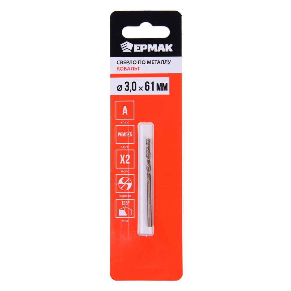 Сверло по металлу ЕРМАК «Кобальт» 3,0х61 мм класса А из стали Р6М5К5. Изделие характеризуется высокой степенью износостойкости и устойчивостью к нагреву. Угол между режущими кромками 135 градусов позволяет работать по различным металлам, включая алюминий, латунь и другие. Совместимо с любыми электроинструментами марки ЕРМАК.