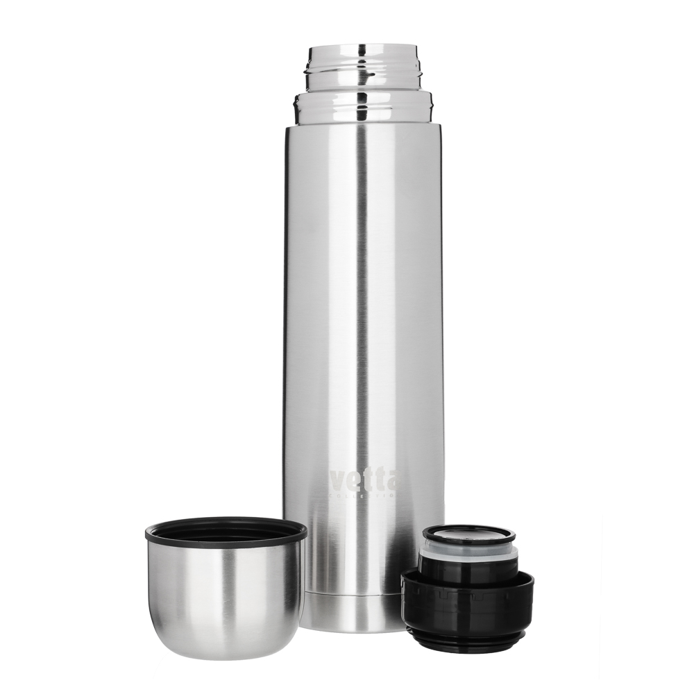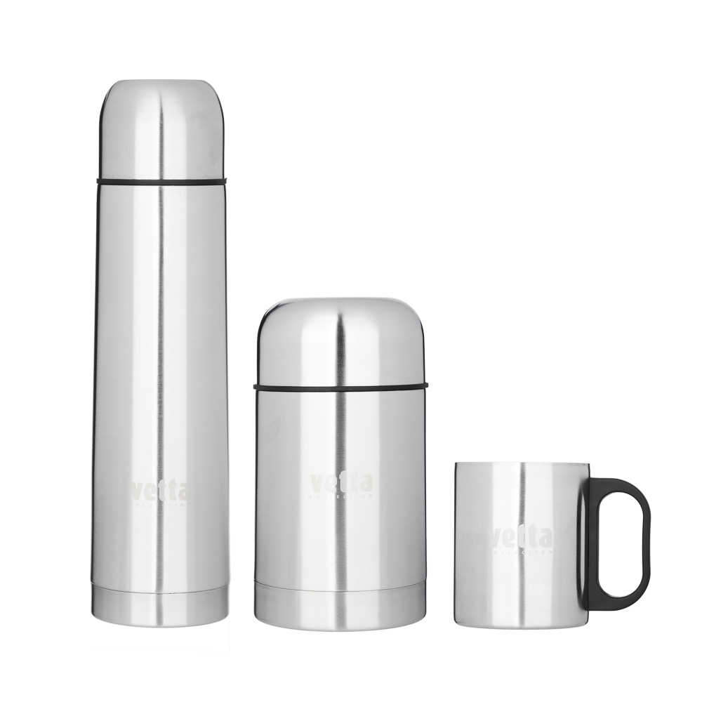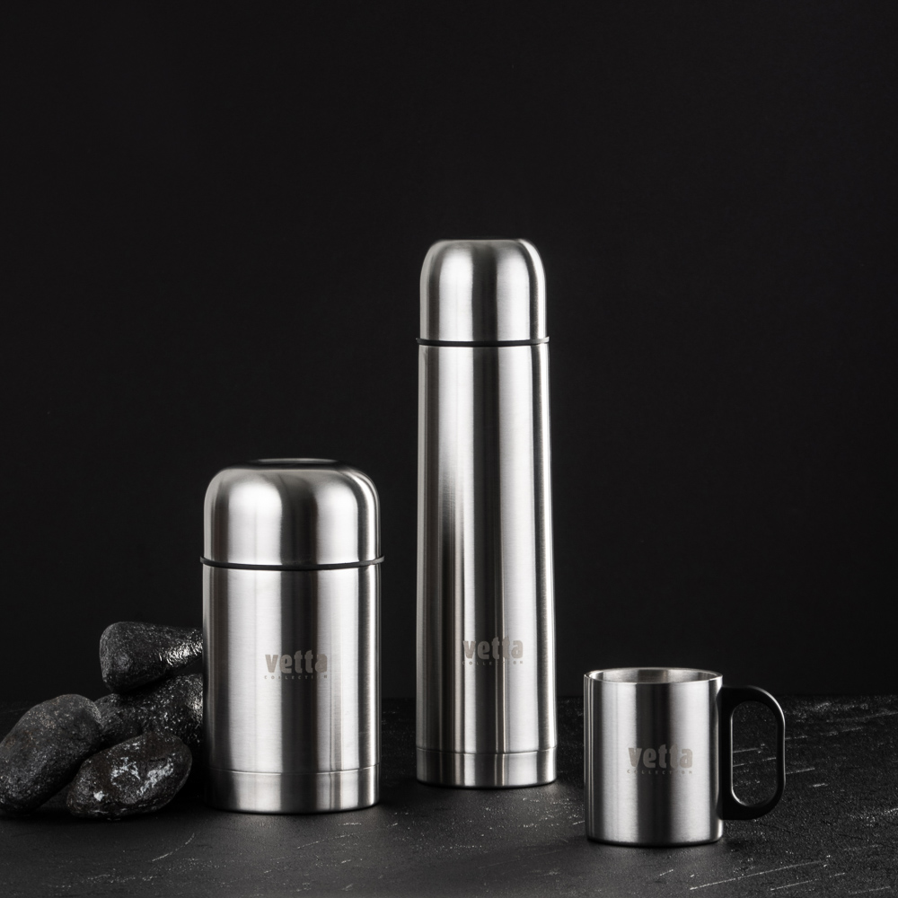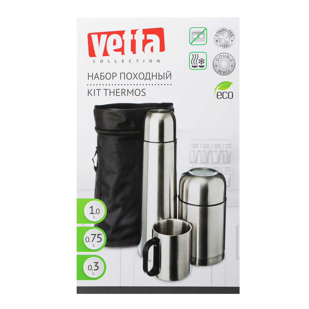 Практичный походный набор VETTA включает два термоса: термос объемом 1 л "Буллет" и суповой термос объемом 750 мл. Оба изделия выполнены из прочной нержавеющей стали с металлической колбой, что обеспечивает долговременное сохранение тепла. Термосы оснащены завинчивающейся пластиковой пробкой и крышкой для надежного использования. В комплект также входит термокружка объемом 300 мл из нержавеющей стали с удобной пластиковой ручкой. Все предметы аккуратно упакованы в стильную черную сумку, что делает этот набор идеальным для походов и путешествий.