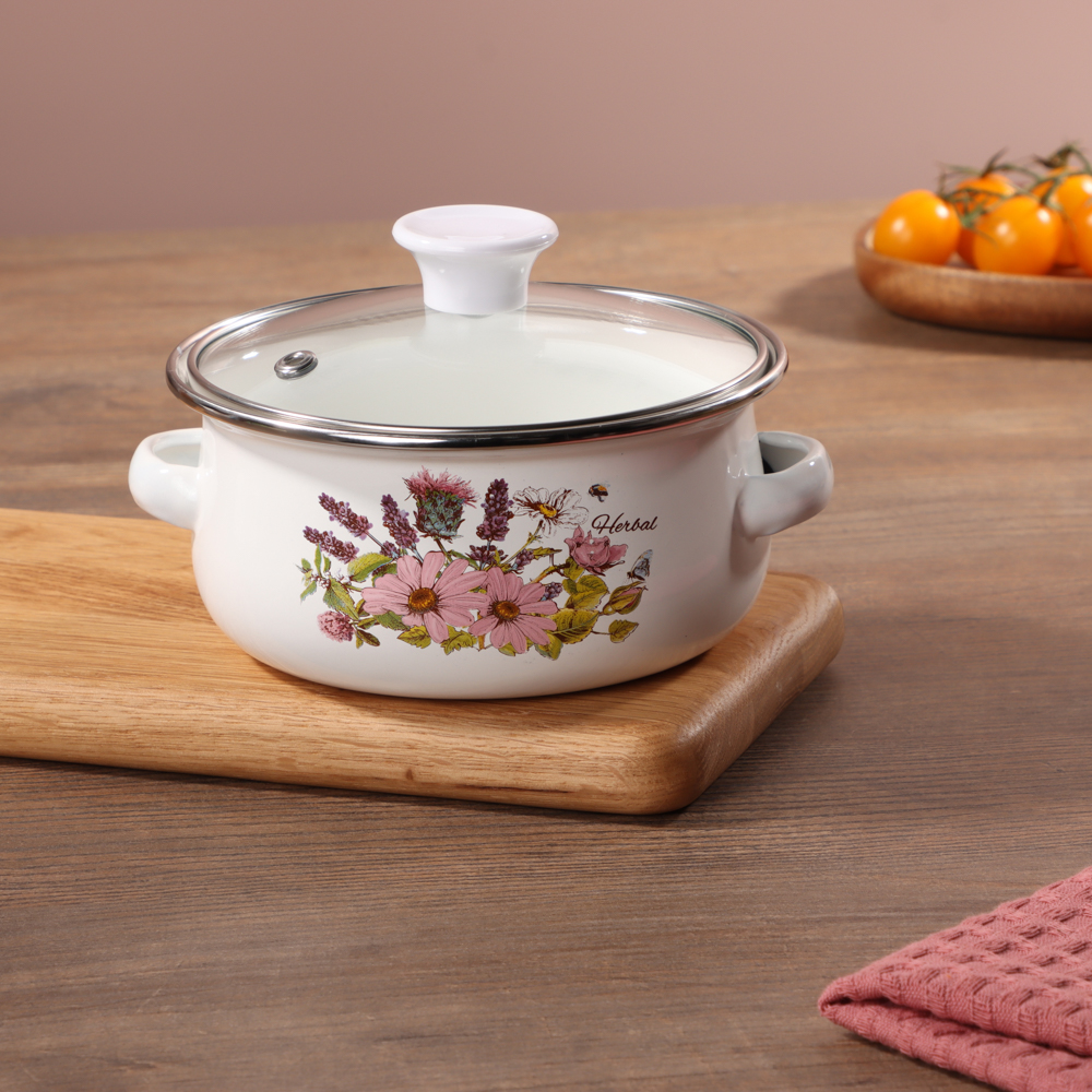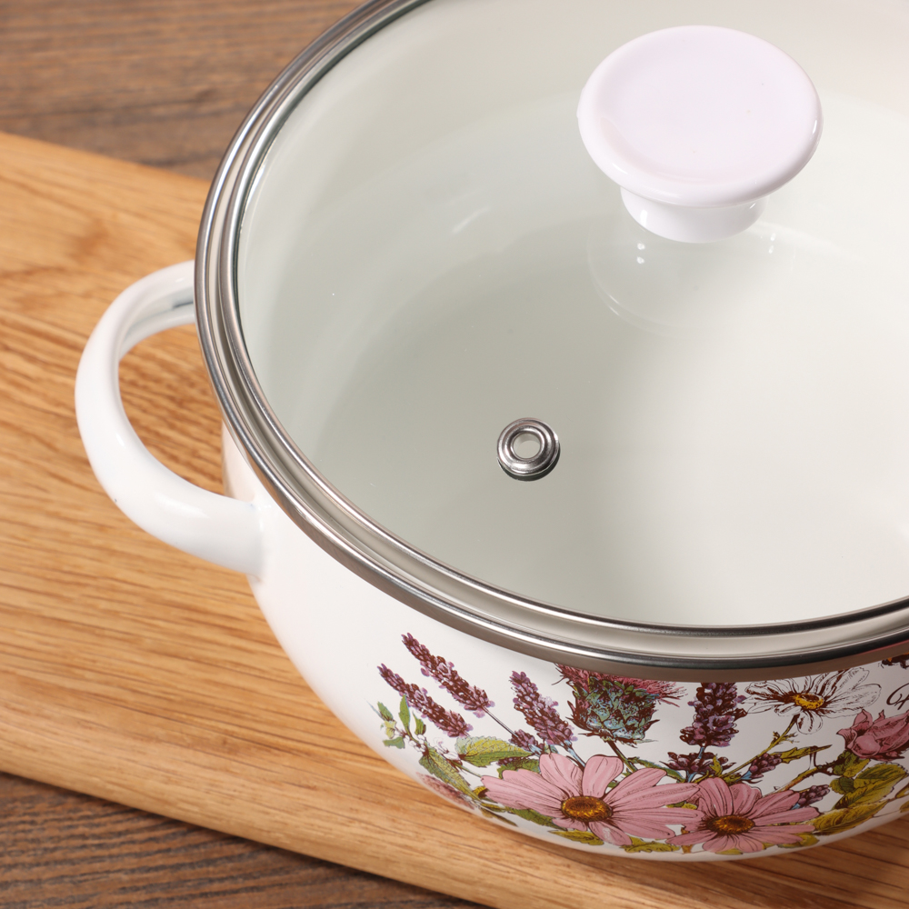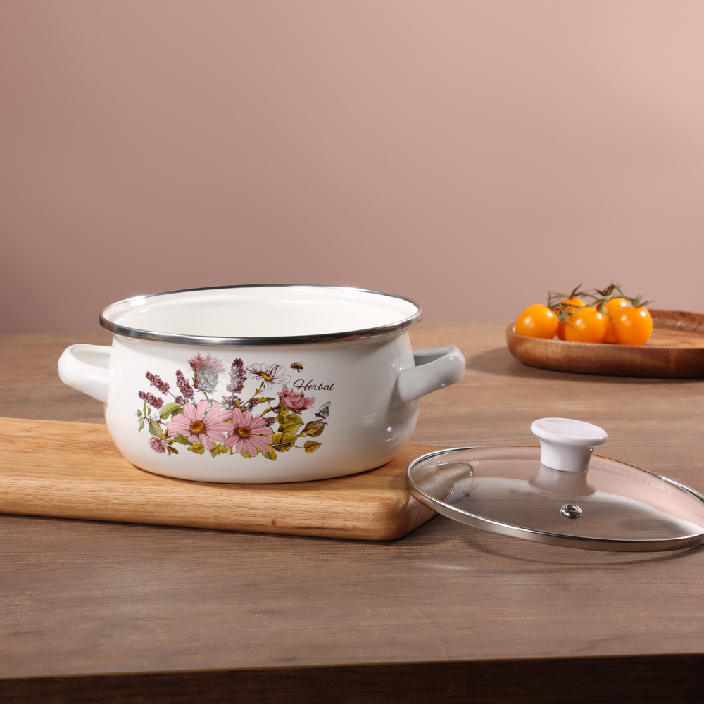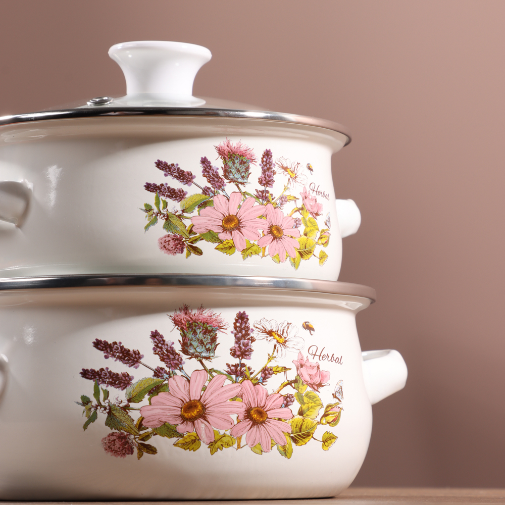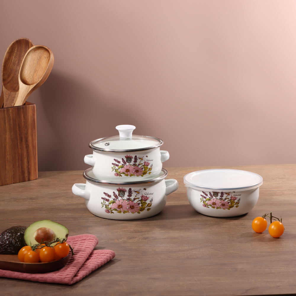 Кухонная посуда должна быть не только безопасной и крепкой, но и красивой. Набор из двух эмалированных мини-кастрюль и салатника будет ежедневно радовать глаза хозяйки и вдохновлять на приготовление новых шедевров. Эмаль — безопасный материал, который не влияет на вкус и запах пищи. Универсальный вариант для первых и вторых блюд. Идеально подходит для хранения еды в холодильнике.Преимущества:• три предмета разного объема — 0,7 и 1,1 л,• салатник с прозрачной пластиковой крышкой,• две кастрюльки с крышками из жаропрочного стекла,• материал — высокопрочная сталь,• если не хочется мыть вручную, можно доверить это дело посудомоечной машине,• посуда украшена привлекательным цветочным принтом на белом фоне.