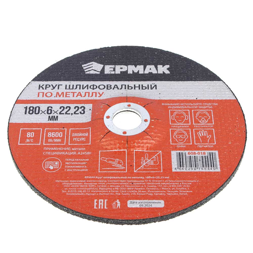Круг шлифовальный по металлу ЕРМАК размером 125х6х22,23 мм, 80 м/с предназначен для использования совместно с угловыми шлифовальными машинами с максимальной производительностью 8600 об/мин. Двойной ресурс означает высокую износостойкость, прочность и устойчивость к истиранию. Материал зерен – коричневый электрокорунд, имеет повышенную твердость и подходит для работы по различным металлам и сплавам, включая чугун и цветные металлы.