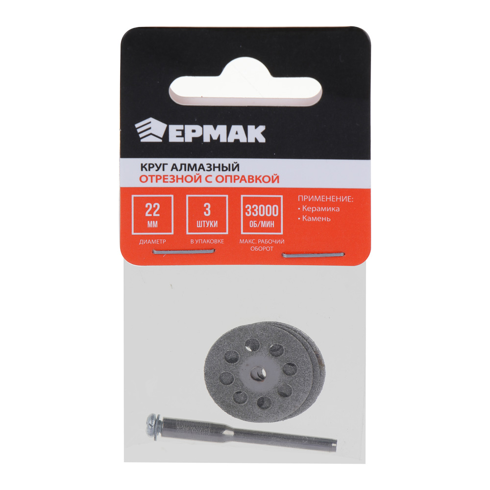 Отрезной алмазный круг ЕРМАК диаметром 22 мм с оправкой – это диск, предназначенный для резки материалов, обладающих высокой степенью твердости. Используется в качестве оснастки для электроинструмента. Точно режет керамику и камень с образованием ровной кромки. Имеет длительный ресурс службы. Максимальный рабочий оборот – 33000 оборотов в минуту. 3 штуки в комплекте.