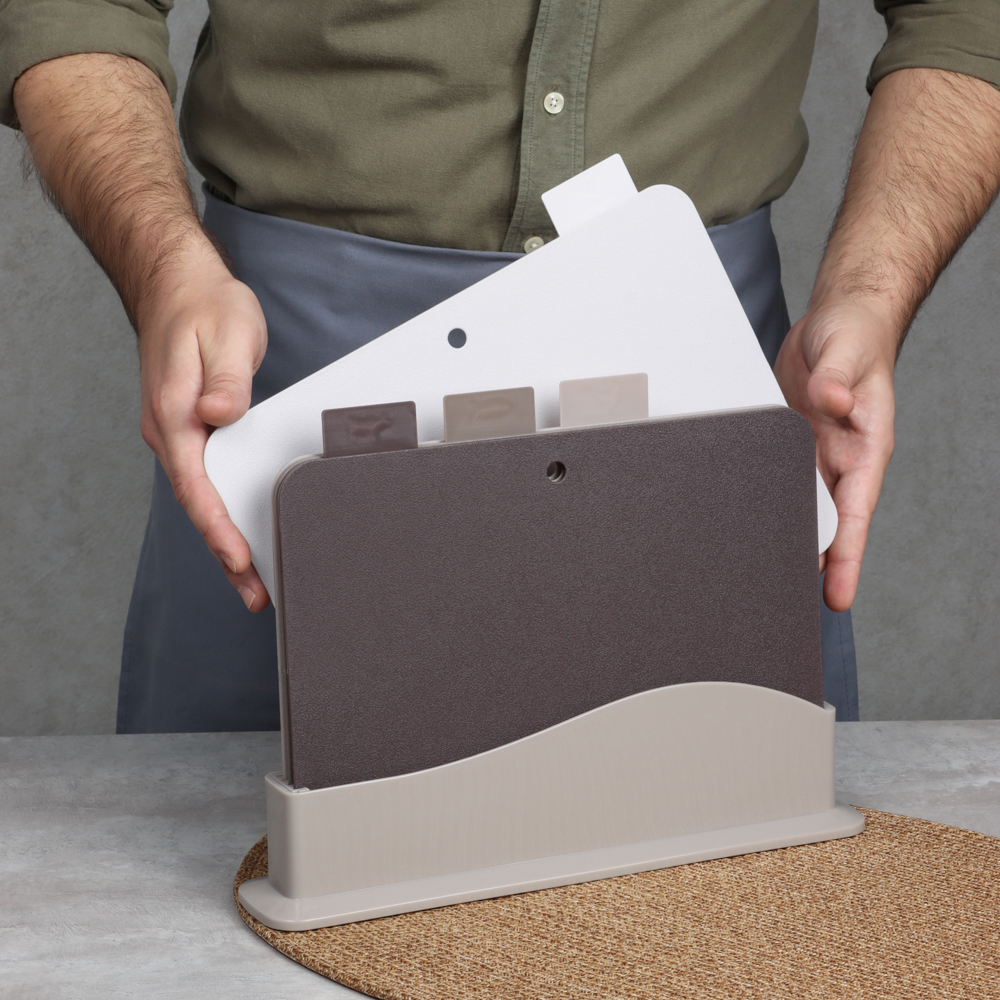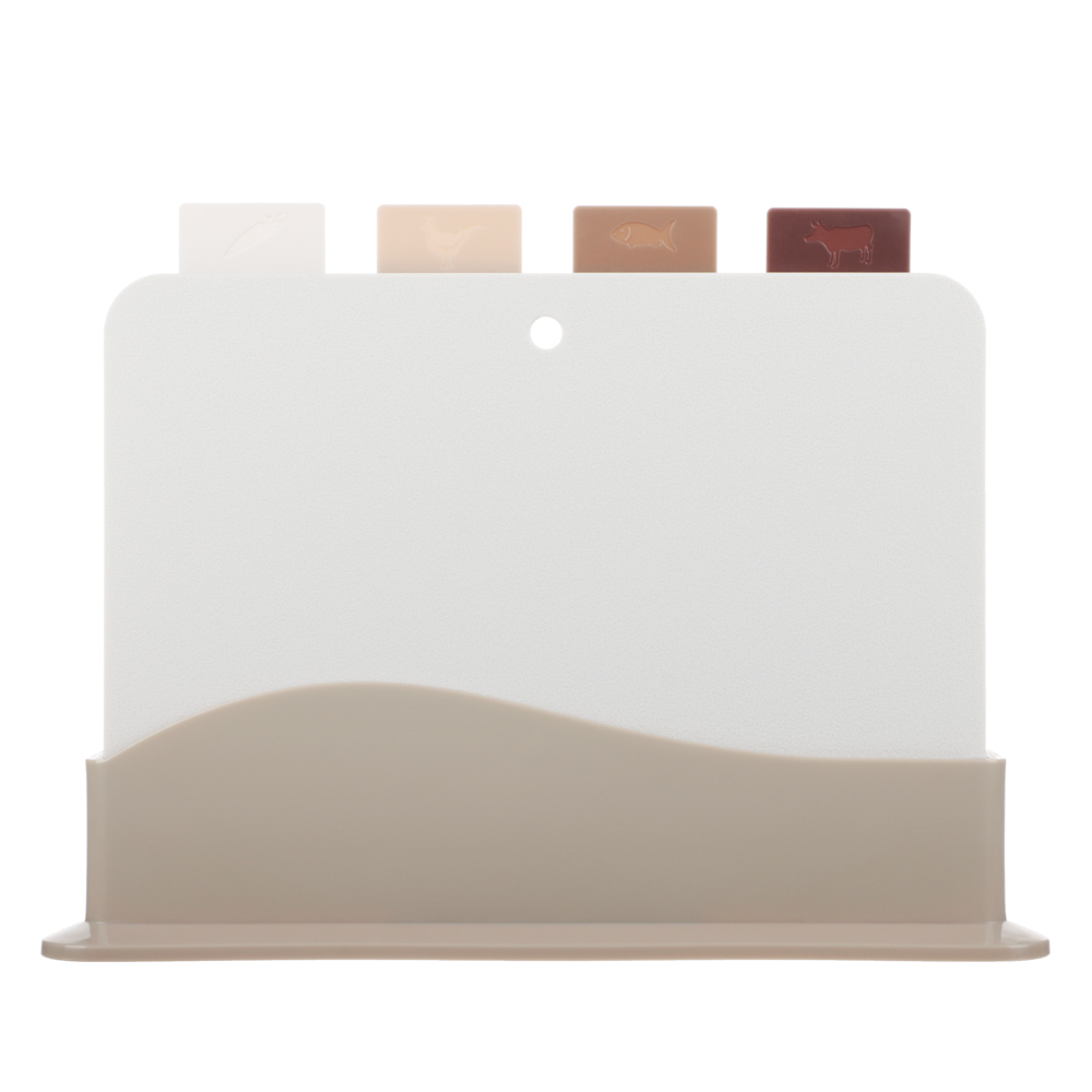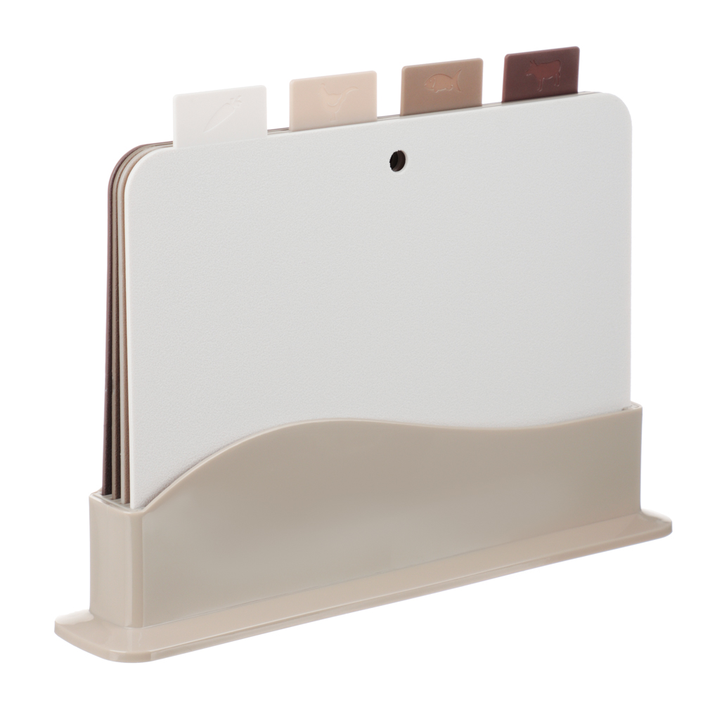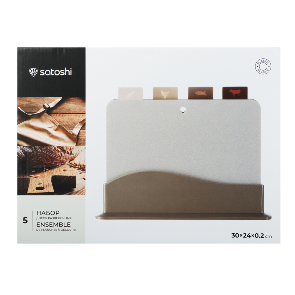 Набор разделочных досок на подставке SATOSHI из 5 предметов включает 4 пластиковые доски размером 30х24х0,2 см и устойчивую подставку. Доски имеют маркировку в виде ярлычка, за который удобно брать доску и извлекать ее из подставки. На маркировке указаны иконки с назначением каждой доски: для рыбы, мяса, овощей. Таким образом, вы не перепутаете доски, а процесс приготовления блюд будет проходить в идеальных санитарных условиях. Доски легко моются, не повреждают заточку ножей, имеют оптимальный размер. Универсальный дизайн впишется в любой интерьерный стиль кухни.
