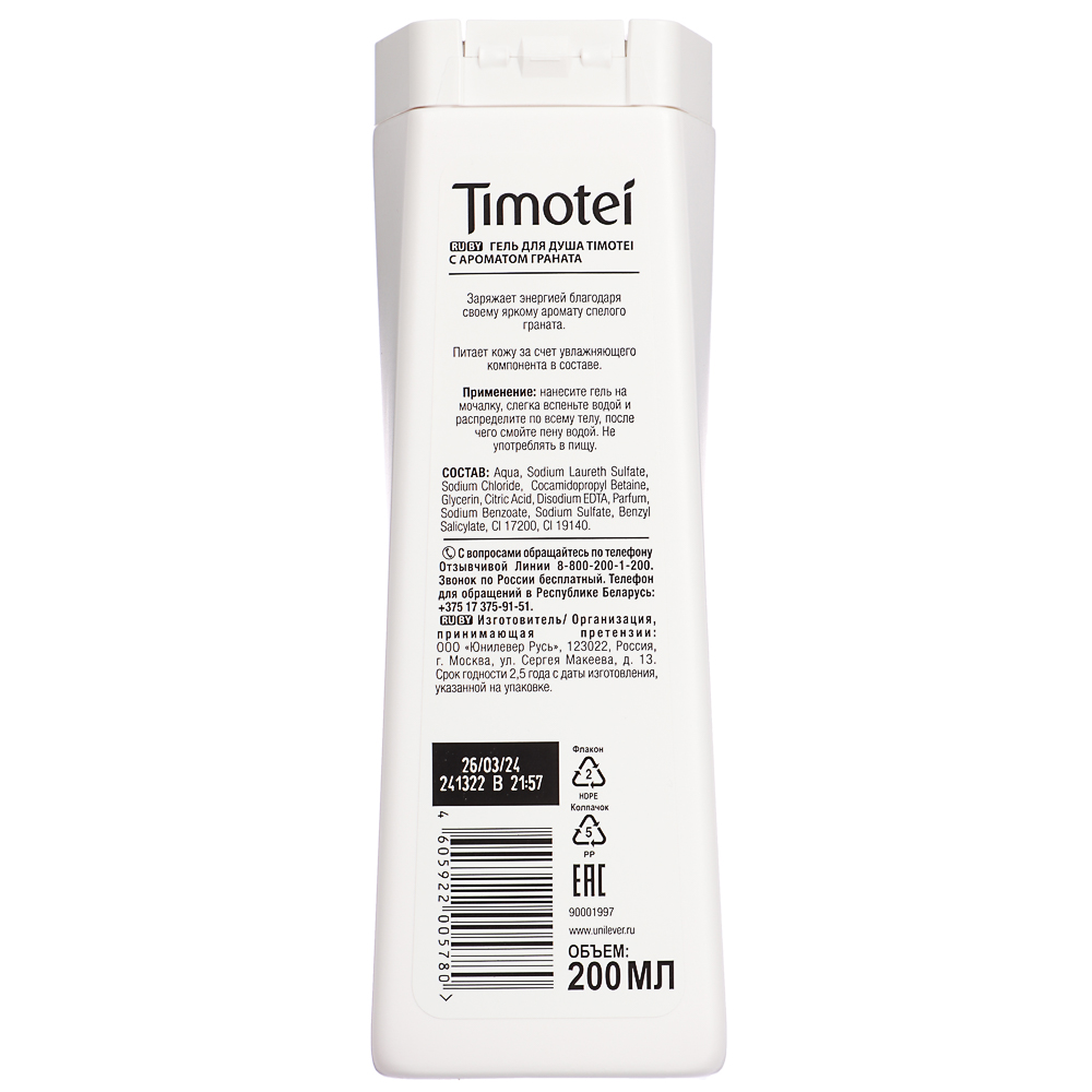 Погрузитесь в роскошное ощущение с TIMOTEI гель для душа с ароматом граната. Этот натуральный гель превращает вашу ежедневную рутину в настоящий уход за кожей, оставляя ее мягкой, увлажненной и свежей. Упаковка объемом 200 мл идеально подходит для удобного использования в душевой или в ванной, позволяя вам наслаждаться ароматным душем в любое время. Продукт легко пенится и мягко очищает кожу, придавая ей невероятное ощущение комфорта и гладкости. Насладитесь ярким ароматом граната и моментами ухода с TIMOTEI гелем для душа.