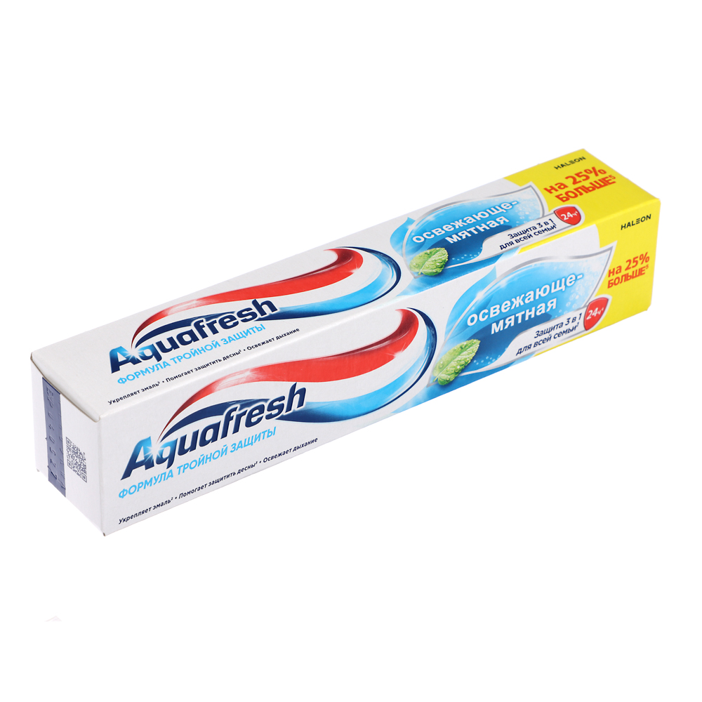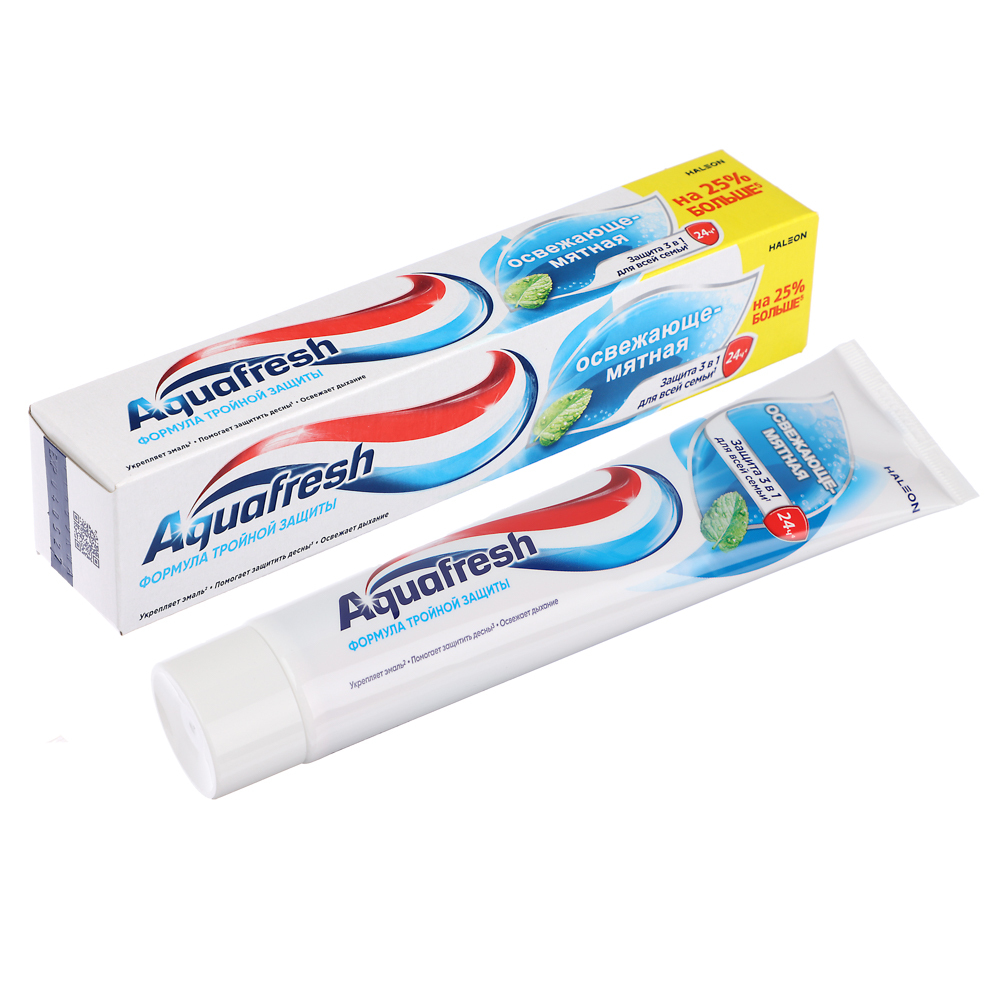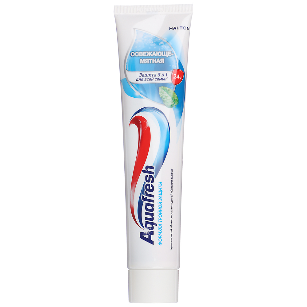 Зубная паста Аквафреш 3+ освежающе-мятная с формулой тройной защиты предупреждает заболевания зубов и десен, а также обеспечивает активную защиту от воздействия сахара на эмаль на протяжении 24 часов после использования. Специальный состав предупреждает кровоточивость и борется с воспалением десен, укрепляет и бережно осветляет зубную эмаль. Приятный мятный вкус делает дыхание свежим и дает ощущение чистоты.