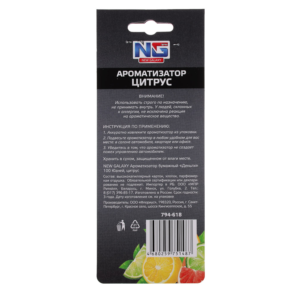 Ароматизатор подвесной "100 Юаней" от бренда NEW GALAXY - безопасный, экологически чистый, натуральный сухой ароматизатор помещения, белья, салона автомобиля. Прекрасная альтернатива ароматизированным спреям от которых чаще бывает аллергия. Очень прост в применении. Имеет стойкий и длительный аромат. Аромат цитруса.