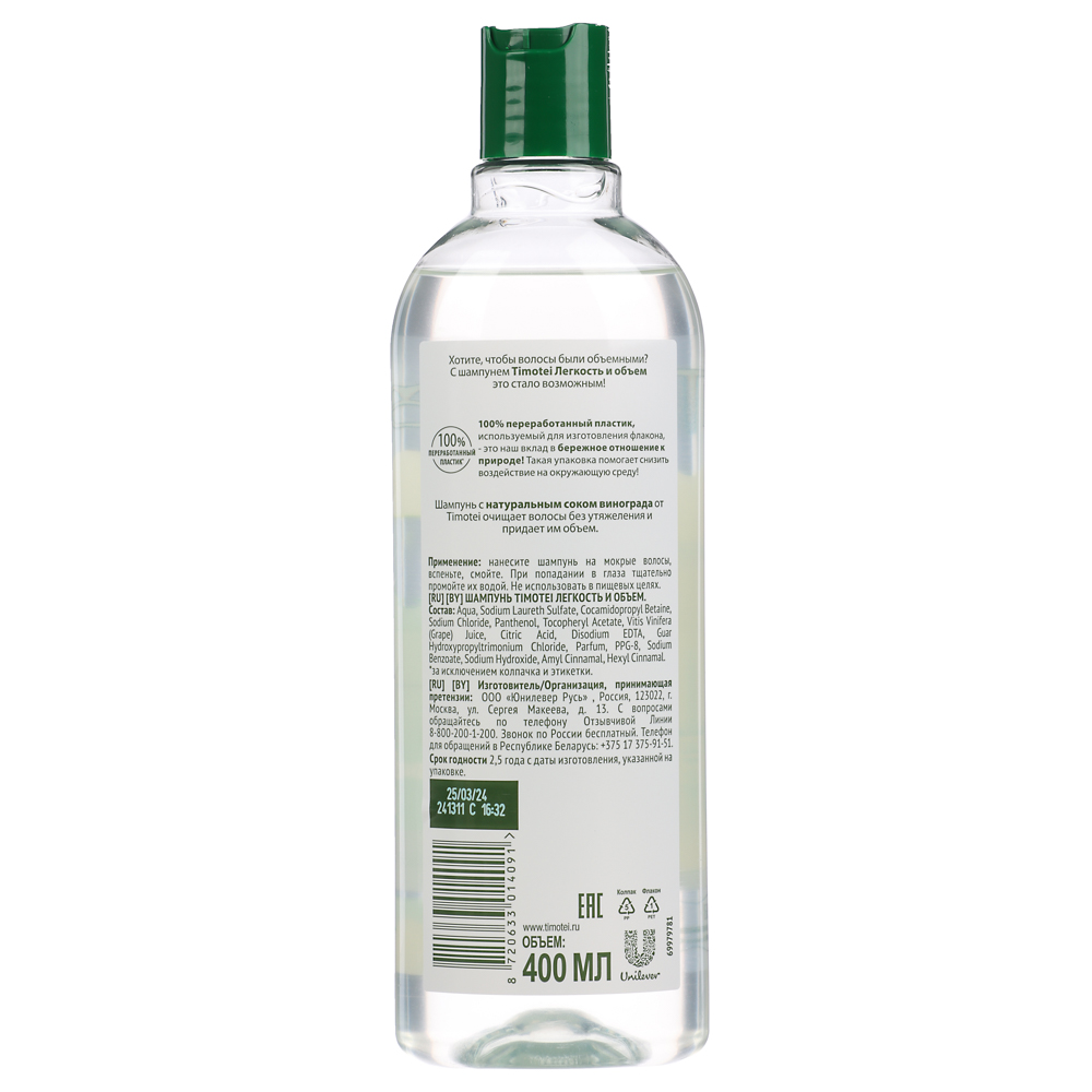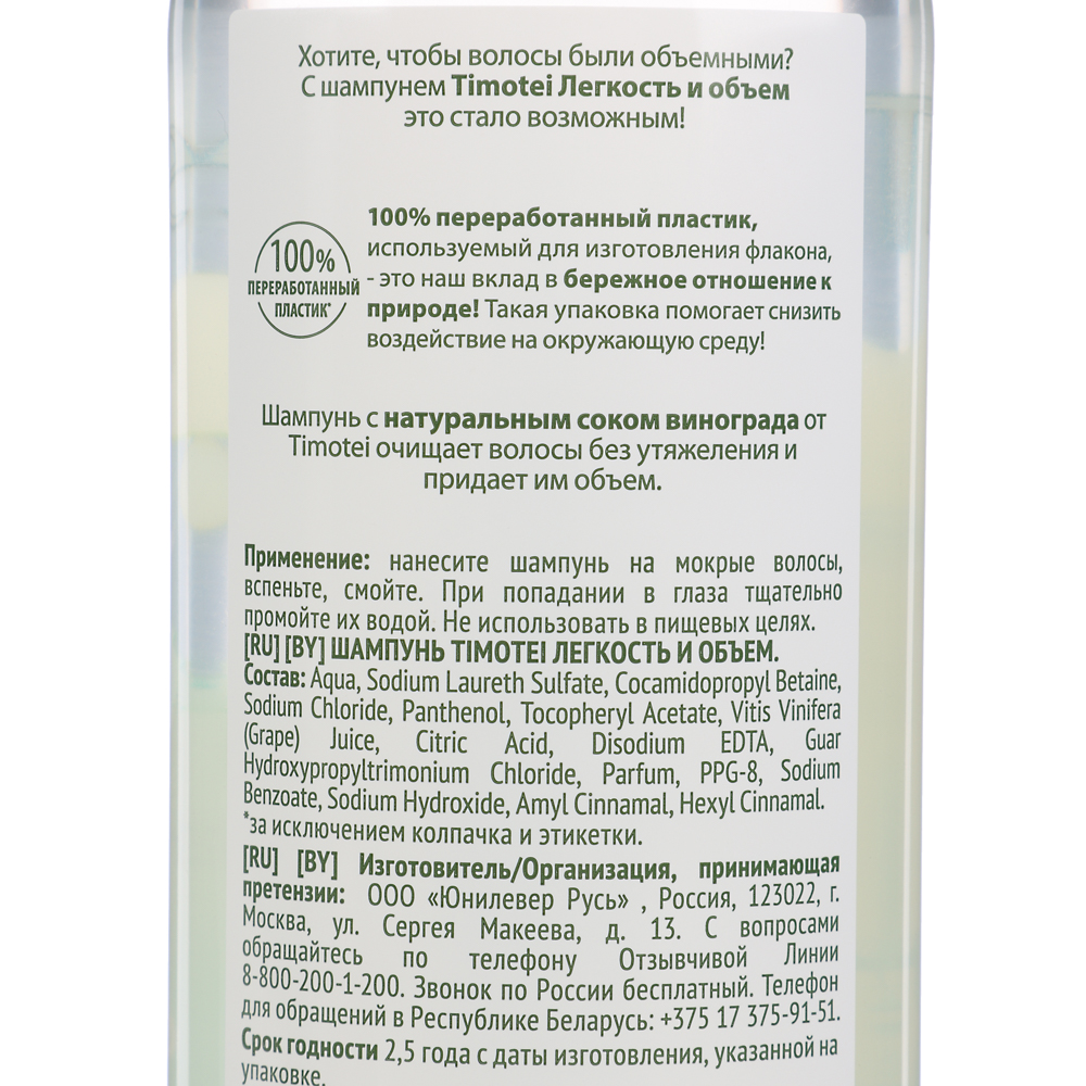Шампунь для волос TIMOTEI «Легкость и объем» в пластиковой бутылке объемом 400 мл содержит натуральный сок винограда. Бережно очищает волосы, дарит легкость и объем без утяжеления. Витамины B5 и E питают структуру волосяного стержня и восстанавливают волосы изнутри. Не содержит парабенов, красителей и силиконов. А бутылка из 100% переработанного пластика – это ваш вклад в сохранение окружающей среды.