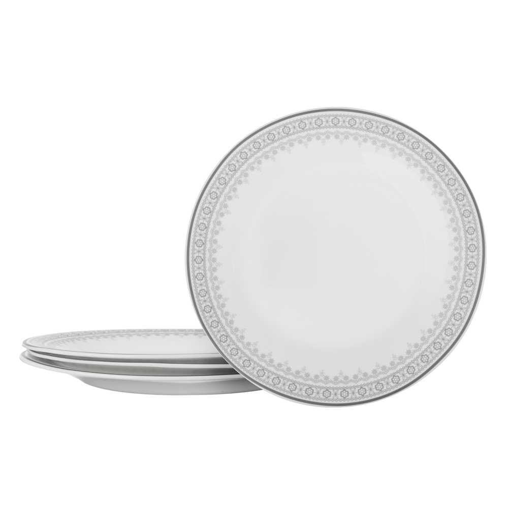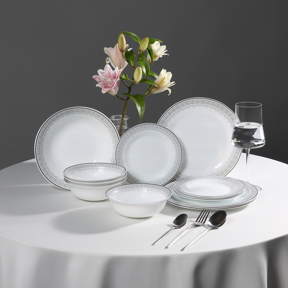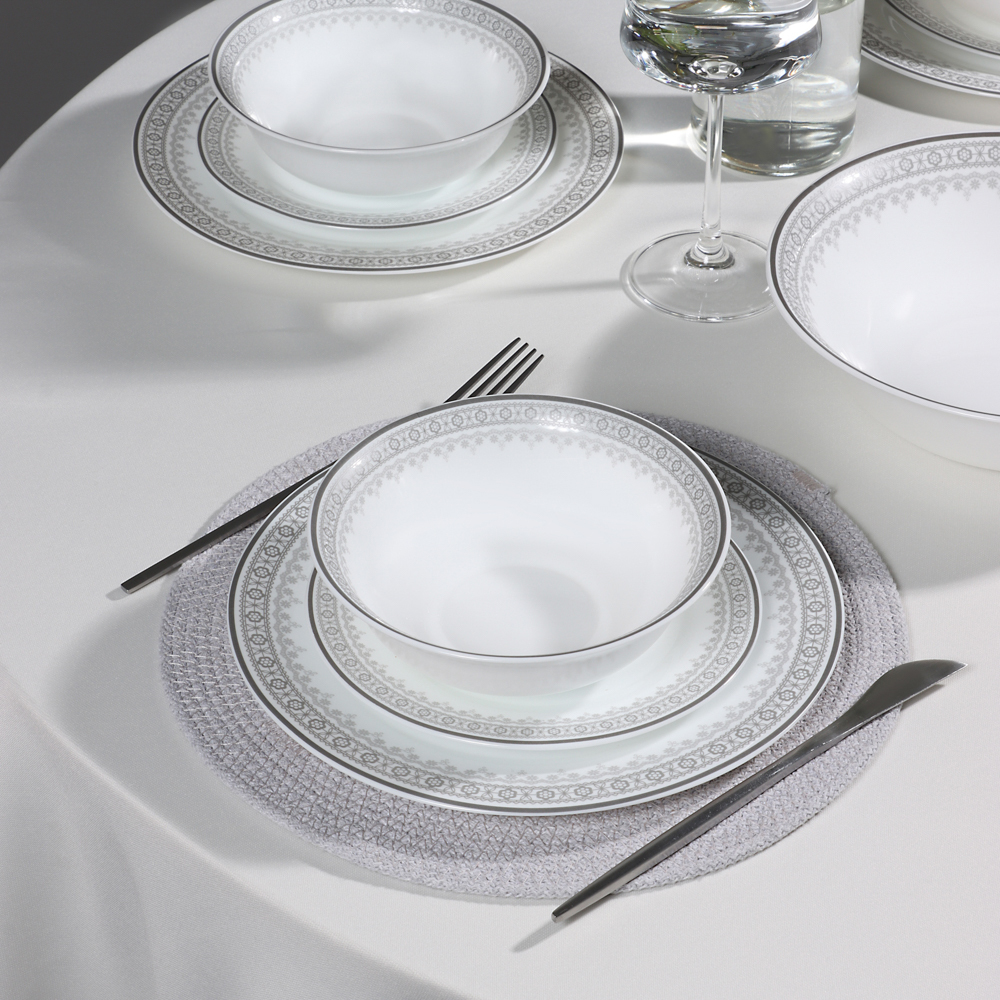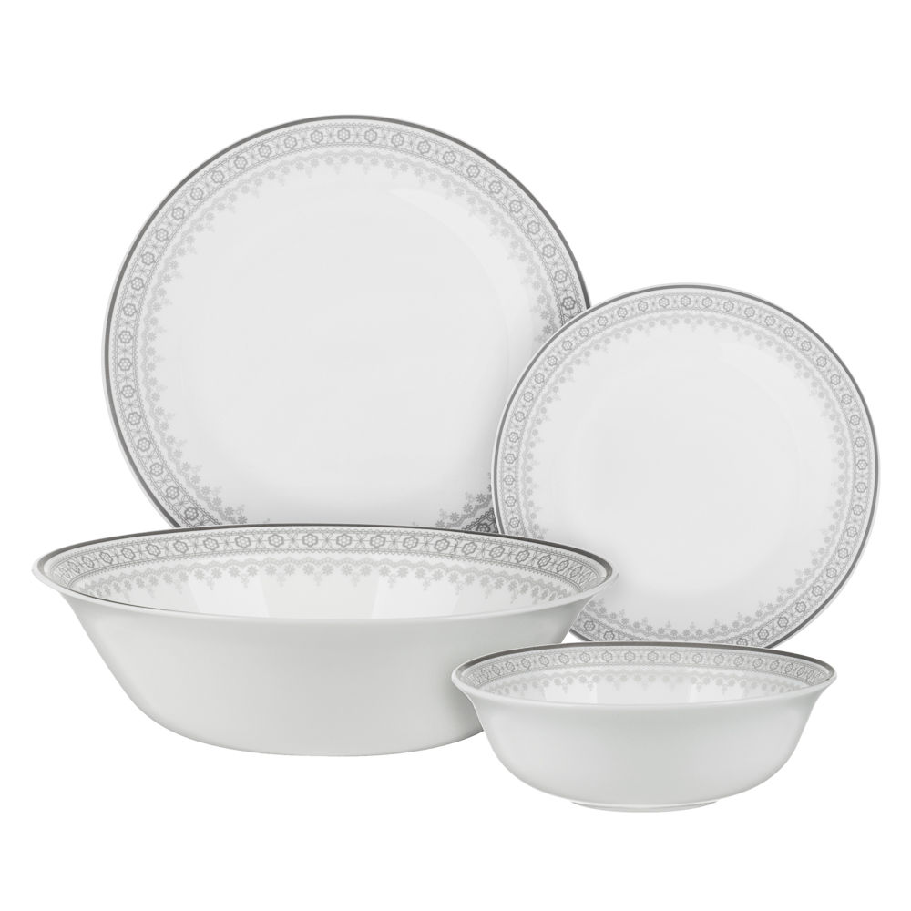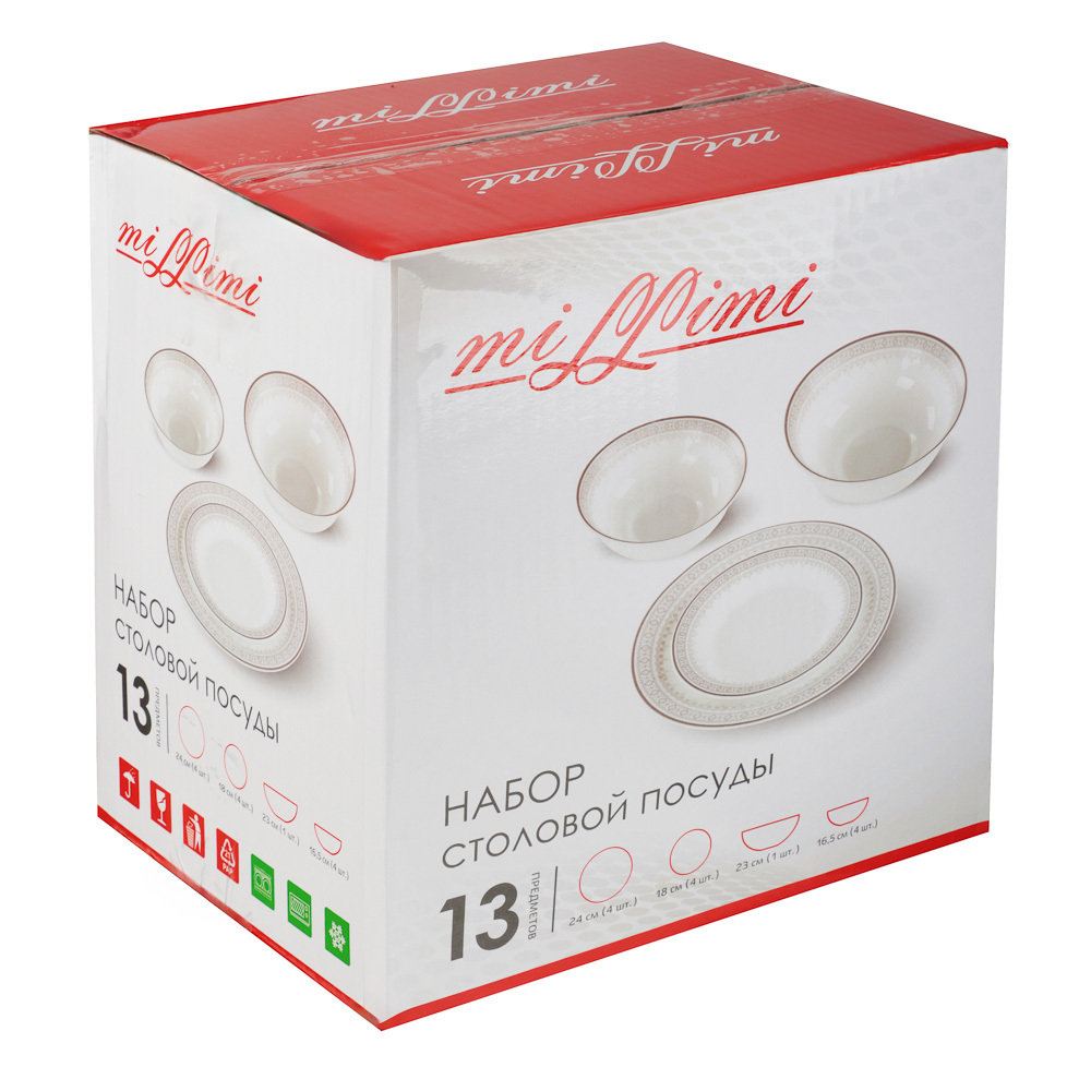 Набор столовой посуды MILLIMI Минта включает 13 предметов из прочного опалового стекла с изящным орнаментом по краю. В комплект входят 4 тарелки диаметром 24 см, 4 тарелки диаметром 18 см, 1 салатник диаметром 23 см и 4 глубоких тарелки диаметром 16,5 см. Элегантный дизайн и функциональность делают этот набор идеальным для ежедневного использования и особых случаев. Легкий в уходе и устойчивый к повреждениям, он гарантирует долгий срок службы и стильный вид на любом столе.