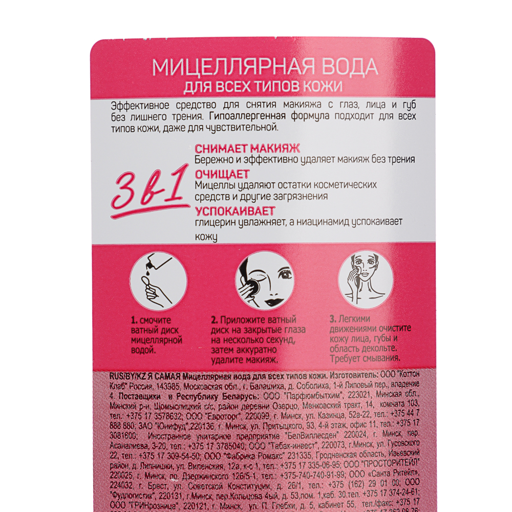 Мицеллярная вода "Я САМАЯ" - истинное воплощение нежности и эффективности в уходе за кожей. Созданная специально для всех типов кожи, она станет вашим надежным помощником в ежедневном ритуале очищения и снятия макияжа. Благодаря уникальной формуле на 100% натуральной основе, она обладает нежным и мягким воздействием на кожу, не вызывая раздражения даже у самых чувствительных типов кожи. Этот многофункциональный продукт умело справляется с удалением макияжа с губ, глаз и лица, при этом оставляя кожу чистой, свежей и увлажненной. Его гипоаллергенная формула делает его идеальным выбором даже для тех, кто страдает от аллергических реакций. Удобная упаковка объемом 400 мл обеспечивает до 220 применений, что делает этот продукт экономичным и долговечным. Погрузитесь в мир нежности и заботы о вашей коже с мицеллярной водой "Я САМАЯ" - вашим надежным партнером для естественного и безупречного ухода.