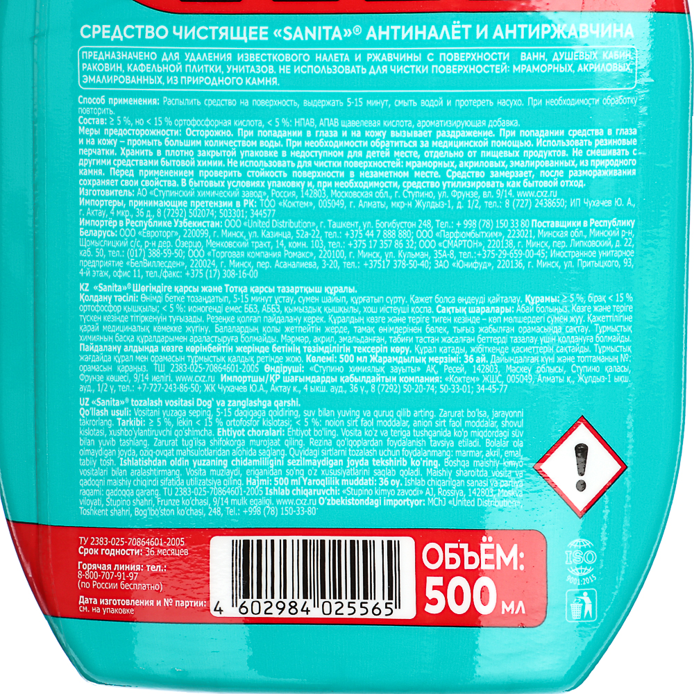 Приведите свои поверхности в идеальное состояние с помощью средства для чистки SANITA Антиналет и Антиржавчина! Это мощное чистящее средство, представленное в удобной упаковке объемом 500 мл, не содержит хлора, что делает его безопасным и эффективным для использования в вашем доме. SANITA Антиналет и Антиржавчина разработано для удаления известкового налета и устранения ржавчины на различных поверхностях, от кафеля в ванной комнате до металлических поверхностей в гараже. Его специальная формула обеспечивает активную пену, которая позволяет эффективно бороться с загрязнениями на 360 градусов, достигая даже самых труднодоступных участков. С SANITA Антиналет и Антиржавчина вы сможете легко и быстро вернуть свои поверхности к их первоначальному блеску, без лишних усилий и временных затрат. Позвольте этому чистящему средству сделать вашу уборку эффективной и приятной, обеспечивая вам и вашей семье чистоту и комфорт в доме каждый день.