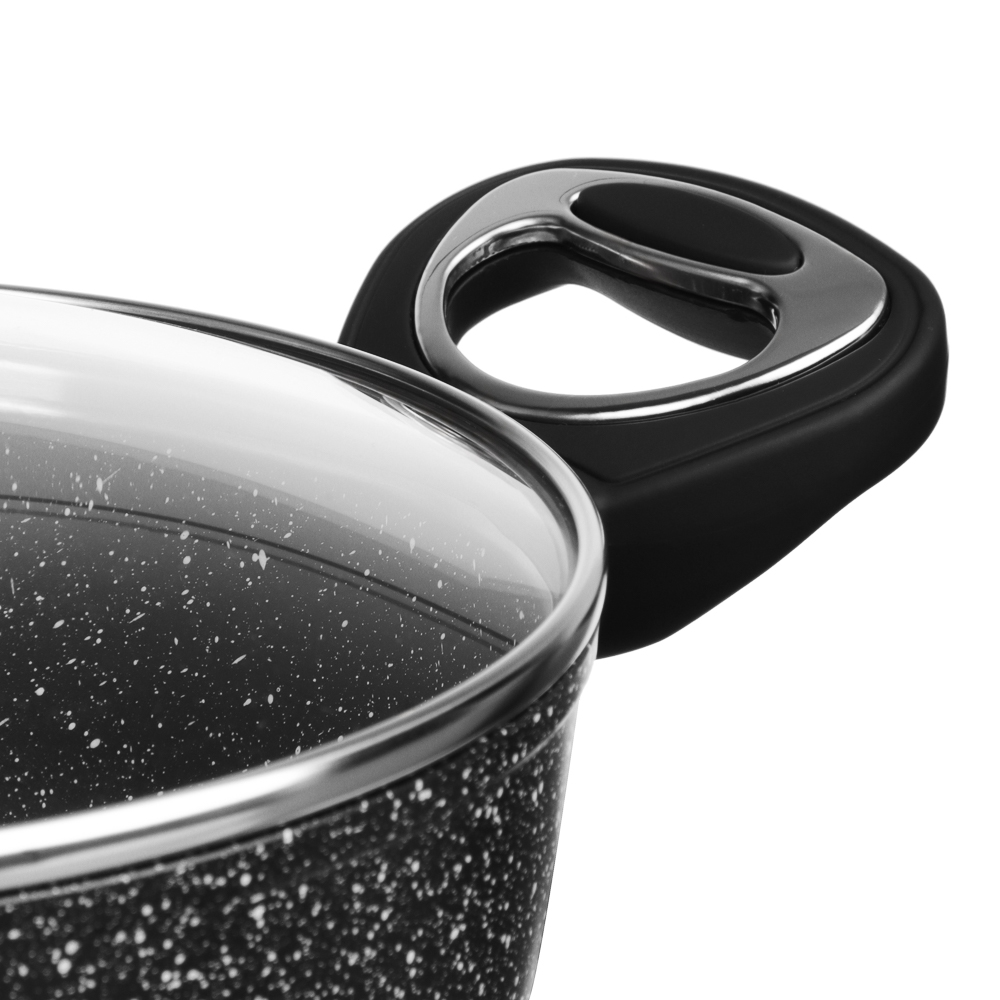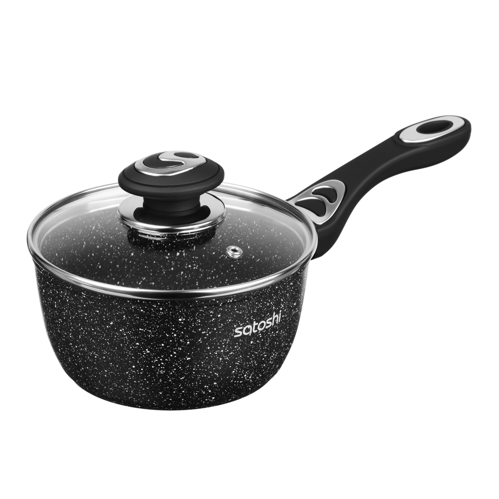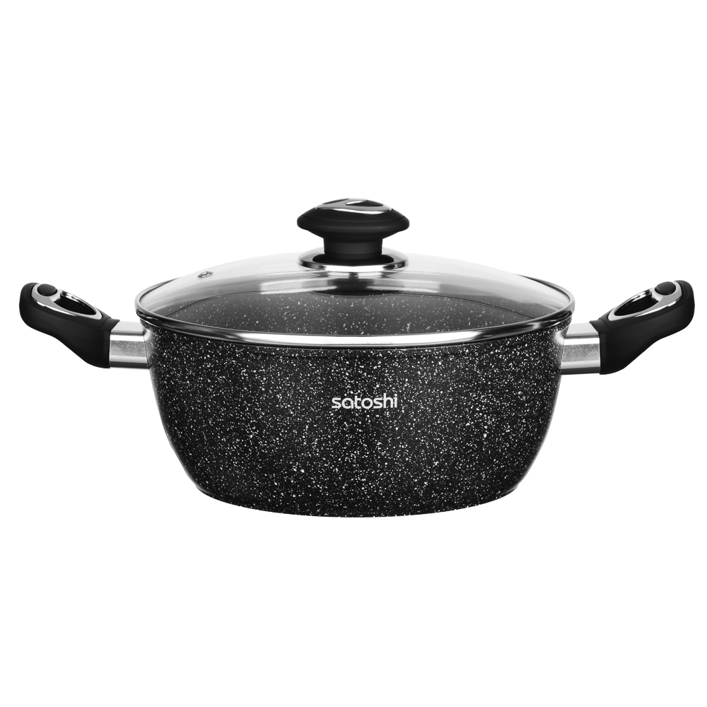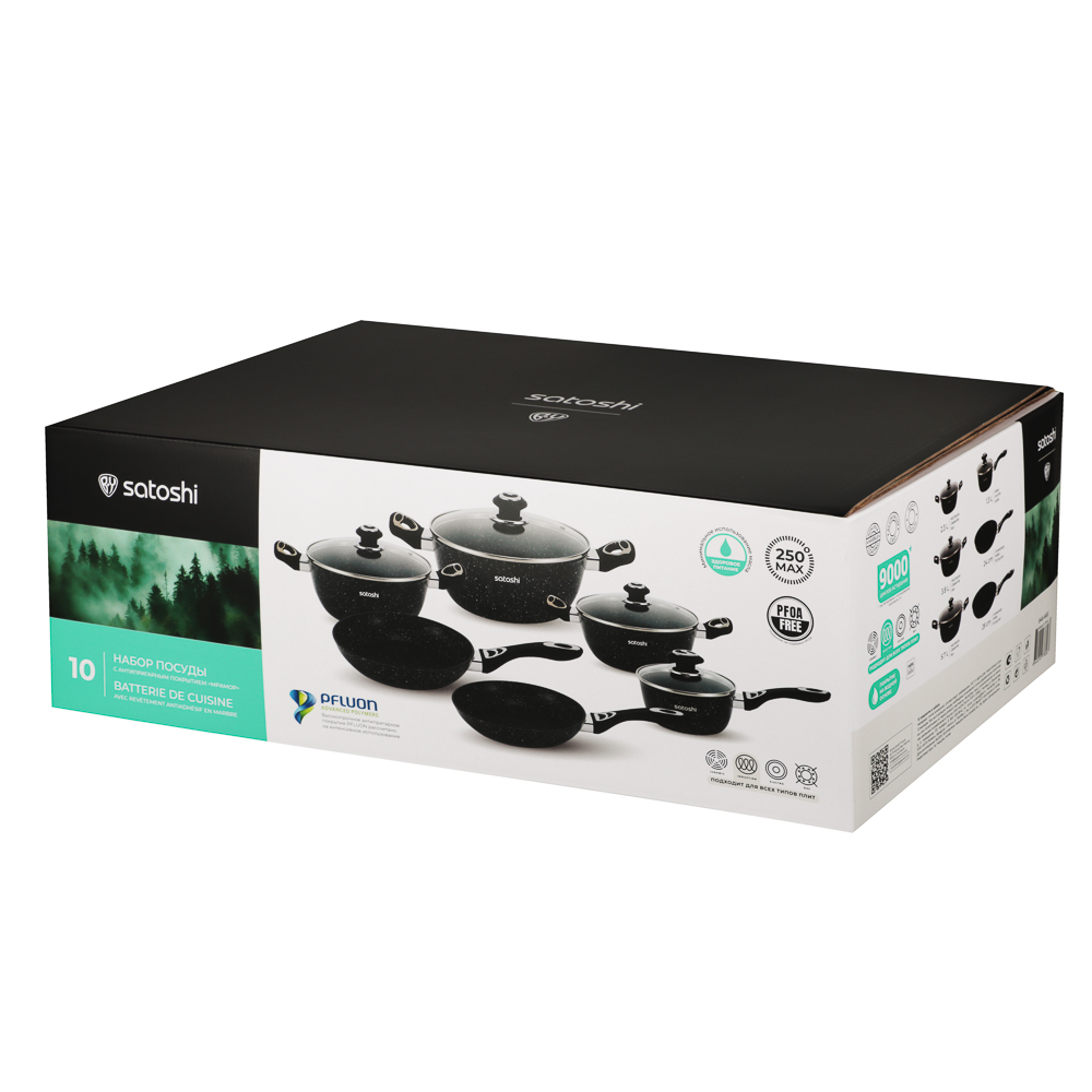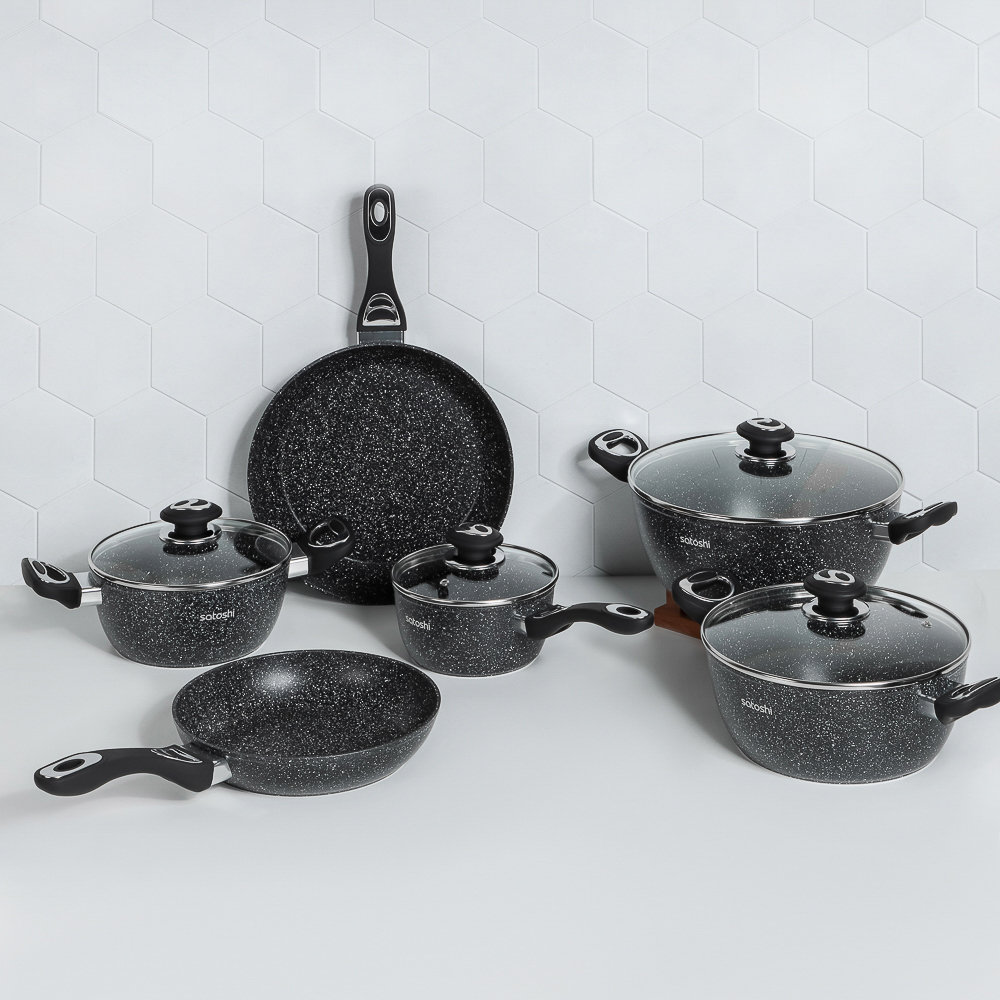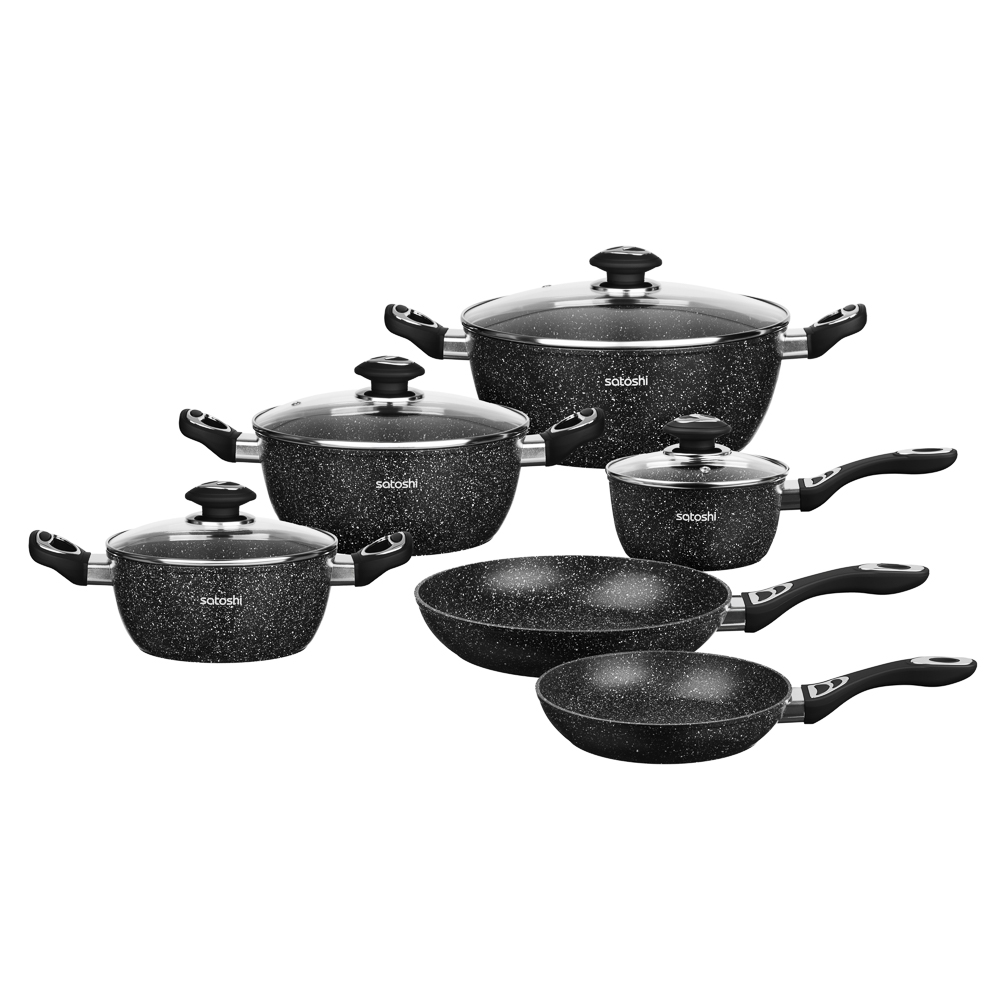 Набор посуды из литого алюминия из 10 предметов SATOSHI «Танто» включает все необходимое для приготовления любых блюд на домашней кухне. В состав набора входят 3 кастрюли объемом 2,3 л, 3,8 л, 5,7 л с прозрачными стеклянными крышками, ковш с крышкой объемом 1,3 л и 2 сковороды диаметром 24 и 28 см. Вся посуда имеет высокопрочное безопасное антипригарное покрытие без содержания PFOA, рассчитанное на интенсивное использование. Стильный дизайн в черном цвете с фактурой «под камень» украсит любую кухню и впишется в любой интерьерный стиль. Посуда подходит для приготовления диетических блюд без масла, продукты не прилипают и не пригорают. Ручки не нагреваются, прочные, эргономичные и долговечные. Набор предназначен для всех типов плит, включая и индукцию. Для сохранения целостности покрытия необходимо пользоваться деревянными, силиконовыми или пластиковыми лопаточками во время приготовления.