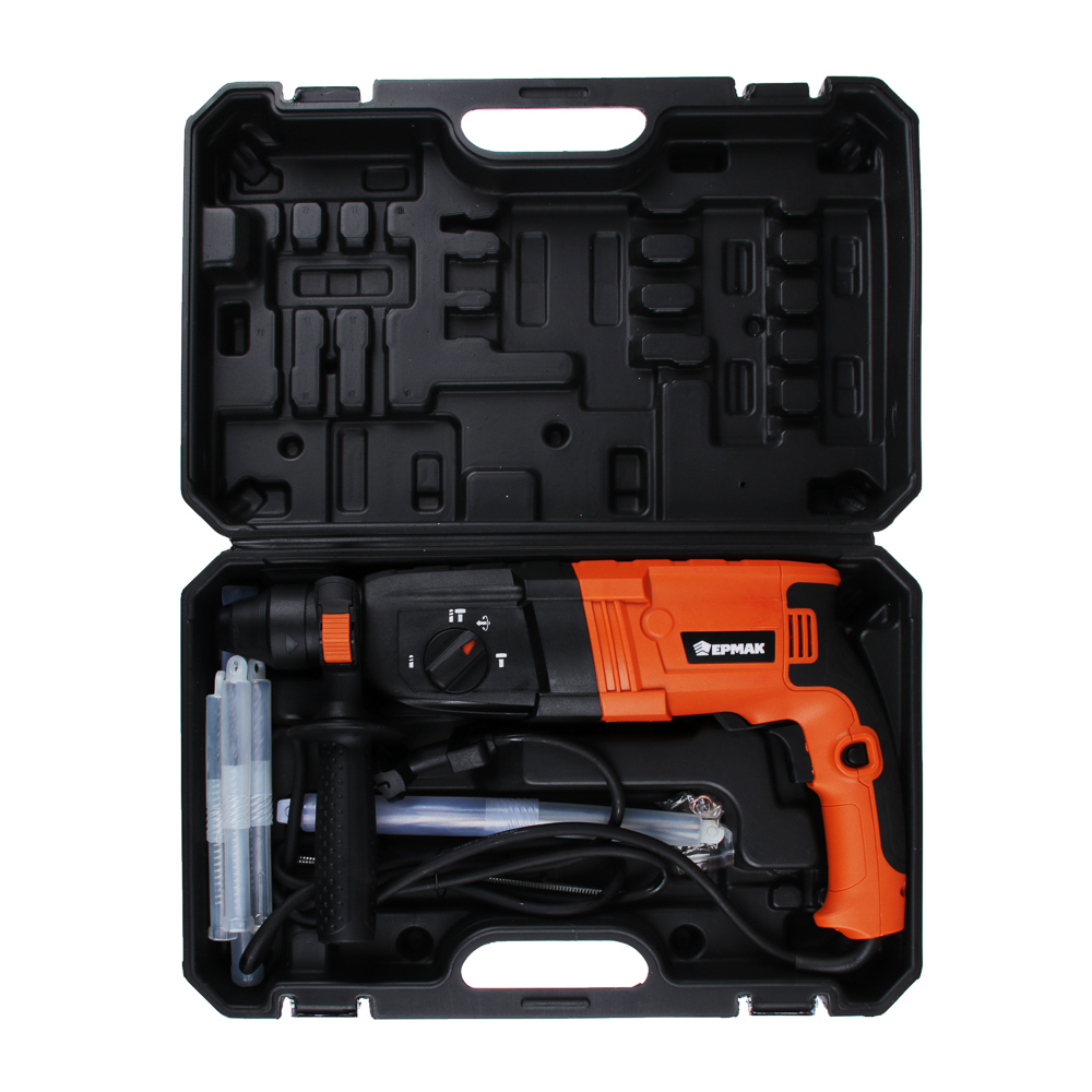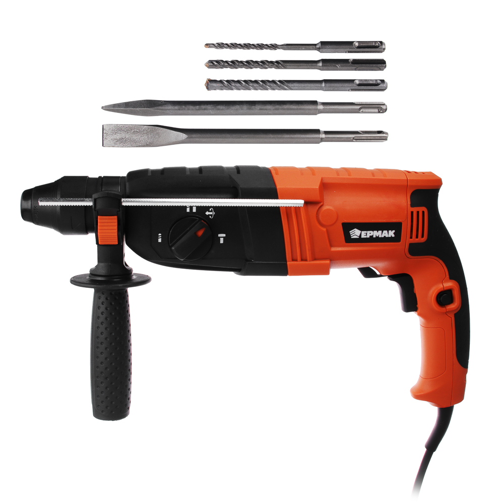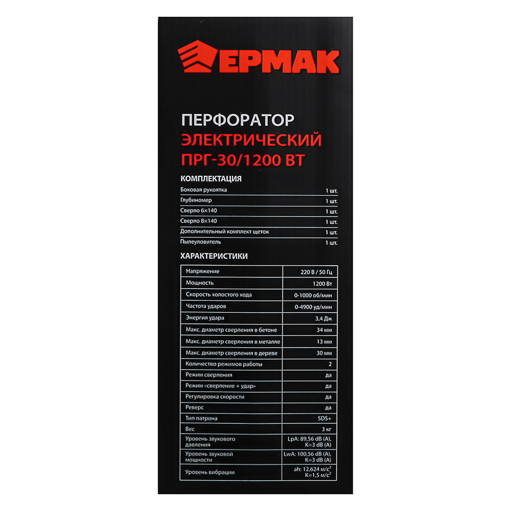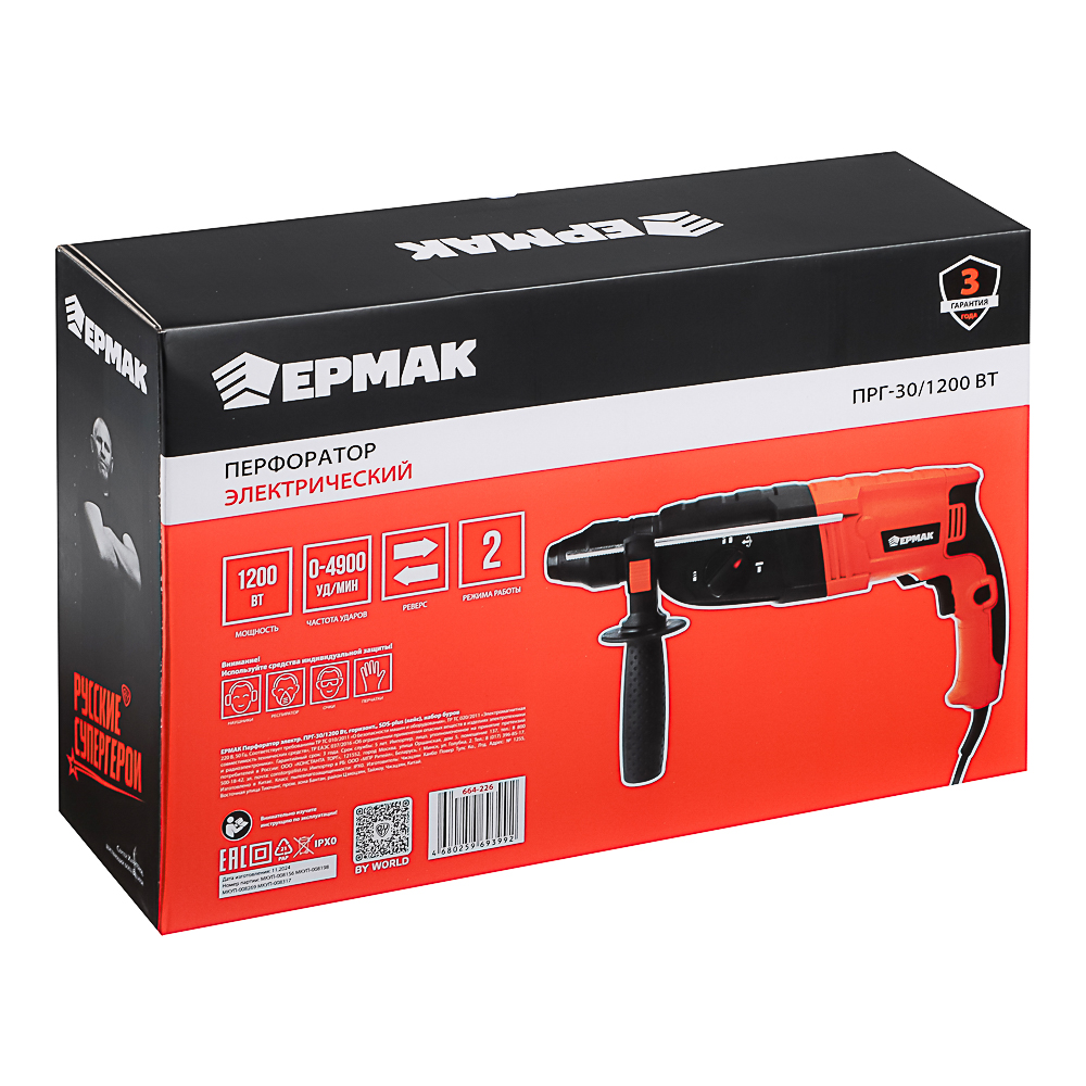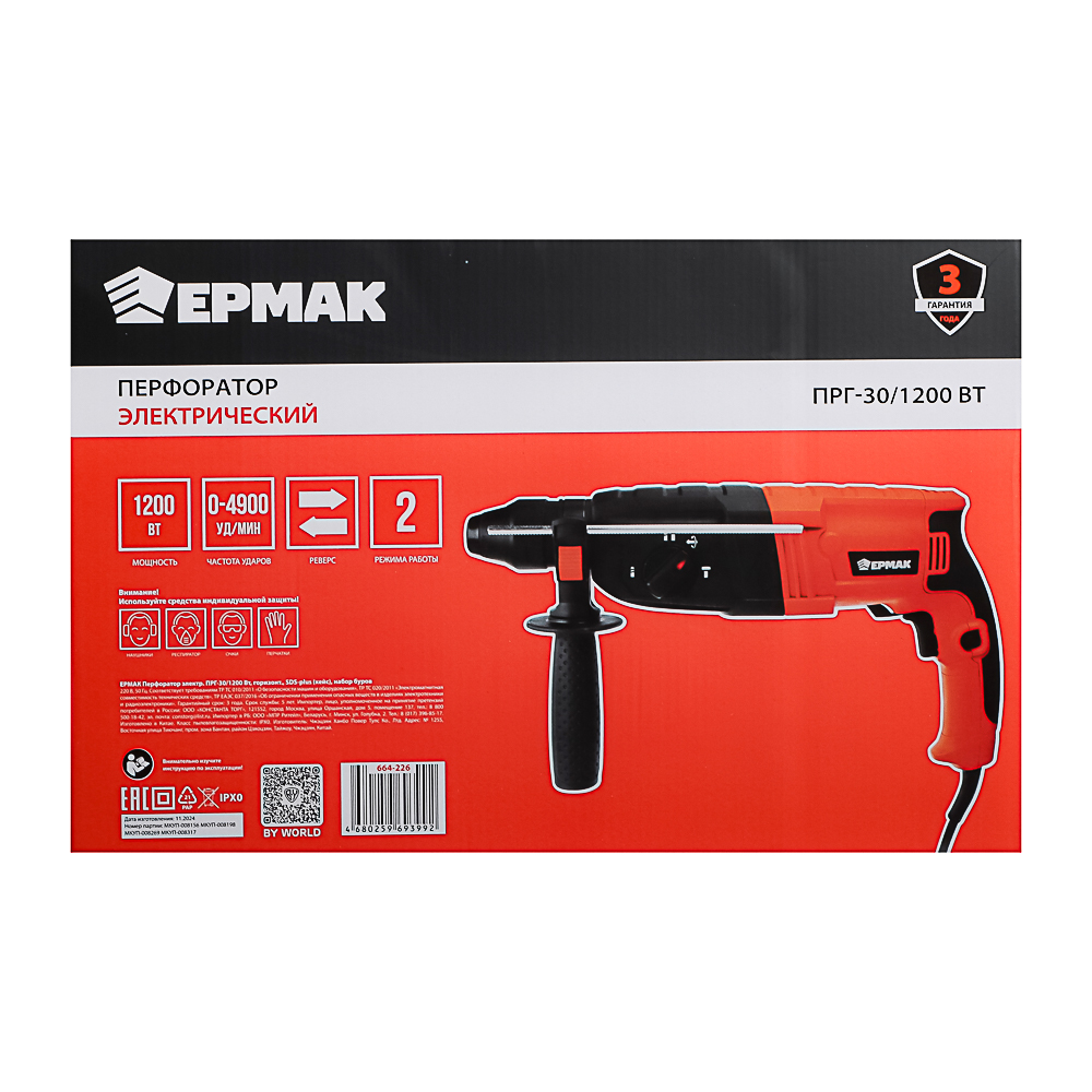 Перфоратор электрический ЕРМАК ПРГ-30/1200ВТ – необходимый инструмент при проведении строительных и отделочных работ. Прекрасно справляется с бурением, штроблением и дроблением твердых материалов – бетона, кирпича, камня, оставляя после себя отверстия и борозды с ровными краями для последующего использования дюбелей, прокладки кабеля и других элементов.? Скорость 4900 ударов в минуту позволяет быстро и эффективно производить работы.? 3 режима – сверление, удар, сверление + удар. А также функция ручной корректировки угла поворота бура или зубила.? Реверс осуществляет движение крутящего элемента в обратном направлении, позволяя с легкостью изъять застрявший бур.? 3 бура, 1 пика и 1 зубило в комплекте.Удобный пластиковый кейс для хранения включен в комплектацию.