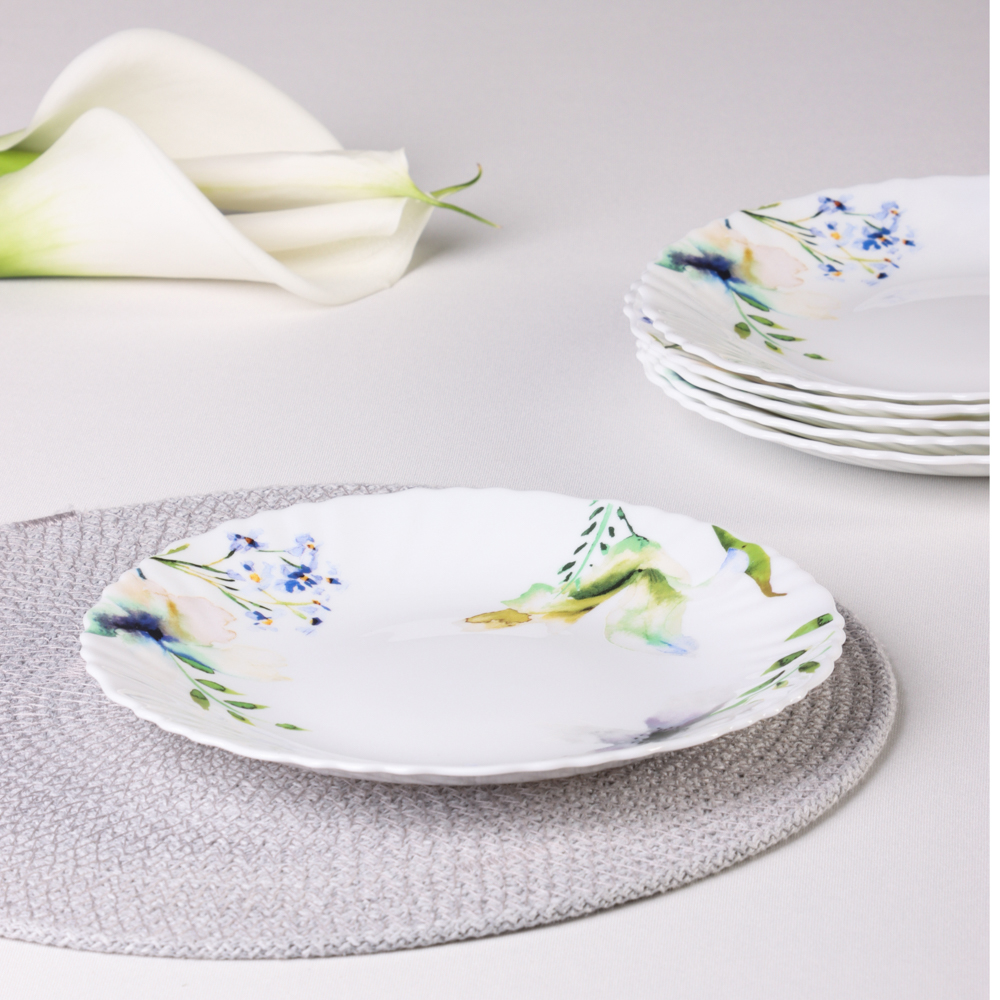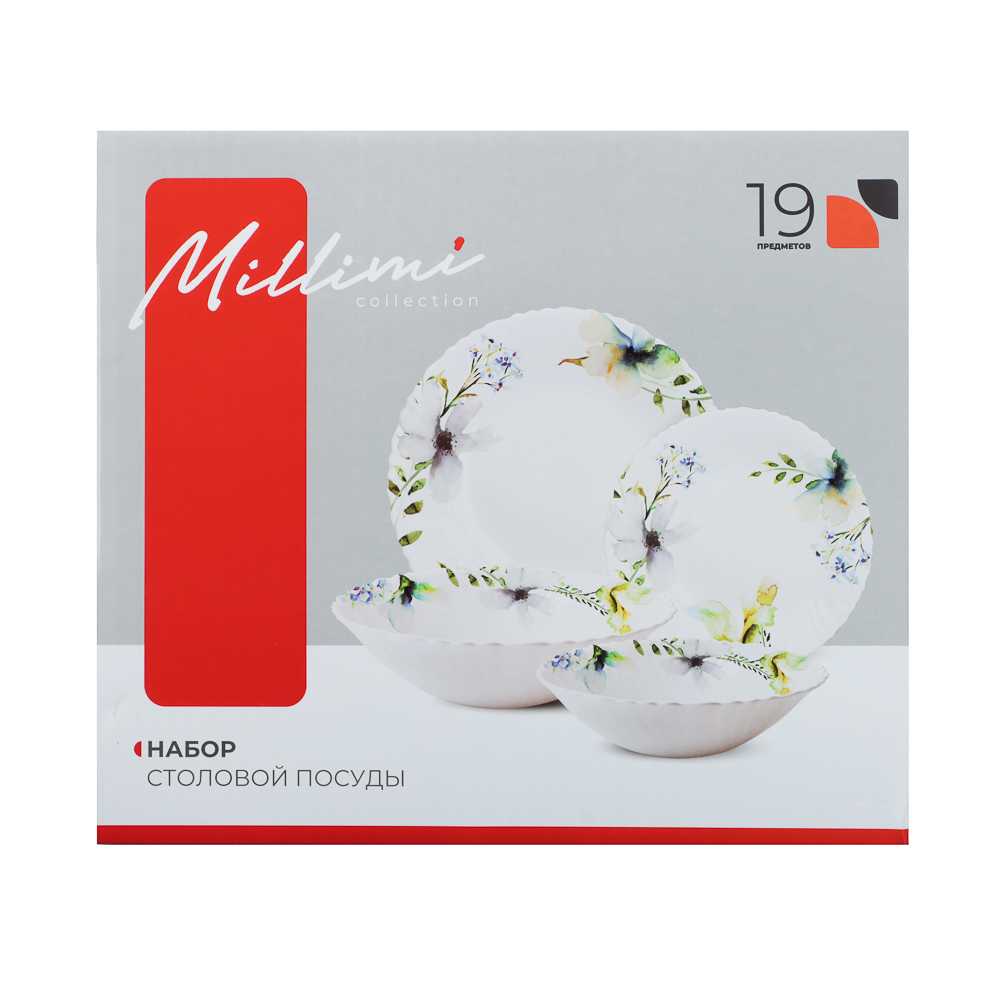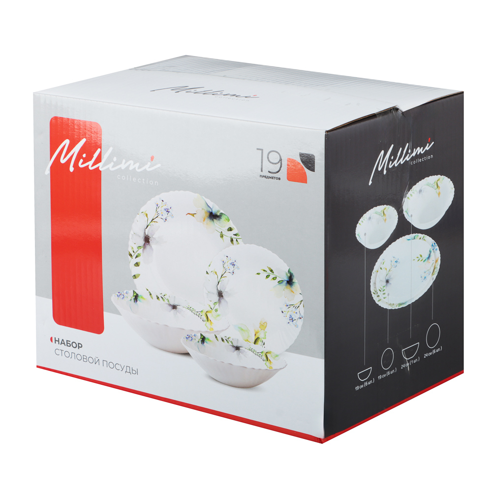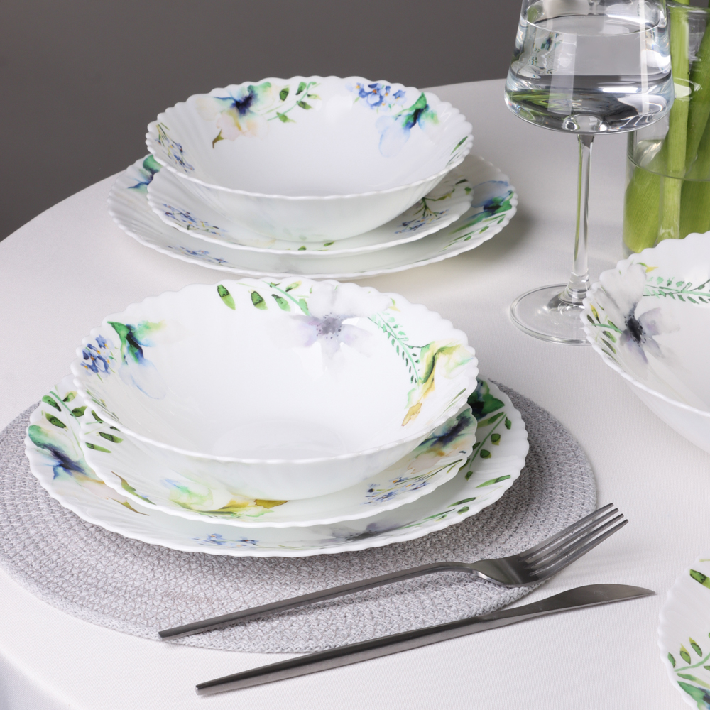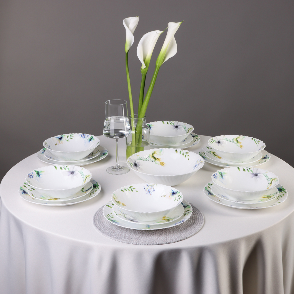 Набор MILLIMI Шабер из 19 предметов — это истинное воплощение элегантности и изысканности. Белоснежная основа из опалового стекла украшена цветочным узором в синей палитре, создающим атмосферу свежести и гармонии. Благодаря прочности и термостойкости опалового стекла, посуда выдержит ежедневное использование и порадует вас долговечностью. Комплектация набора: 6 обеденных тарелок (диаметр 24 см) — идеальны для подачи основных блюд и закусок; 6 десертных тарелок (диаметр 19 см) — подойдут для сервировки десертов и небольших порций; 6 глубоких тарелок (диаметр 19 см) — прекрасно удерживают тепло супов, паст и других горячих блюд; 1 крупный салатник (диаметр 24 см) — станет эффектным акцентом для подачи салатов, фруктов или закусок. Уникальный цветочный узор на белом фоне, словно созданный художником, добавляет набору утонченности и делает его стильным украшением любого стола. Набор MILLIMI Шабер станет не только украшением семейных ужинов и обедов, но и великолепным подарком для б