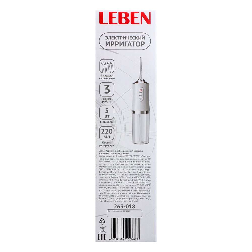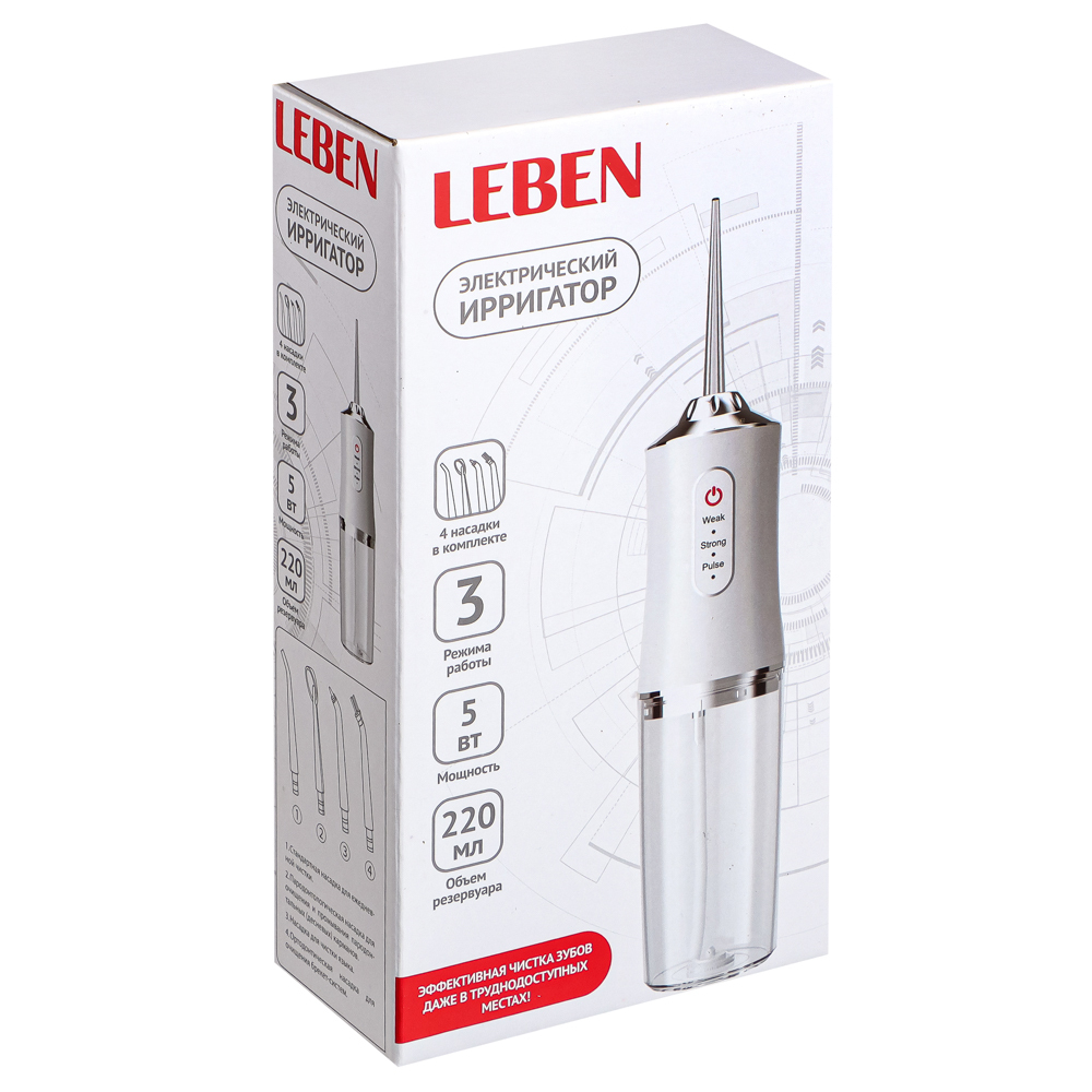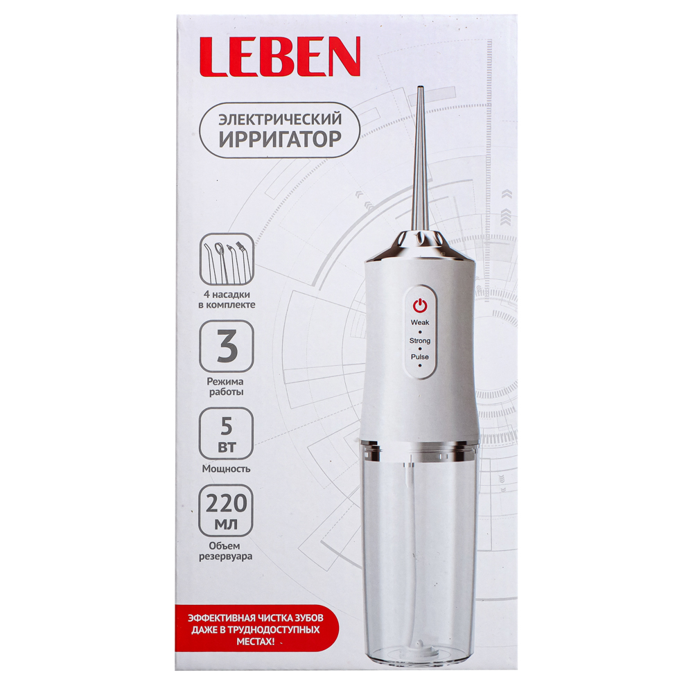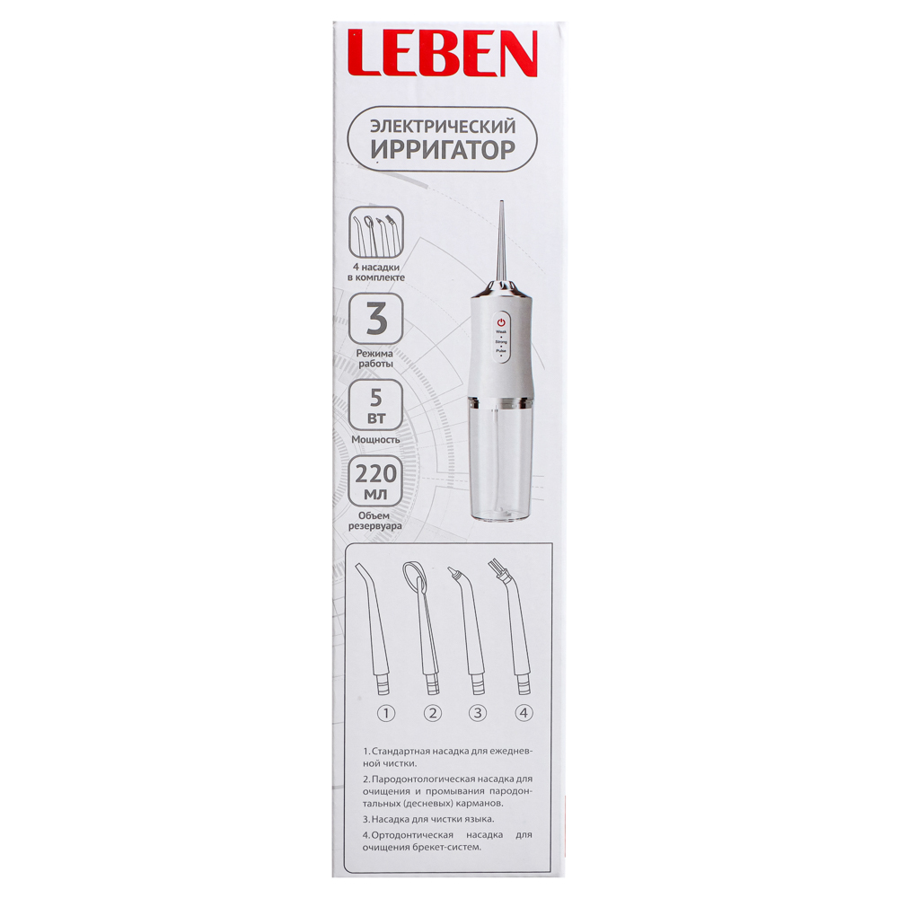Ирригатор LEBEN - это удобный и функциональный прибор, который поможет вам поддерживать здоровье полости рта и эффективно очищать зубы. Ирригатор оснащен 3 режимами работы, которые позволяют выбрать оптимальный режим для вашей полости рта. Мощность ирригатора составляет 5 Вт, что обеспечивает достаточную силу струи для эффективного удаления остатков пищи и бактерий. Питание осуществляется через USB-провод, что делает ирригатор очень удобным в использовании в любом месте. В комплекте с ирригатором идут 4 насадки различной формы, которые позволяют настроить струю в зависимости от ваших потребностей. Насадки легко меняются, что делает использование ирригатора максимально удобным и гигиеничным. Ирригатор выполнен из пластика, который обладает высокой прочностью и долговечностью. Благодаря своему компактному размеру и белому цвету, ирригатор легко вписывается в интерьер ванной комнаты или рабочего кабинета. Произведен ирригатор LEBEN в Китае, где известны своим высоким уровнем качества прод