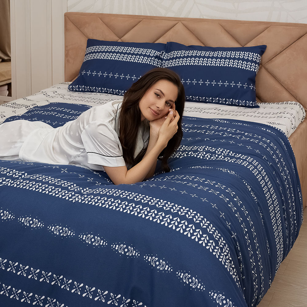 Откройте для себя мир безмятежного сна с комплектом постельного белья PROVANCE Нэви. Комплект выполнен из поплина — мягкой и приятной на ощупь ткани. Материал обладает высокой прочностью и износостойкостью, хорошо сохраняет форму и цвет даже после многочисленных стирок. Ткань изготовлена из 100%-го хлопка, который известен своей гипоаллергенностью и способностью пропускать воздух. Хлопок также хорошо впитывает влагу, поэтому на таком белье будет комфортно спать в любое время года. Синий цвет комплекта добавит спальне свежести и уюта. Он отлично сочетается с различными интерьерами и создаёт атмосферу спокойствия и умиротворения. В комплект входят четыре предмета: две наволочки размером 50х70 см, простыня размером 150х214 см и пододеяльник размером 145х215 см.Комплект постельного белья PROVANCE Нэви станет прекрасным выбором для вашей спальни. Он подарит вам комфортный сон и украсит вашу комнату.
