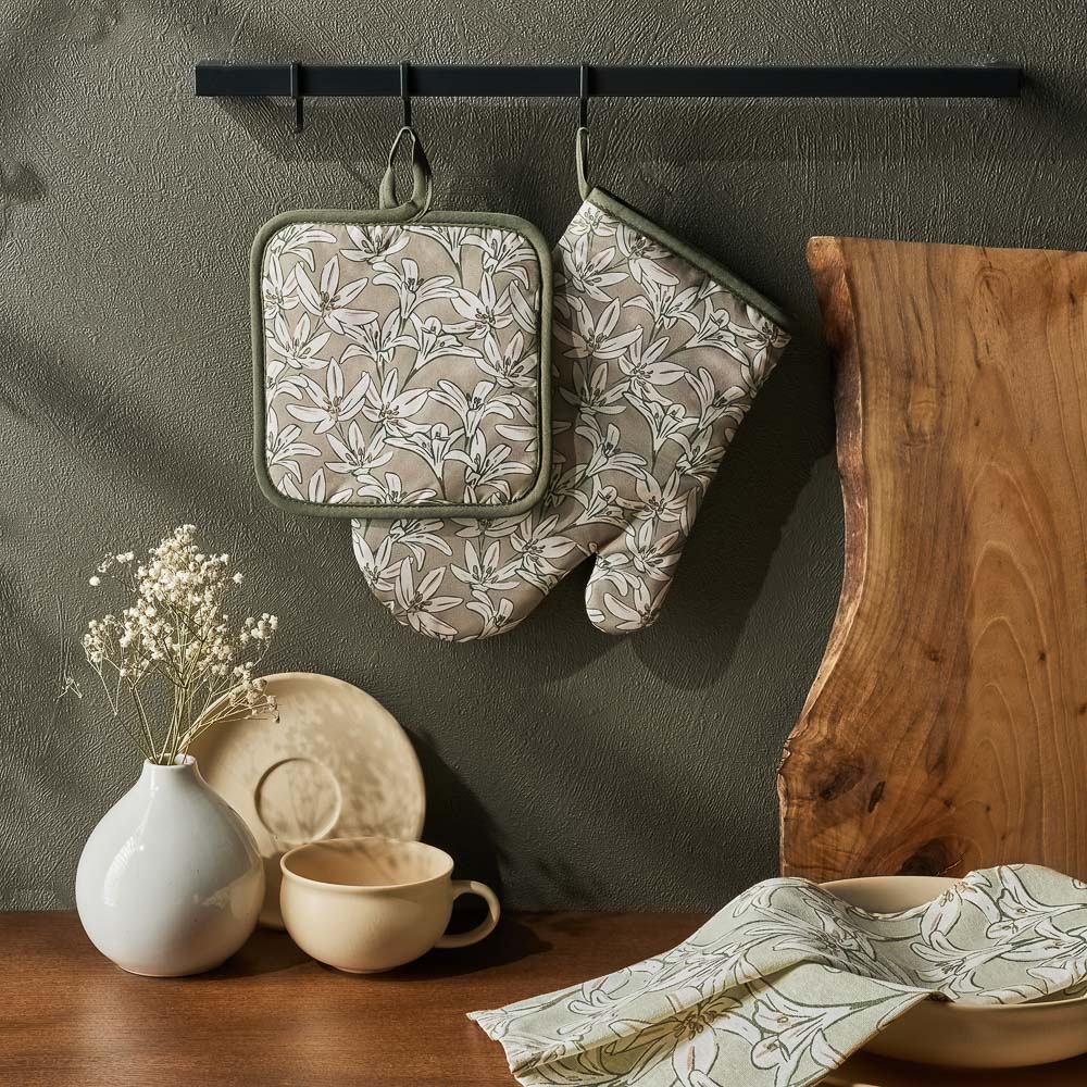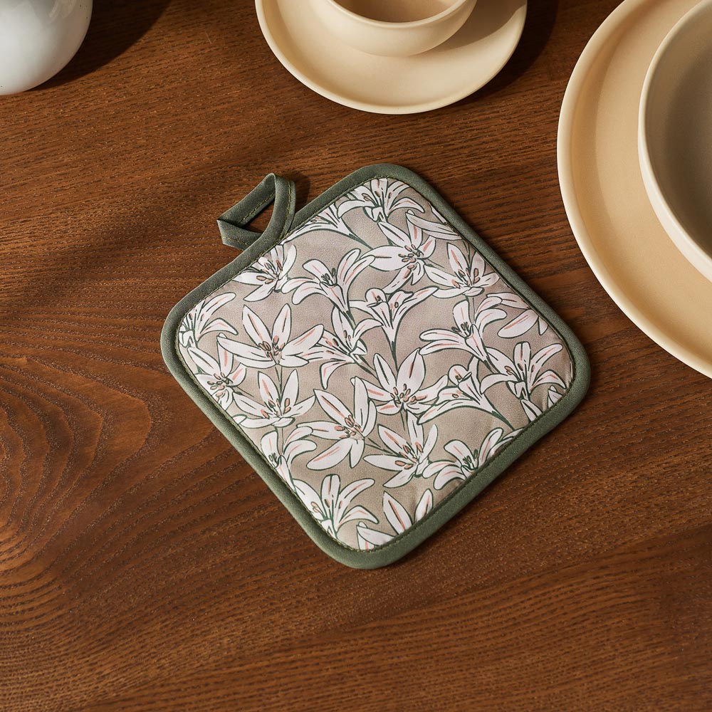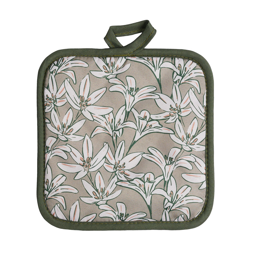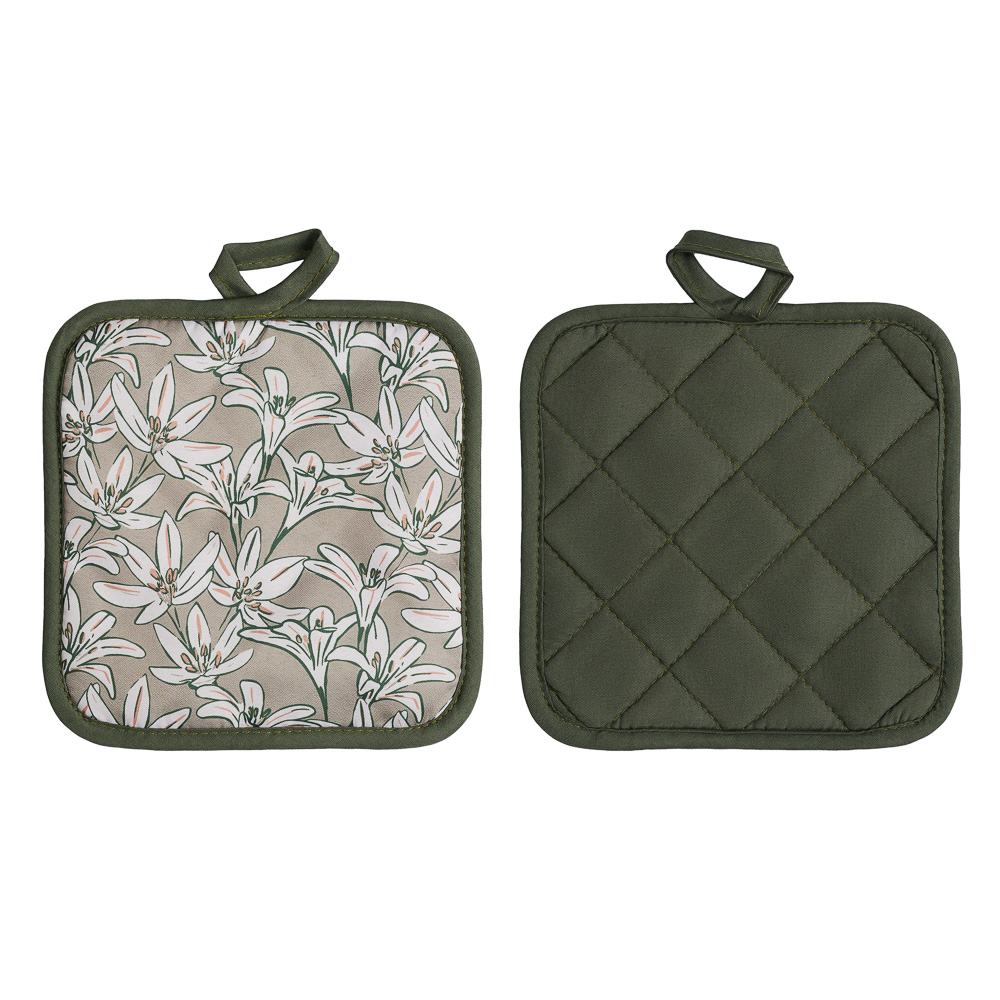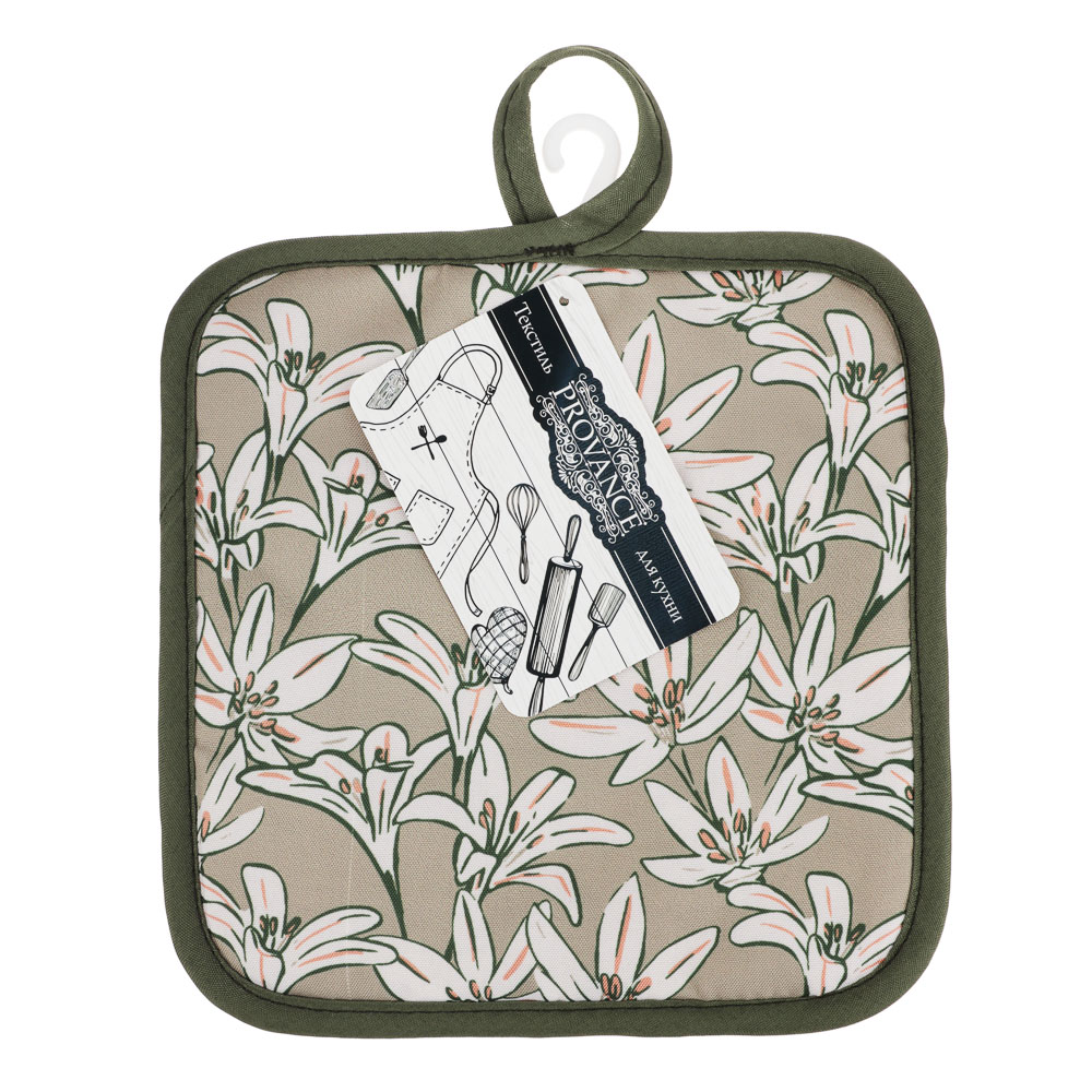 Прихватка "Эвкалипт" 17х17 см защитит ваши руки при контакте с горячими предметами во время кухонных работ – например, позволит безопасно браться за горячую ручку чайника, ковша, сковороды. А пара таких прихваток поможет перенести с плиты на стол горячую кастрюлю – и не обжечься. Изделие изготовлено из плотной ткани (полиэстера), слои которой простёганы для прочности. Материал износостоек и сохранит свои свойства после многочисленных машинных стирок.Прихватка снабжена петлёй, за которую вы сможете подвесить её рядом с плитой. Ваша помощница всегда будет под рукой.