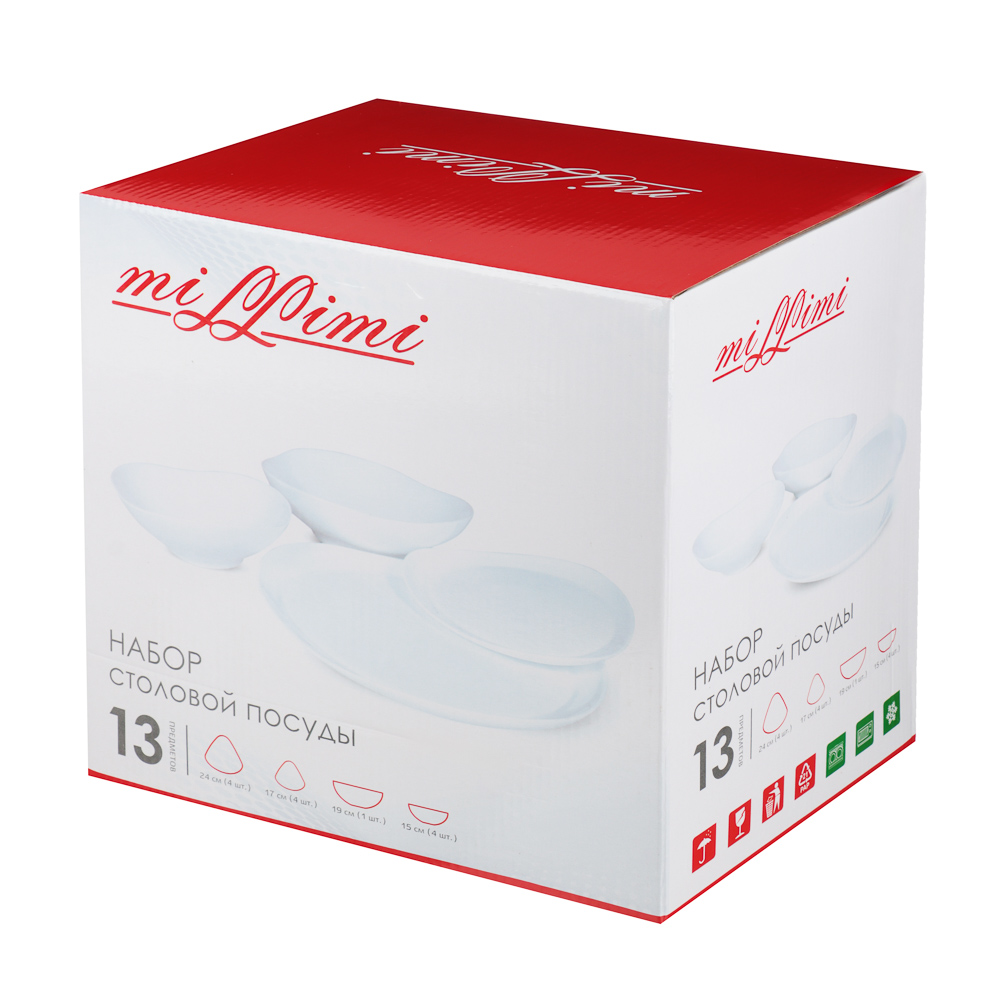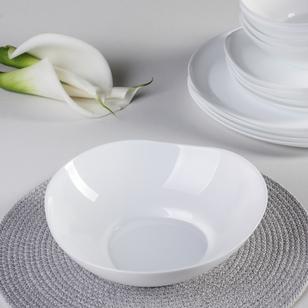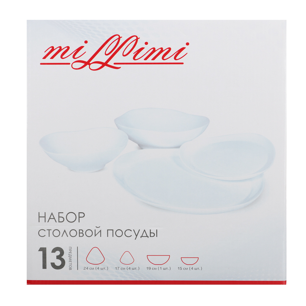 Набор столовой посуды MILLIMI, состоящий из 13 предметов, выполнен из белоснежного опалового стекла и удивляет необычной треугольной формой, которая придаст вашему столу стильный и современный вид. Комплект включает в себя 4 обеденные тарелки диаметром 24 см, идеально подходящие для подачи основных блюд, 4 десертные тарелки диаметром 17 см для закусок и сладостей, 4 глубокие тарелки диаметром 15 см, которые отлично удерживают тепло супов и горячих блюд, а также салатник диаметром 19 см для эффектной подачи салатов, фруктов или гарниров. Благодаря прочному опаловому стеклу набор устойчив к перепадам температур, что делает его безопасным для использования в микроволновой печи и посудомоечной машине. Легкий в уходе, изящный и прочный, набор MILLIMI — идеальный выбор для повседневной сервировки и особых случаев, а также станет прекрасным подарком для друзей и близких.