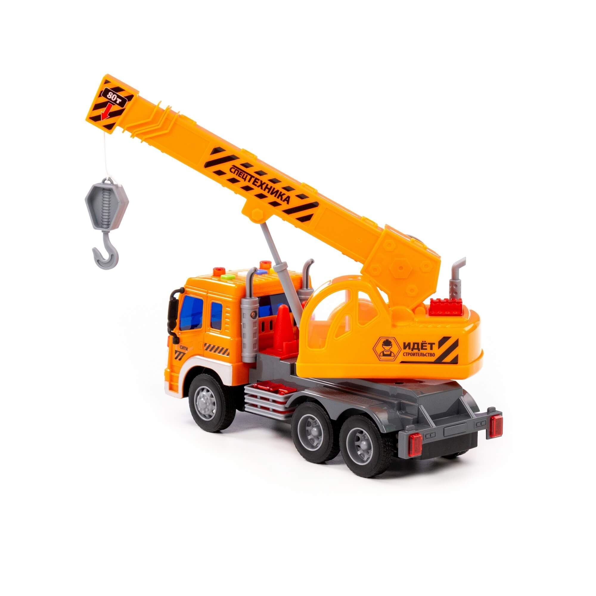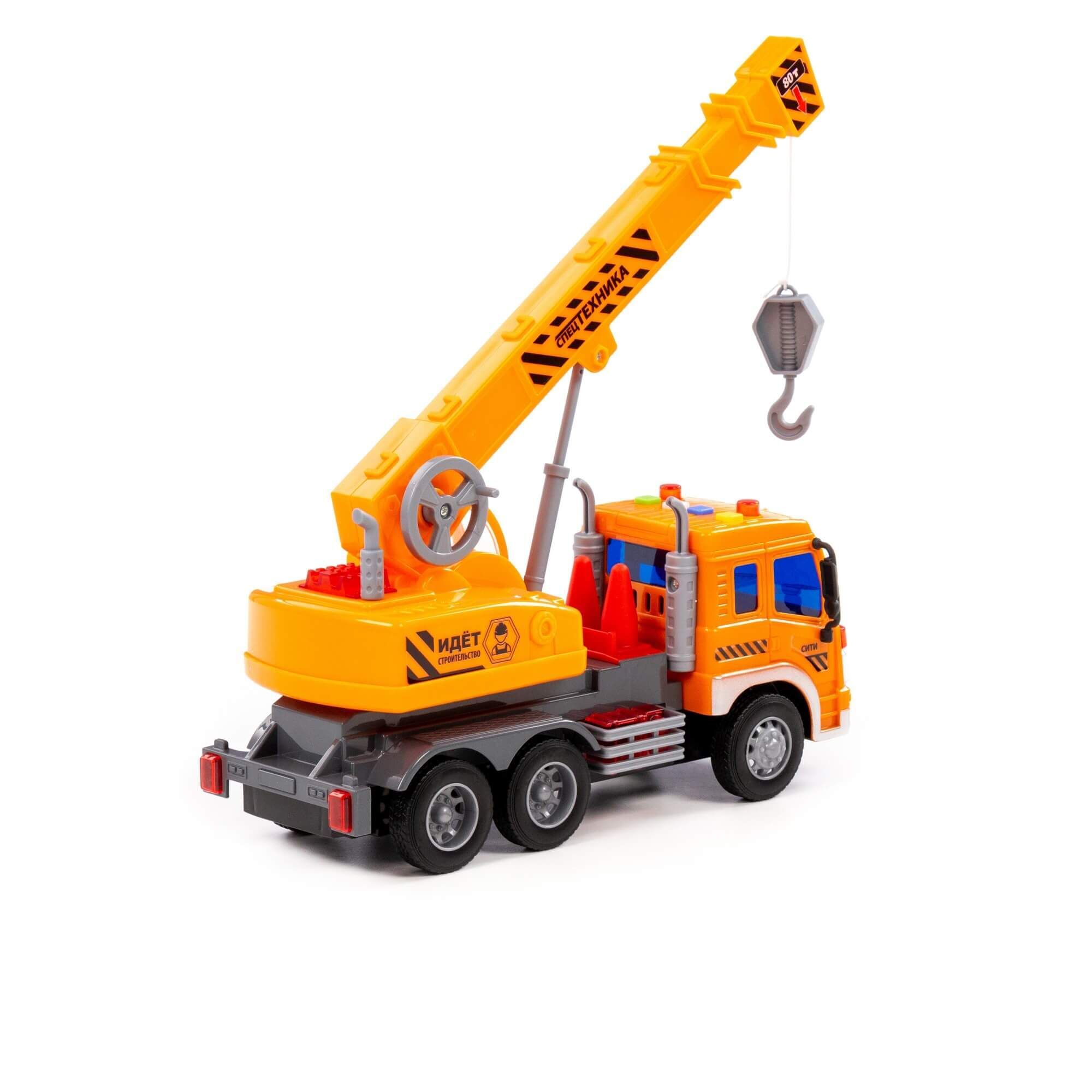 Автомобиль-кран инерционный «Сити» от фабрики «Полесье» - это качественная реалистичная игрушка, конструкция которой полностью повторяет дизайн настоящей техники. Спецмашина имеет три пары колёс на металлических осях, кроме того, она оснащена поворотной платформой с подвижным краном, который позволит придумывать различные сценарии игры. На кабине авто имеется 4 кнопки управления звуковыми и световыми эффектами.