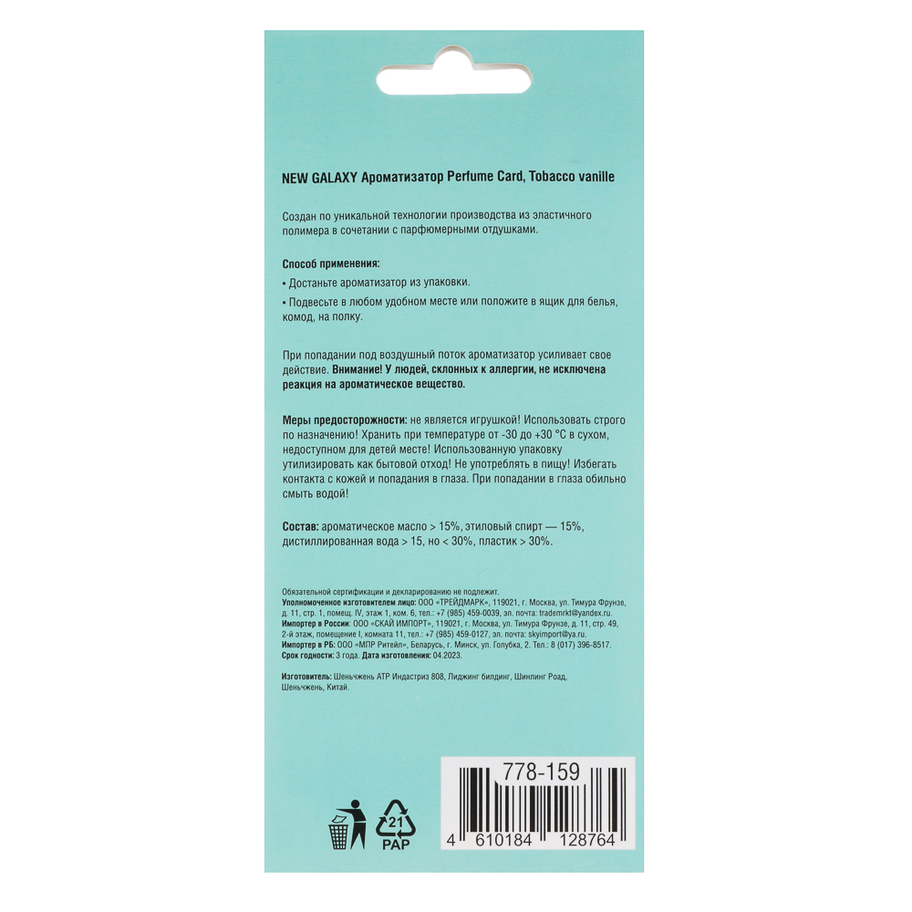 Ароматизаторы Perfume Card New Galaxy — это идеальное решение для создания уютной атмосферы в вашем доме и автомобиле. Они изготовлены из высококачественных материалов и наполнены нежными ароматами, вдохновлёнными популярными духами. Эти парфюмированные саше можно повесить на плечики для одежды в гардеробе или на внутреннее зеркало автомобиля, чтобы наполнить салон приятным ароматом. Они также идеально подходят для ароматизации ящиков с бельём, рубашками и полотенцами.
