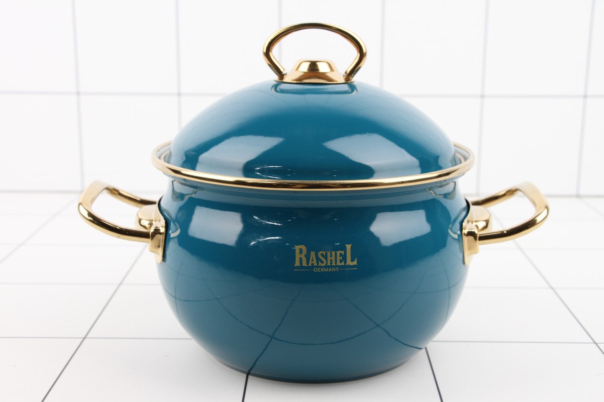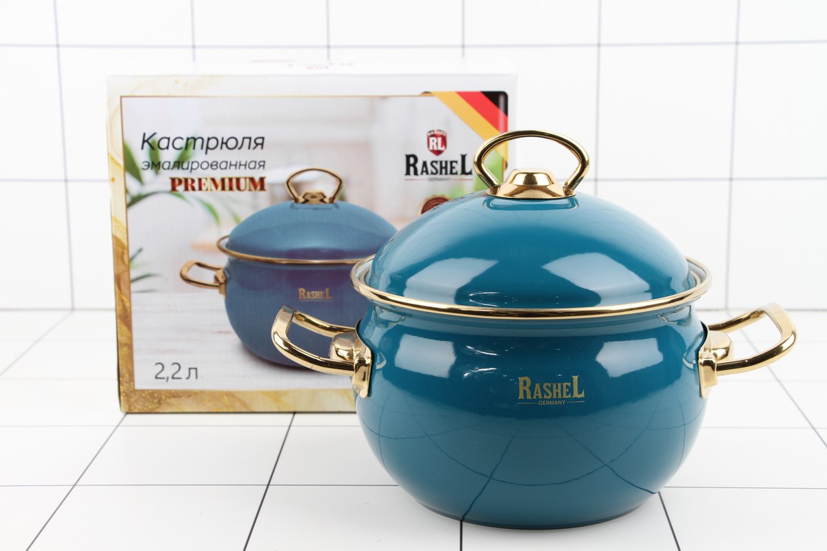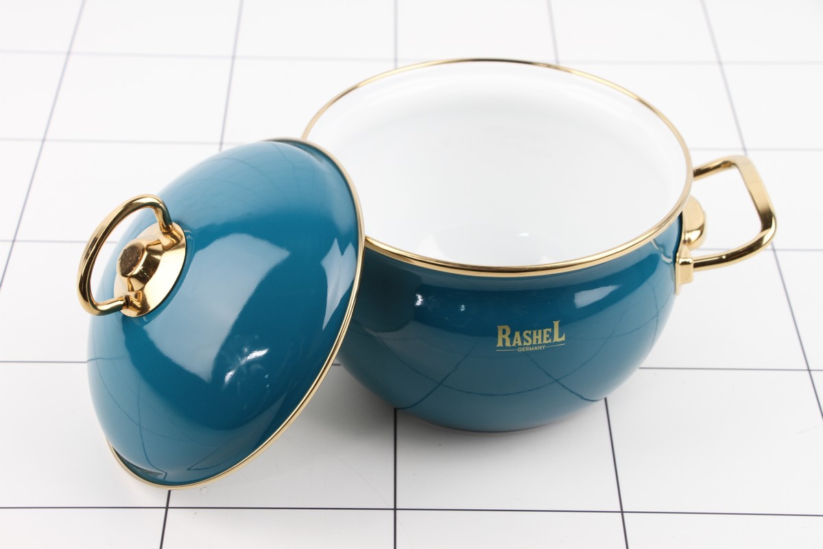 Кастрюля 2,2л эмалированная (бирюзовая) эмал. кр.; ручки золото - Объём кастрюли 2,2 л, d=16 см; - Ручки из нержавеющей стали 18/10; - Стальная эмалированная крышка; - Наружное и внутреннее трёхслойное глянцевое эмалированное покрытие; - Индивидуальная подарочная упаковка; - Подходит для всех видов плит, включая индукционные.