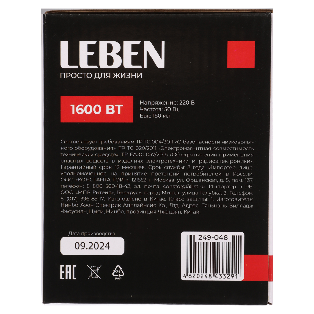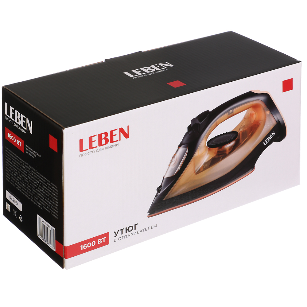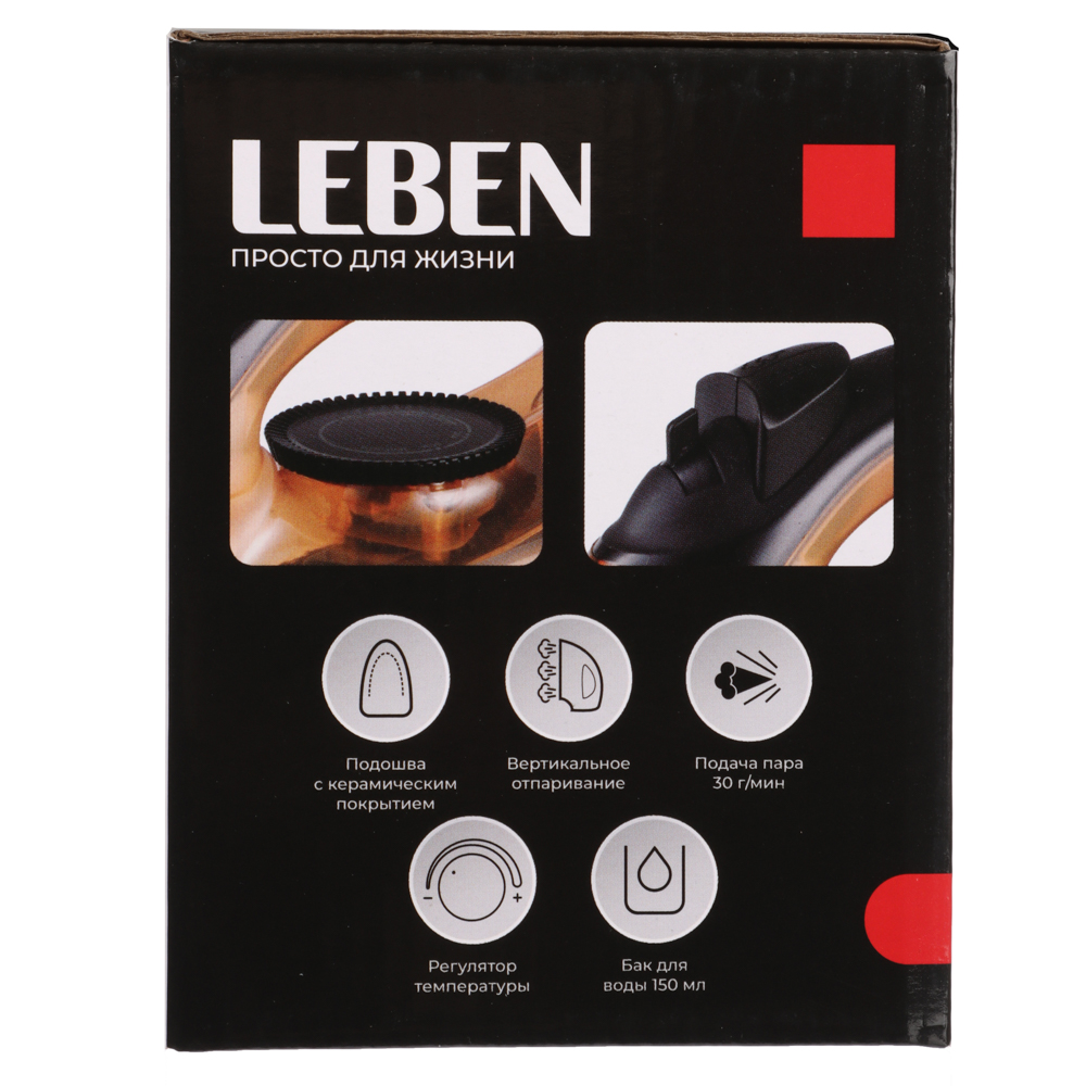 Утюг с отпаривателем LEBEN, 1600 Вт – это отличный выбор для повседневного использования. Утюг оснащен качественной подошвой с керамическим покрытием, которая легко и беспрепятственно скользит по любой ткани, быстро разглаживая все складки. Универсальная форма подходит для глажения постельного белья, рубашек и любых других вещей. Функция вертикального отпаривания с подачей пара 30 г/мин. эффективно разглаживает одежду прямо на вешалке, а также подходит для отпаривания штор и занавесок. Вращающийся регулятор температуры позволяет точно настраивать нужный режим для любых типов тканей. Объем бака для воды – 150 мл.