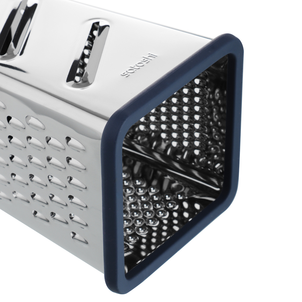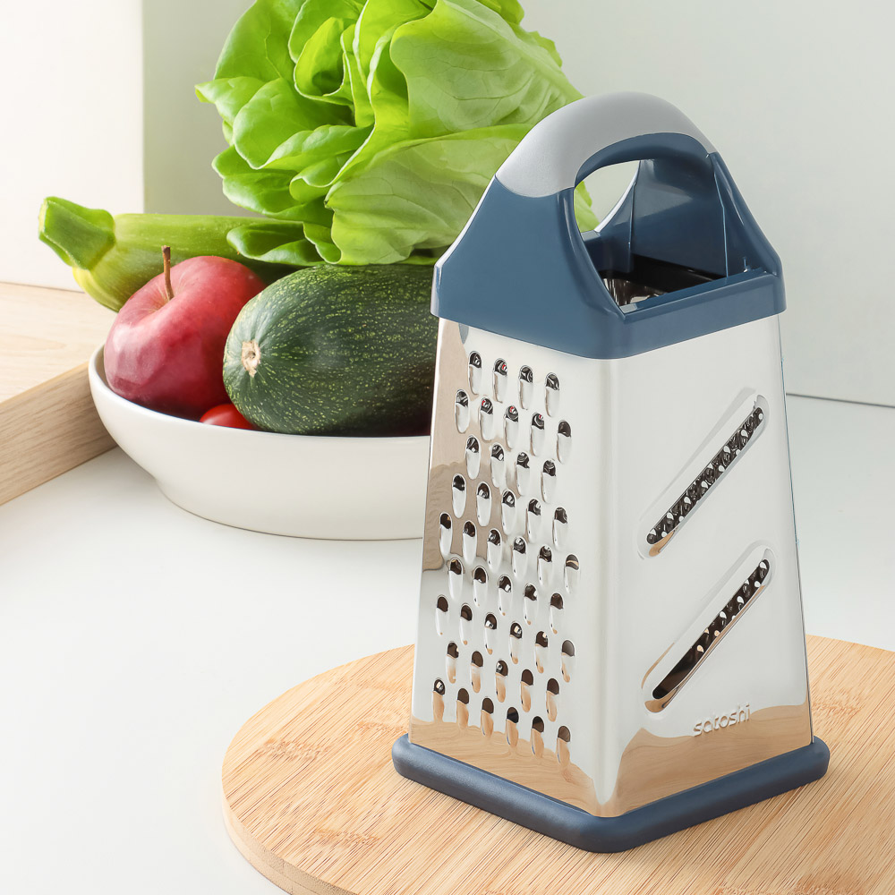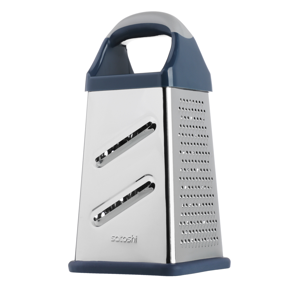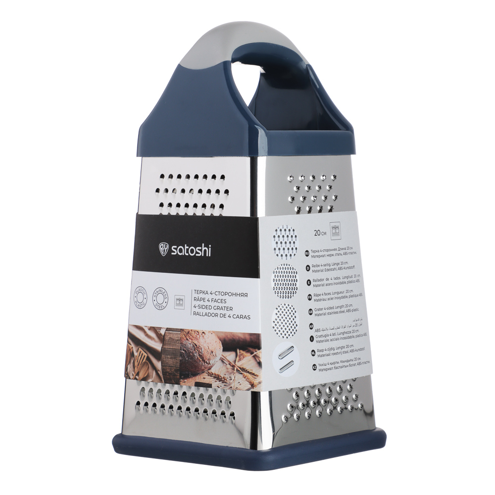 Терка SATOSHI «Ривьера» 4-х сторонняя – это незаменимый аксессуар на любой кухне. Имеет 4 полотна для измельчения продуктов, что позволяет натирать овощи и фрукты для приготовления салатов, супов и вторых блюд, а также драников. Нержавеющая сталь обладает высокими гигиеническими свойствами, не искажает вкус продуктов, легко моется и не накапливает бактерии и неприятные запахи. Пластиковая накладка на основании исключает образование царапин на поверхностях. Комфортная рукоятка обеспечивает крепкий и надежный хват. Дополняет коллекцию посуды для приготовления серии «Ривьера».