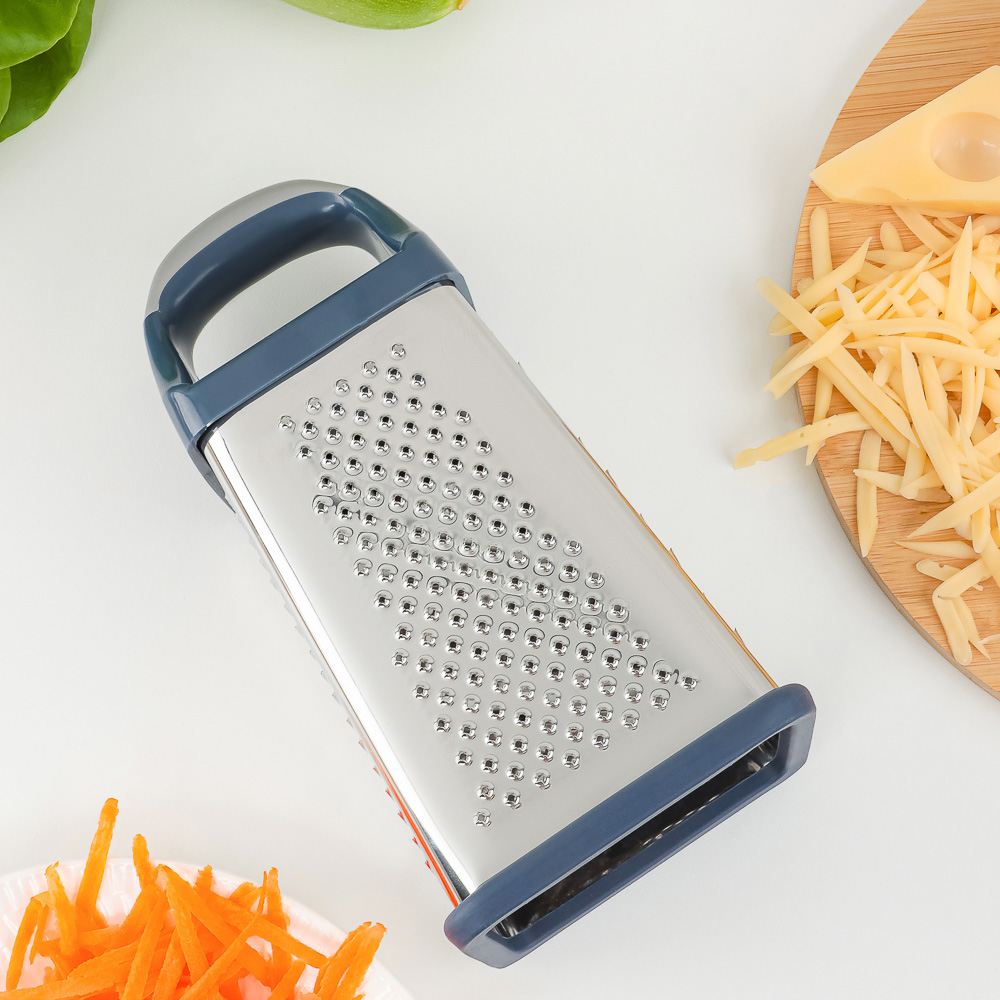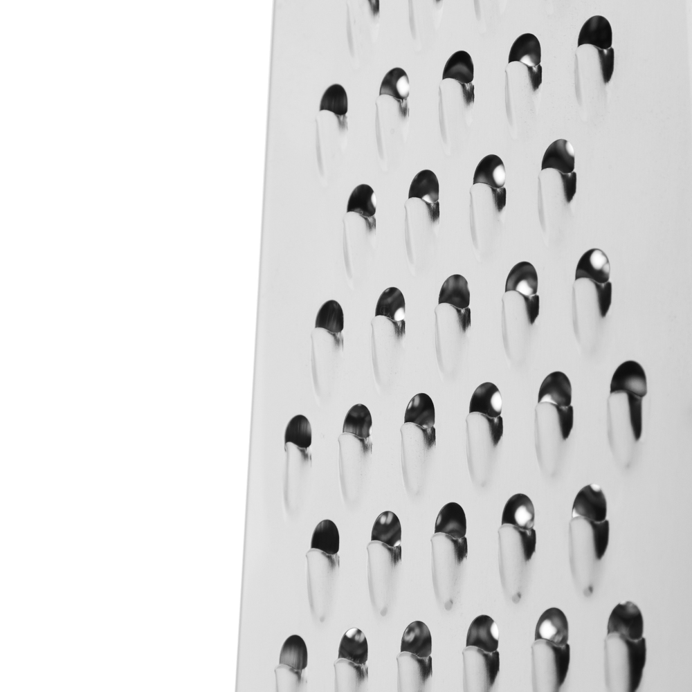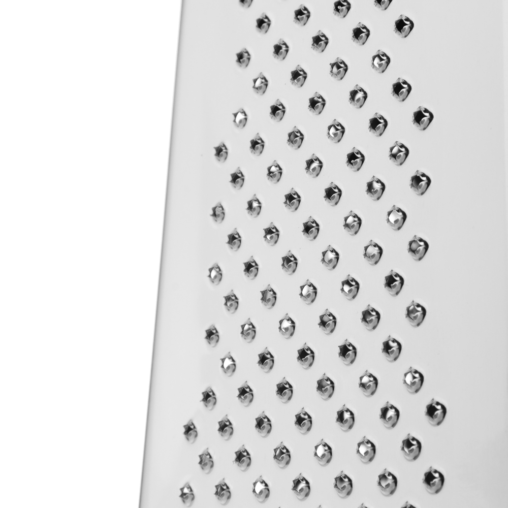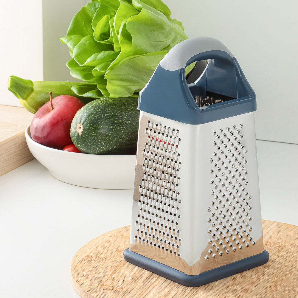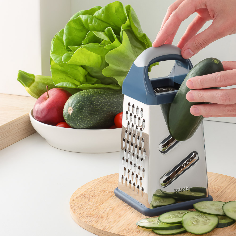 Терка SATOSHI «Ривьера» 4-х сторонняя – это незаменимый аксессуар на любой кухне. Имеет 4 полотна для измельчения продуктов, что позволяет натирать овощи и фрукты для приготовления салатов, супов и вторых блюд, а также драников. Нержавеющая сталь обладает высокими гигиеническими свойствами, не искажает вкус продуктов, легко моется и не накапливает бактерии и неприятные запахи. Пластиковая накладка на основании исключает образование царапин на поверхностях. Комфортная рукоятка обеспечивает крепкий и надежный хват. Дополняет коллекцию посуды для приготовления серии «Ривьера».