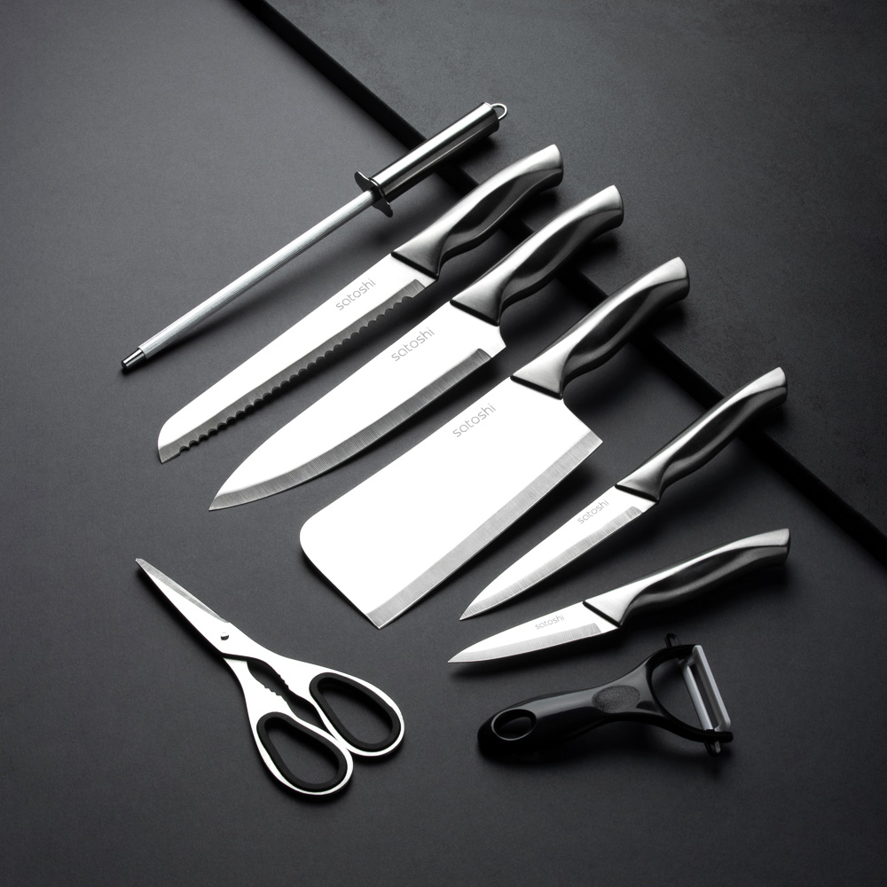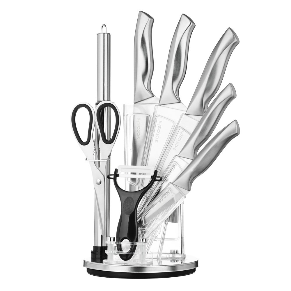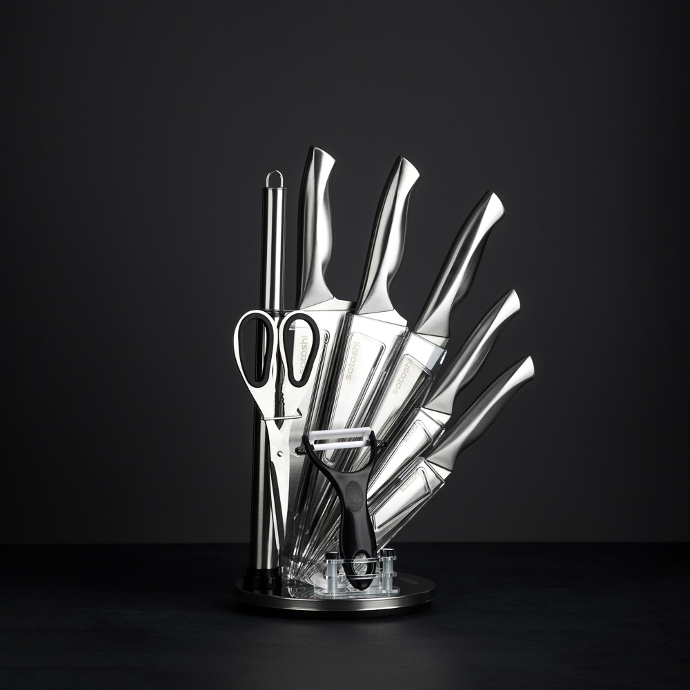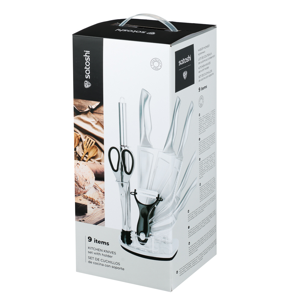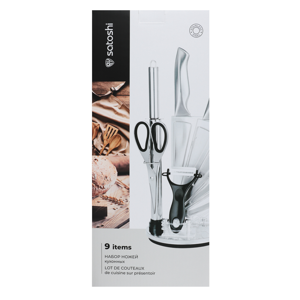 Набор SATOSHI Морель включает 4 ножа, топор кухонный, мусат, ножницы, овощечистку и подставку. Кухонный топор с длиной клинка 16,5 см идеально подходит для разделки мяса и работы с крупными продуктами. Нож шеф с длиной лезвия 20 см предназначен для нарезки, шинковки и других основных кухонных задач. Нож для хлеба с зубчатым лезвием 20 см обеспечивает аккуратную нарезку даже самых мягких и хрустящих продуктов. Небольшой универсальный нож 12,7 см подходит для нарезки овощей, фруктов и других ингредиентов, а овощной нож с лезвием 9 см идеален для точной работы с мелкими продуктами. В набор также входят кухонные ножницы для резки зелени, упаковок и других задач, мусат для заточки ножей, поддерживающий остроту лезвий, и удобная овощечистка для быстрой очистки овощей и фруктов. Все ножи и инструменты размещаются на акриловой подставке, которая обеспечивает удобное хранение и эстетичный вид на кухне. Лезвия из нержавеющей стали имеют острую заводскую заточку, не подвержены коррозии.