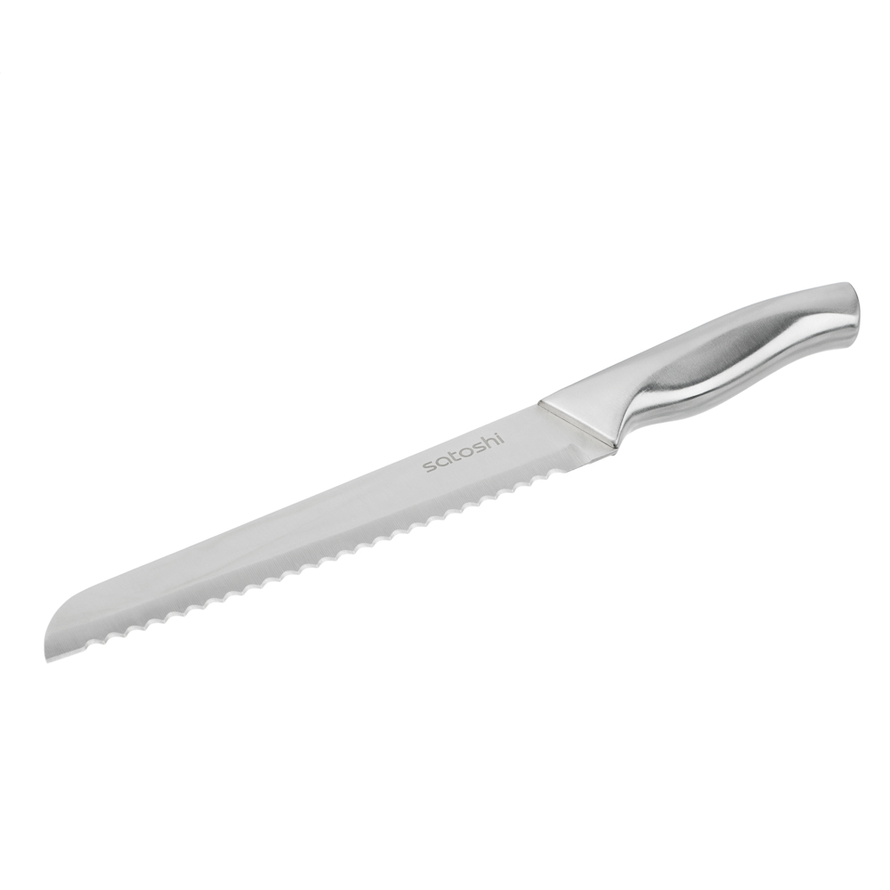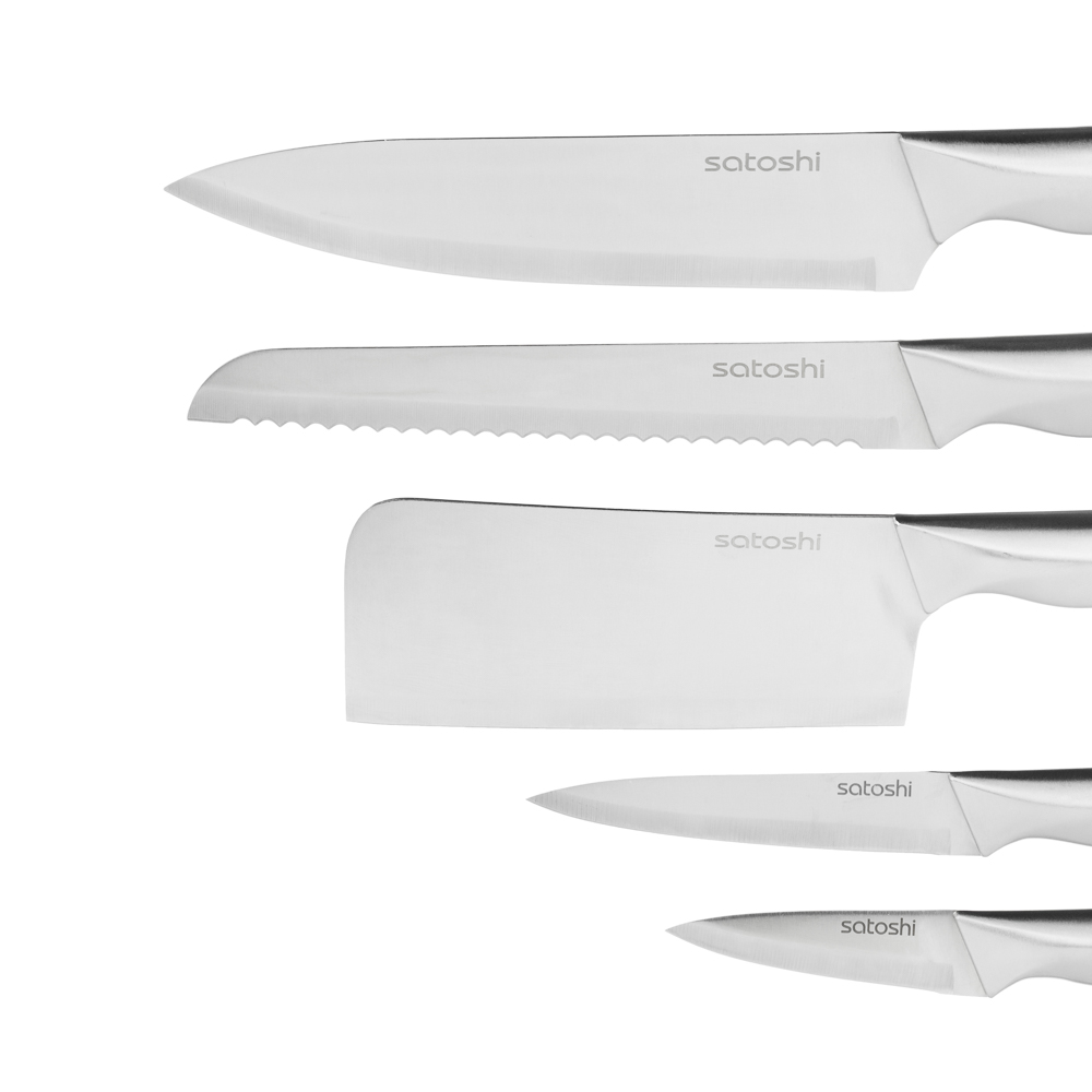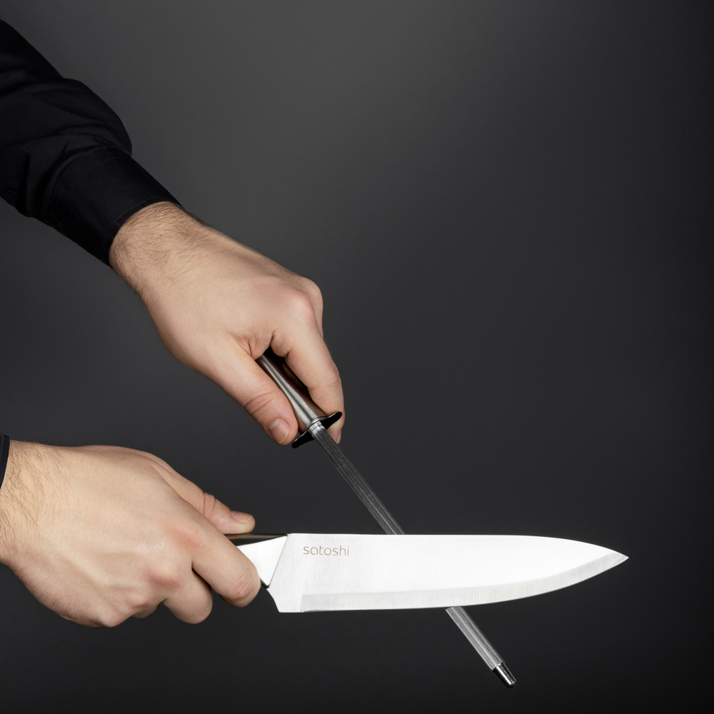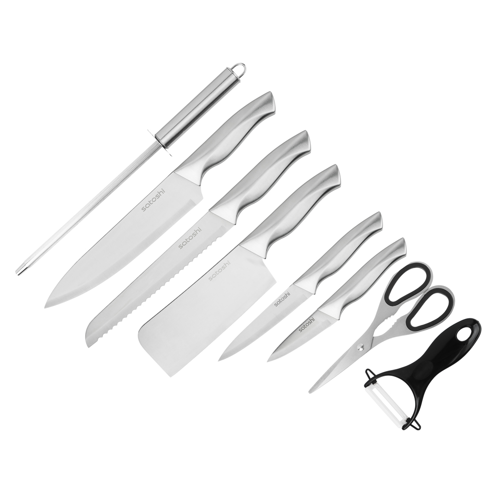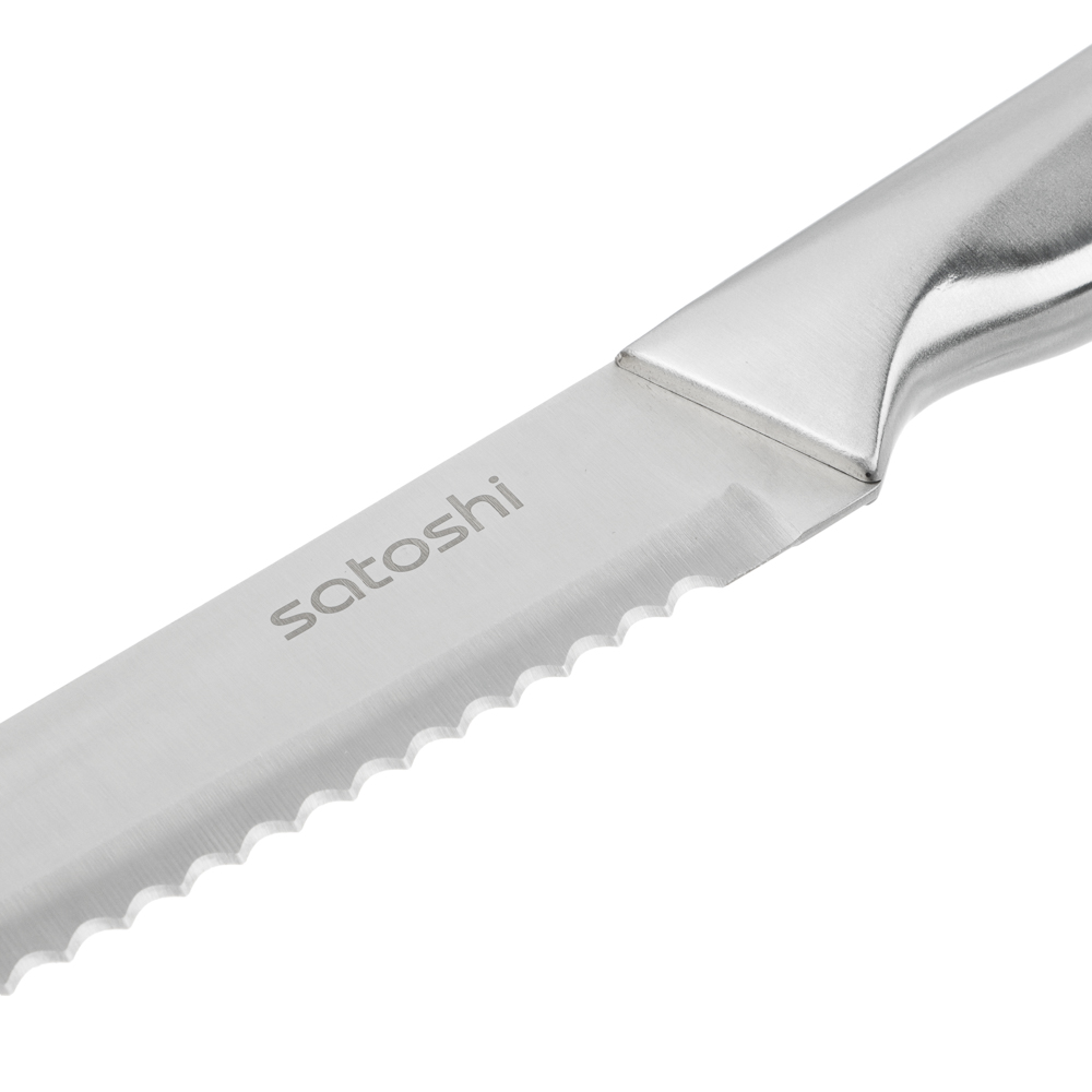 Набор SATOSHI Морель включает 4 ножа, топор кухонный, мусат, ножницы, овощечистку и подставку. Кухонный топор с длиной клинка 16,5 см идеально подходит для разделки мяса и работы с крупными продуктами. Нож шеф с длиной лезвия 20 см предназначен для нарезки, шинковки и других основных кухонных задач. Нож для хлеба с зубчатым лезвием 20 см обеспечивает аккуратную нарезку даже самых мягких и хрустящих продуктов. Небольшой универсальный нож 12,7 см подходит для нарезки овощей, фруктов и других ингредиентов, а овощной нож с лезвием 9 см идеален для точной работы с мелкими продуктами. В набор также входят кухонные ножницы для резки зелени, упаковок и других задач, мусат для заточки ножей, поддерживающий остроту лезвий, и удобная овощечистка для быстрой очистки овощей и фруктов. Все ножи и инструменты размещаются на акриловой подставке, которая обеспечивает удобное хранение и эстетичный вид на кухне. Лезвия из нержавеющей стали имеют острую заводскую заточку, не подвержены коррозии.