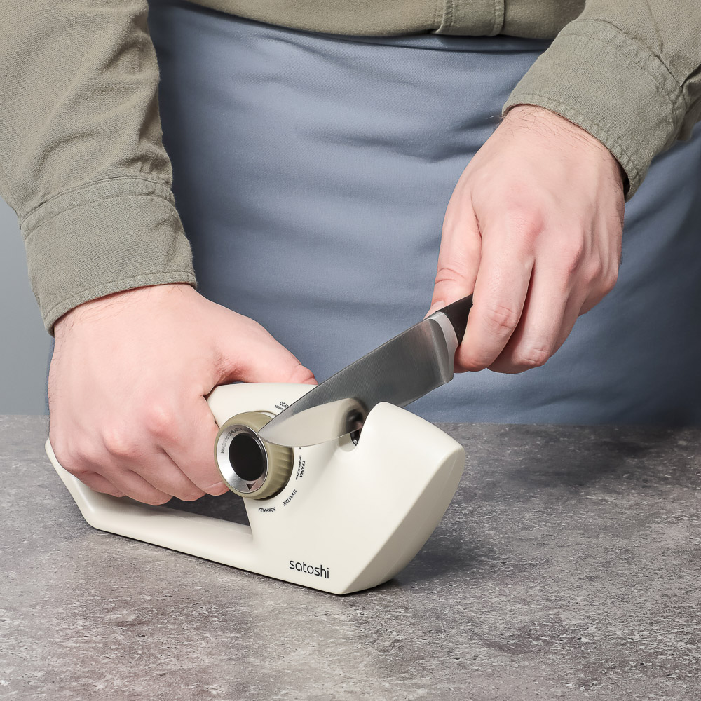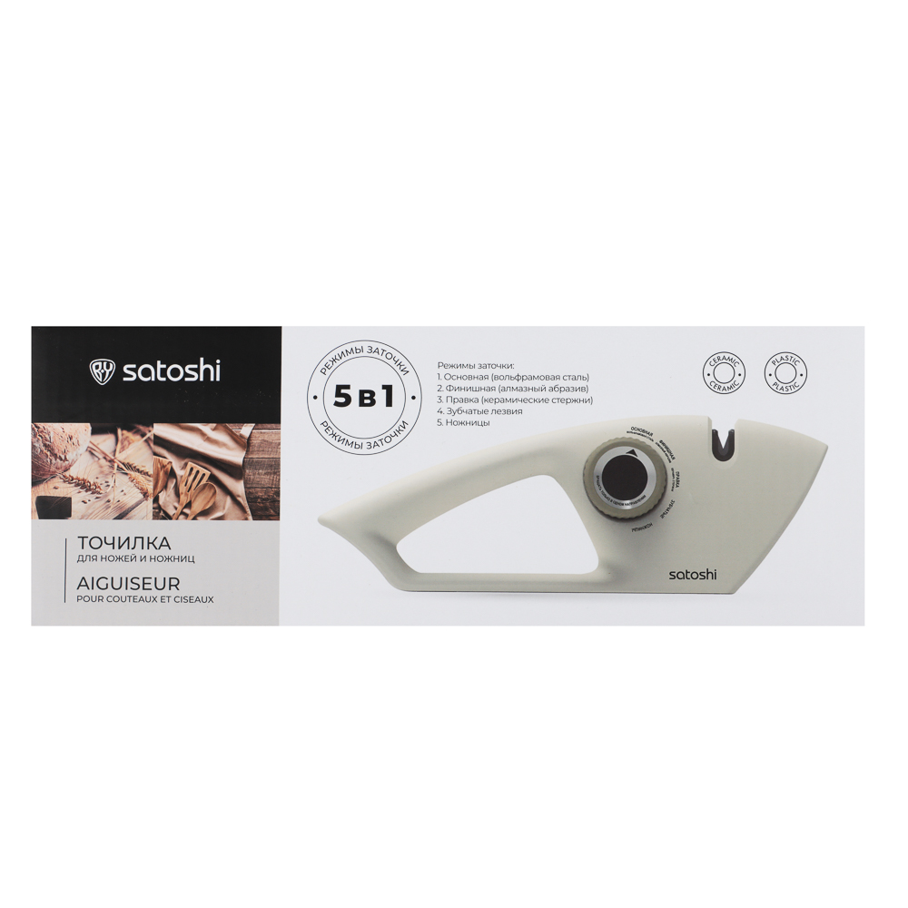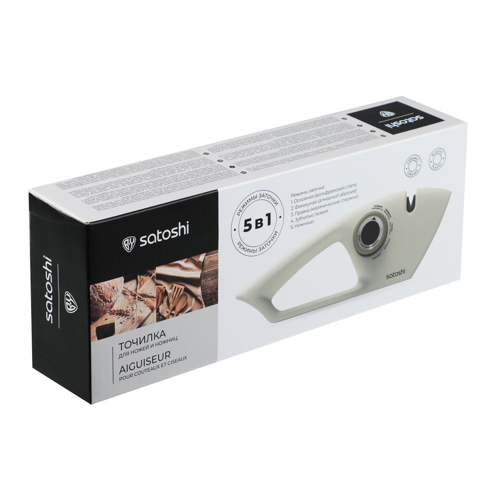 Точилка для ножей и ножниц SATOSHI Бланка 5 в 1 — это универсальное и многофункциональное устройство, предназначенное для заточки и правки различных типов лезвий. Точилка оснащена пятью режимами работы: основной заточкой с использованием вольфрамовой стали для восстановления остроты лезвий, финишной заточкой с алмазным абразивом для полировки и доводки до идеальной остроты, правкой с керамическими стержнями для выравнивания кромки и удаления заусенцев, а также специальными режимами для заточки зубчатых лезвий и ножниц. Устройство подходит для заточки кухонных ножей, ножниц и лезвий с зубчатым краем. Имеет противоскользящую поверхность, которая обеспечивает устойчивость и безопасность во время использования, а также стабильный угол заточки, что гарантирует равномерную обработку лезвий. Эргономичная ручка делает использование удобным и комфортным. Корпус точилки выполнен из прочного и легкого полипропилена.