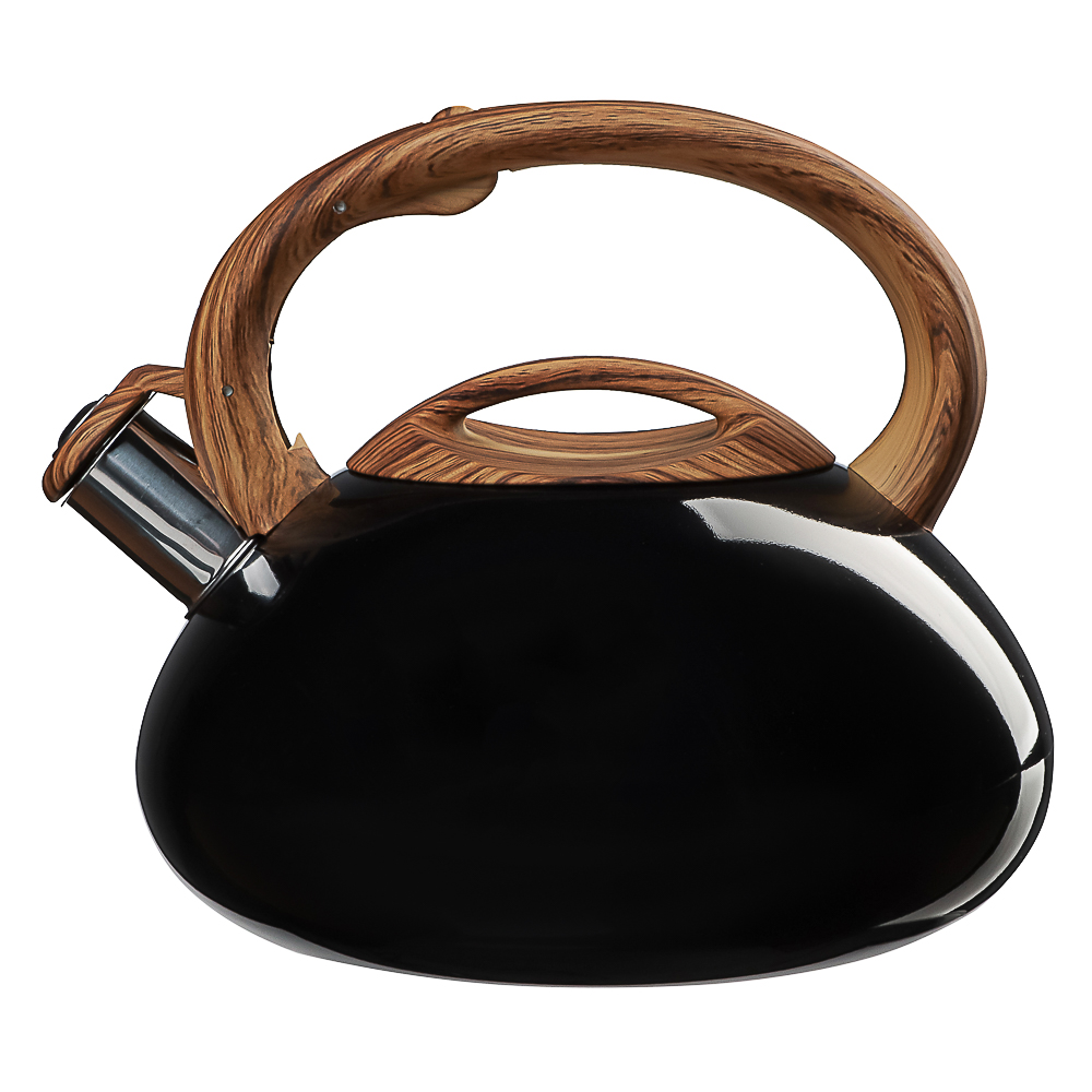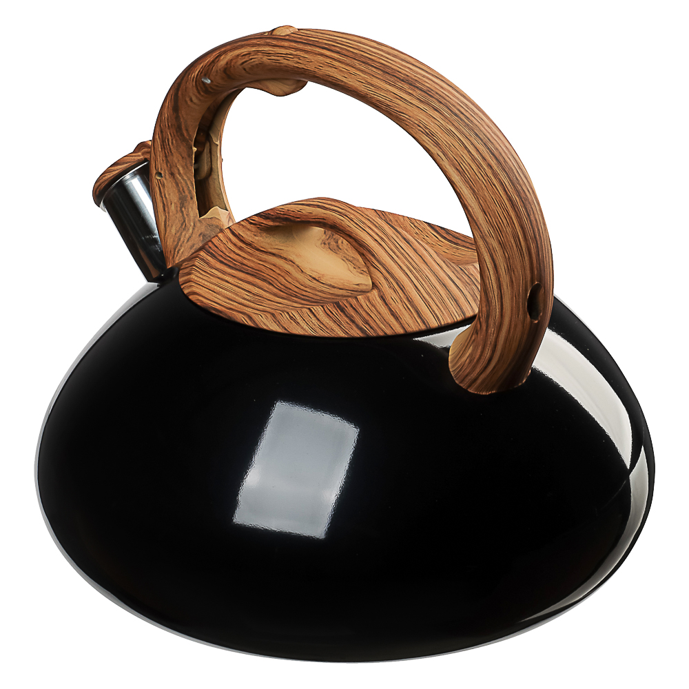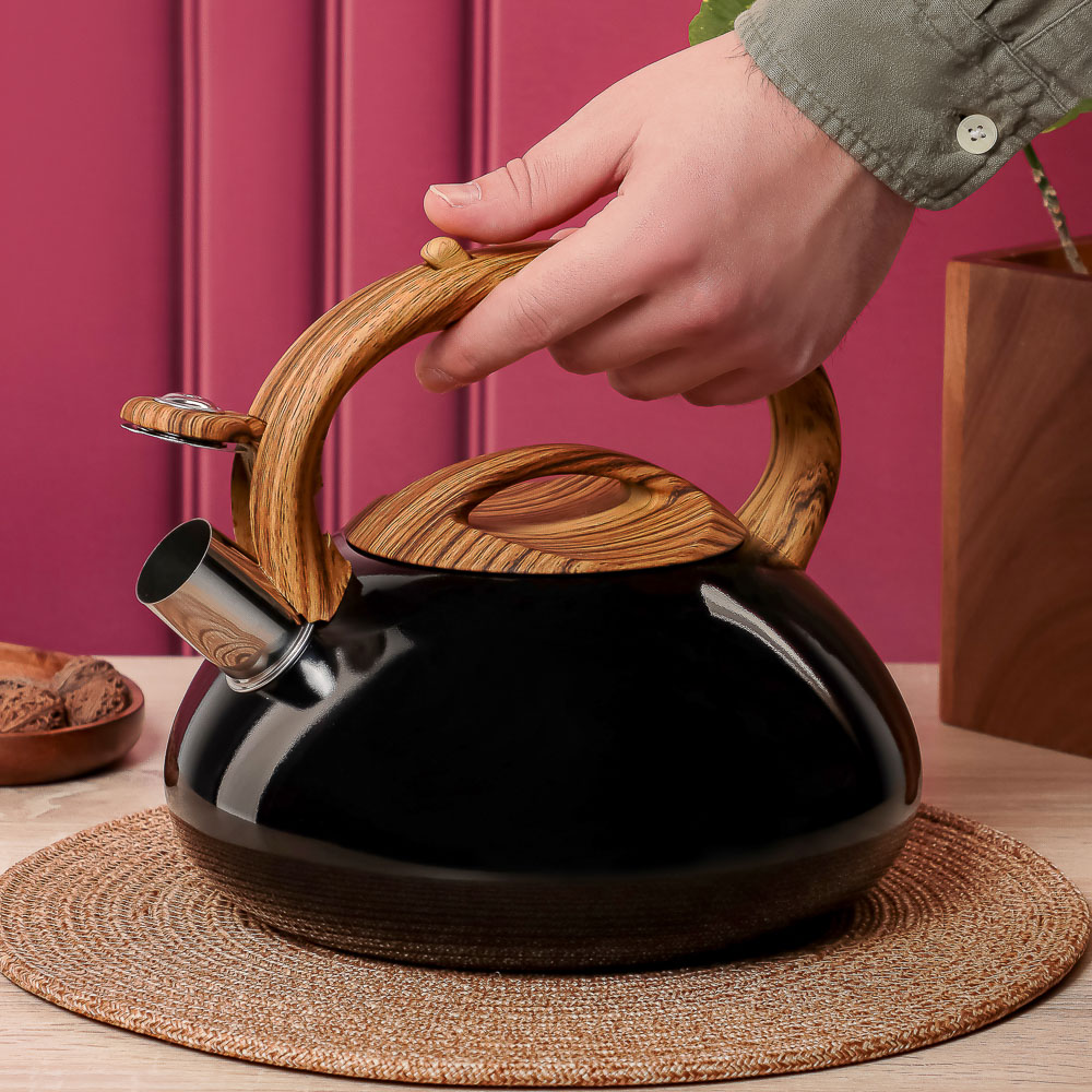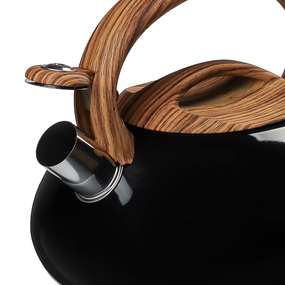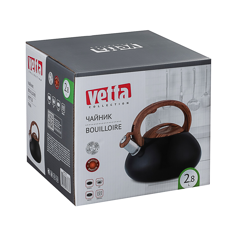 Чайник стальной VETTA "Лоренцо", объем 2,8 л станет настоящим украшением современной кухни. Стильный дизайн в черном цвете с ненагревающейся бакелитовой ручкой с фактурой «под дерево» гармонично впишется в интерьер, добавляя эстетики в окружающую обстановку. Толстые стенки и дно не деформируются и хорошо удерживают тепло. Качественная сталь не боится коррозии и не изменяет вкус воды. Свисток оснащен специальным механизмом для фиксации в открытом положении. Правильная форма носика исключает попадание воды мимо чашки. Подходит для всех типов плит, включая индукцию.