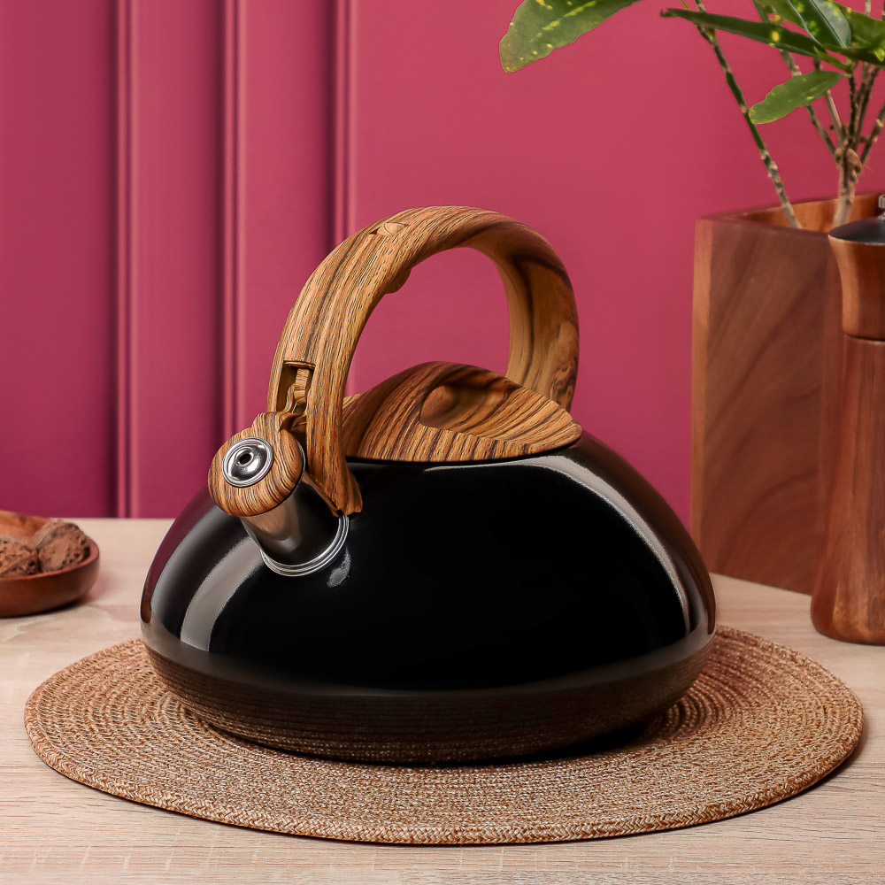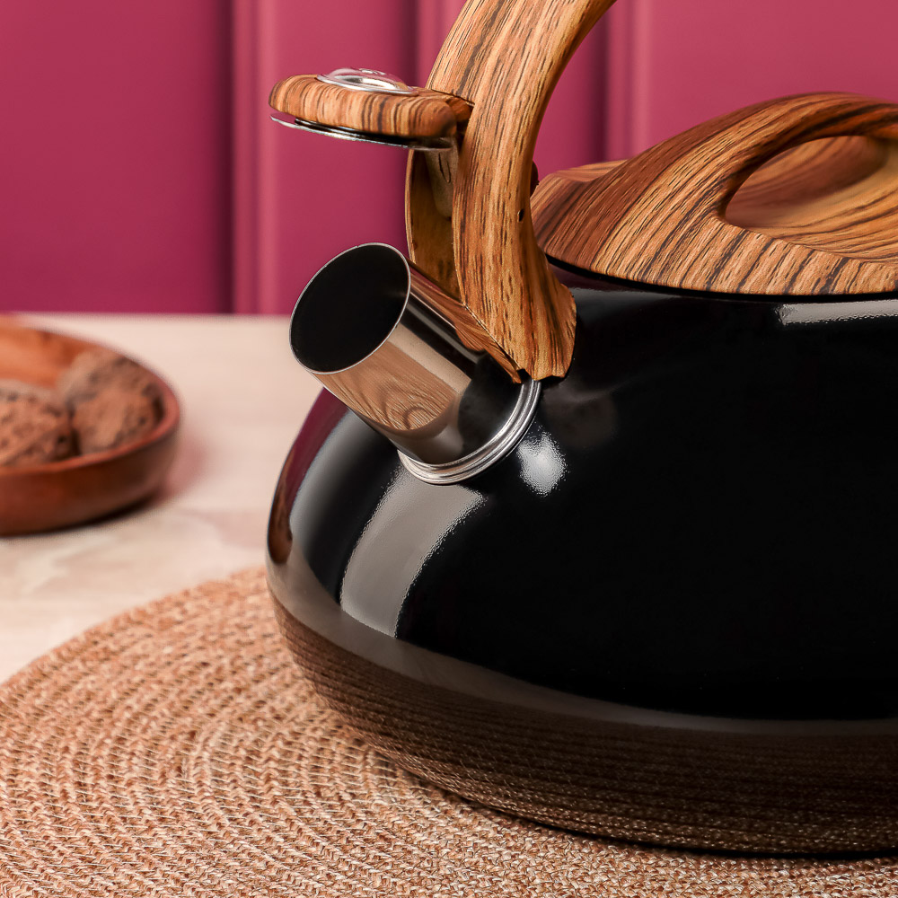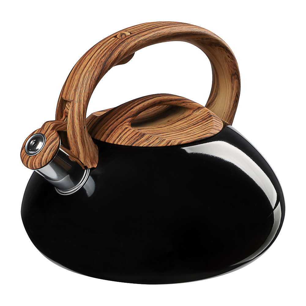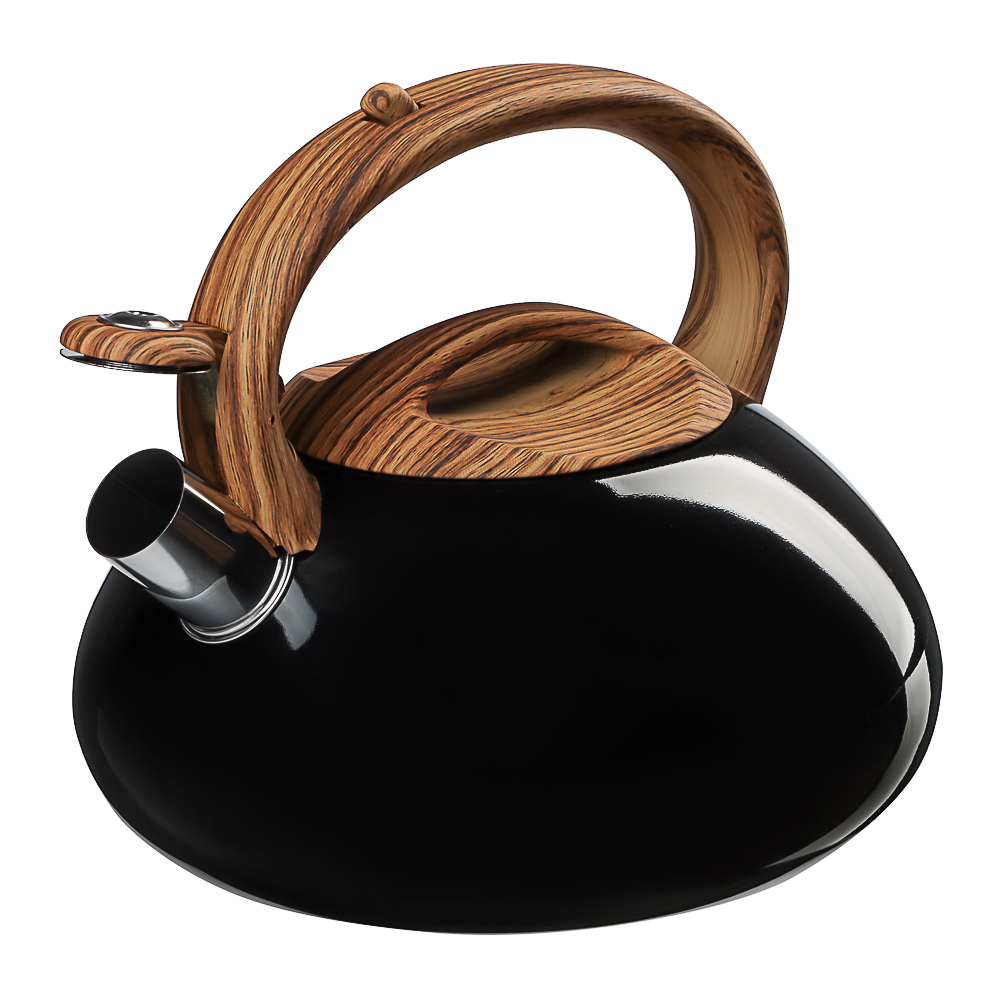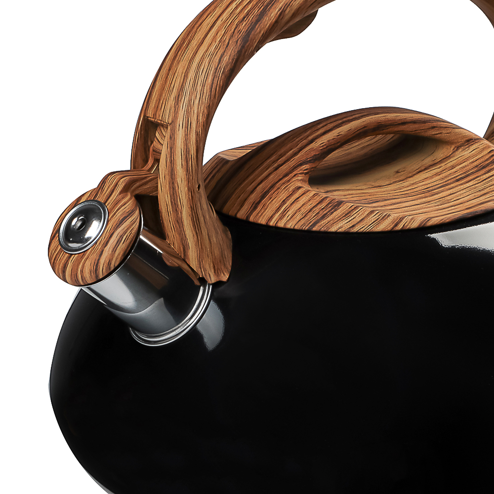 Чайник стальной VETTA "Лоренцо", объем 2,8 л станет настоящим украшением современной кухни. Стильный дизайн в черном цвете с ненагревающейся бакелитовой ручкой с фактурой «под дерево» гармонично впишется в интерьер, добавляя эстетики в окружающую обстановку. Толстые стенки и дно не деформируются и хорошо удерживают тепло. Качественная сталь не боится коррозии и не изменяет вкус воды. Свисток оснащен специальным механизмом для фиксации в открытом положении. Правильная форма носика исключает попадание воды мимо чашки. Подходит для всех типов плит, включая индукцию.