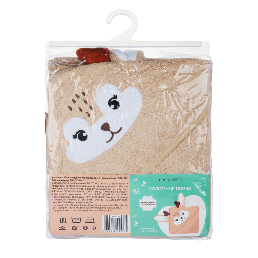 Махровое полотенце-пончо с капюшоном PROVANCE 105х105 см бережно позаботится о нежной коже малыша, подарит комфорт и тепло и быстро впитает всю лишнюю влагу. Капюшон с забавным дизайном защитит голову и уши малыша от холода после купания. Плюшевый тактильно приятный материал на 80% состоит из полиэстера и на 20% из полиамида. Обладает отличными впитывающими свойствами и не оставляет ворсинок на теле. Полотенце легко отстирывается, не линяет, не деформируется и не покрывается катышками. Дизайн в ассортименте.