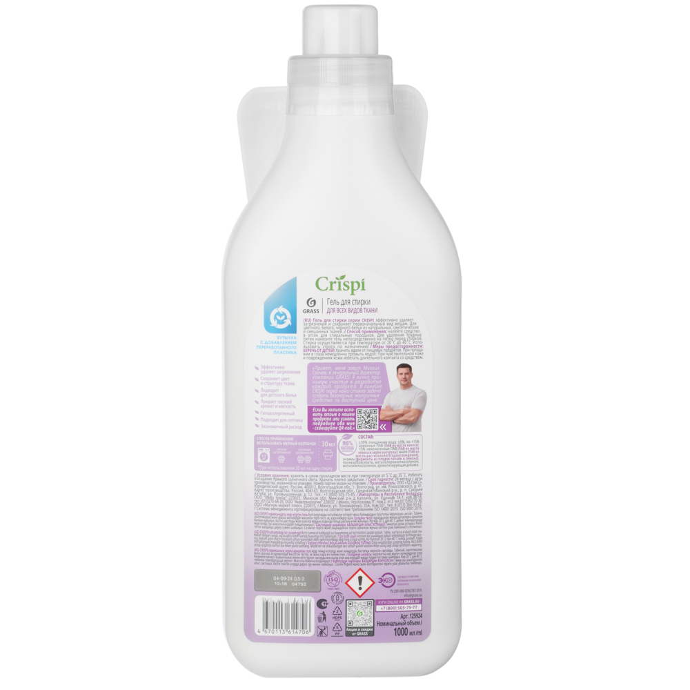 Гель концентрат для стирки GRASS «CRISPI» для всех видов тканей – это гипоаллергенное средство для стирки, которое эффективно справляется с загрязнениями, сохраняя первоначальный вид, форму и насыщенность цвета. Сохраняет структуру ткани, подходит для детского белья. Придает белью свежий аромат и небывалую мягкость. Экологичное средство на 96% состоит из натуральных компонентов: ПАВ на основе растительных масел и ферментов из плодов папайи и лимона. Средство имеет удобный дозатор-колпачок. Одной упаковки 1 л хватает на 33 стирки.