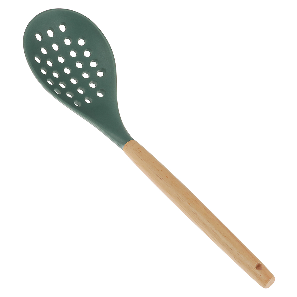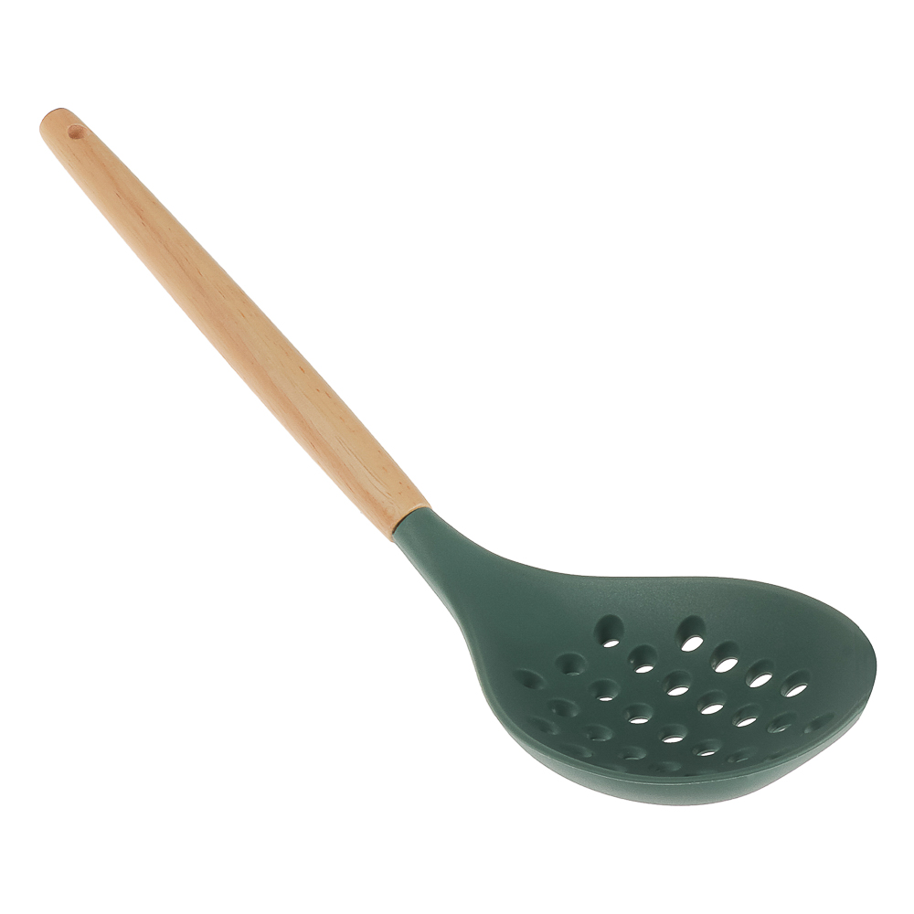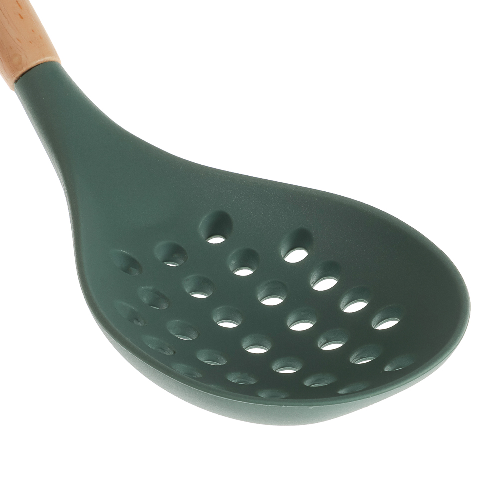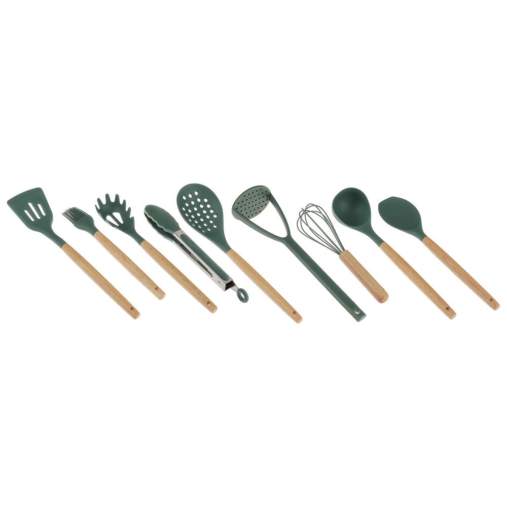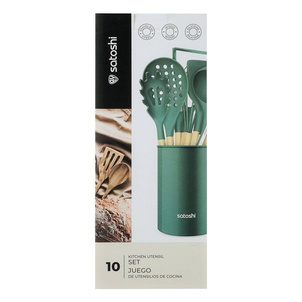 Набор кухонных принадлежностей SATOSHI Эрно — практичный и стильный комплект для кухни, выполненный в зеленом цвете с деревянными ручками. Набор включает 10 предметов из термостойкого силикона, безопасного для посуды с антипригарным покрытием: толкушку для картофеля, поварскую ложку, щипцы, ложку для спагетти, половник, лопатку с прорезями, кулинарную кисточку, подставку, венчик и ложку с прорезями. Деревянные ручки обеспечивают удобство использования, добавляя приятные тактильные ощущения и надежный хват. Они легкие, экологичные и придают инструментам дополнительную прочность, делая процесс готовки более комфортным.