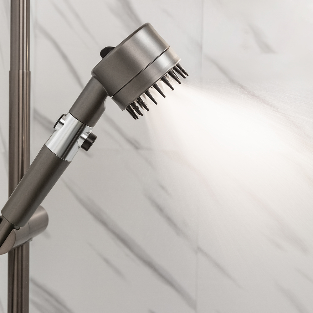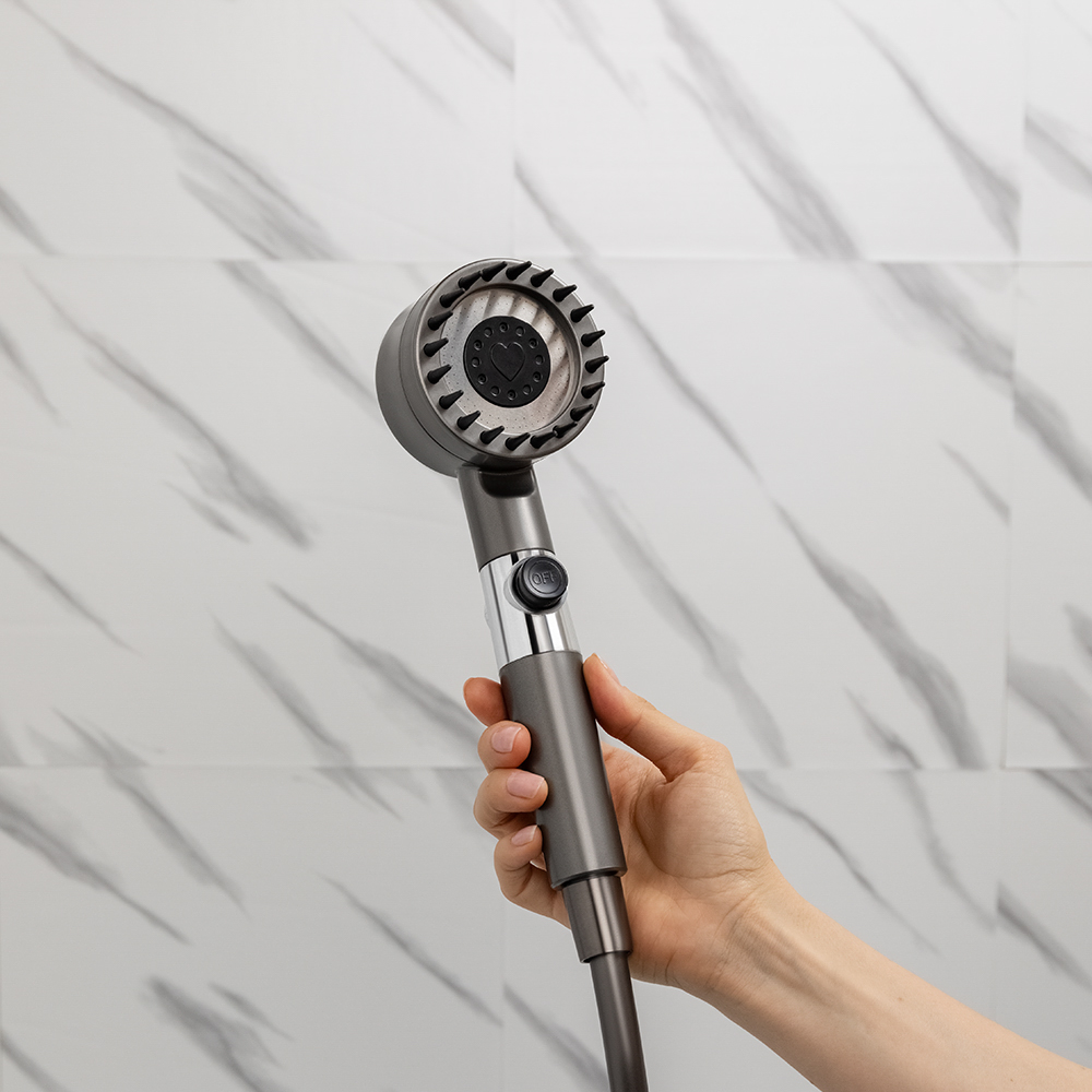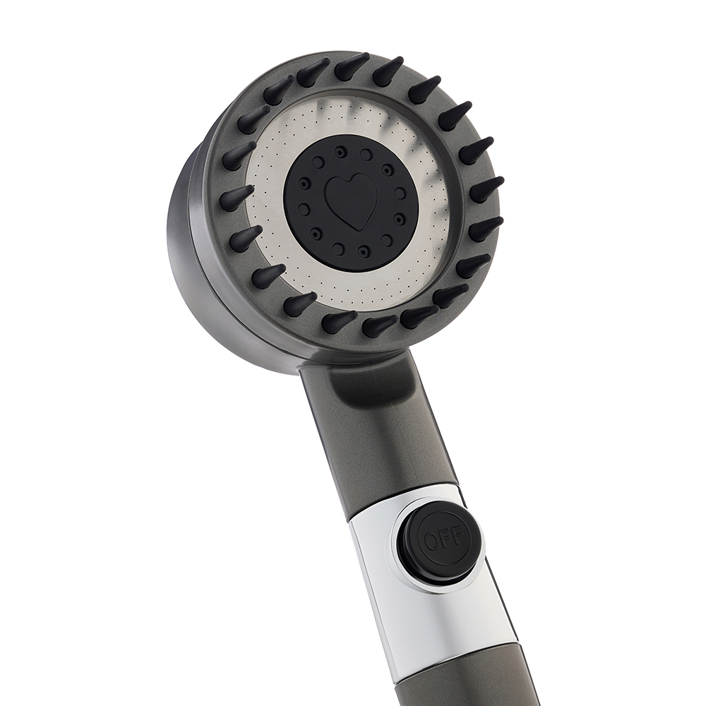 Лейка для душа с массажным эффектом со встроенным фильтром для очистки воды – это душевая насадка диаметром 80 мм со съемной головкой для удобства очистки. Имеет стильный современный дизайн графитового цвета с качественным стойким покрытием, которое легко очищается от отложений и не подвержено царапинам. Пользователь оценит продуманное и удобное управление. Кнопка включения/выключения располагается прямо на корпусе. Регулятор настройки режима находится в верхней части лейки. Предусмотрено 3 режима работы: стандартный, мягкий и смешанный. Специальная конструкция обеспечивает комфортный напор даже при низком давлении воды. Массажные зубчики на корпусе для мягкого массажа волосистой части головы подарят неповторимые ощущения и максимальное расслабление.